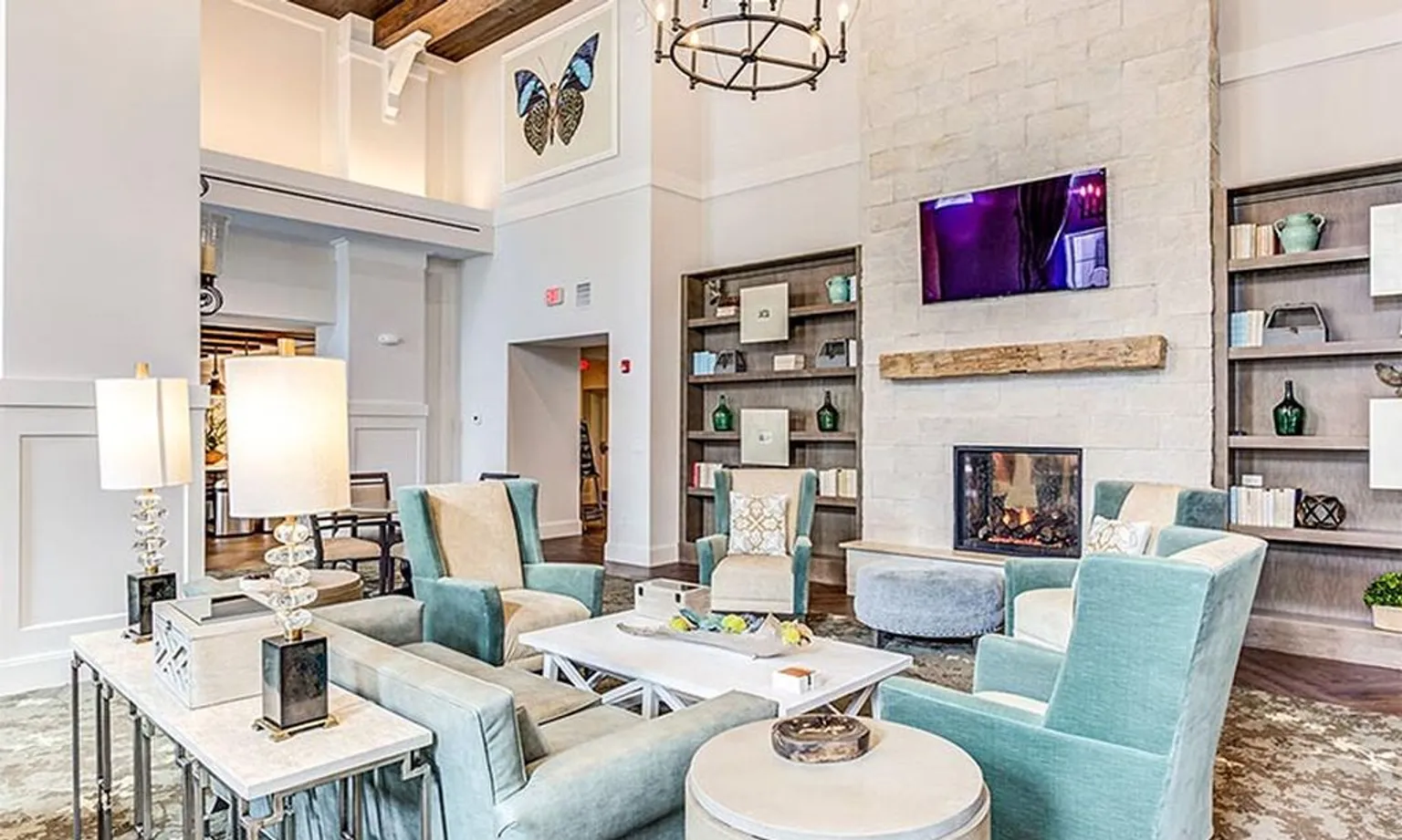Residents at Everleigh Naperville have access to a large, modern clubroom that includes a great room with high ceilings, a fireplace, and plenty of seating. There’s also a bistro and a private dining room. The fitness studio includes space for yoga, and there’s also a creative studio, a media lounge, and a library.