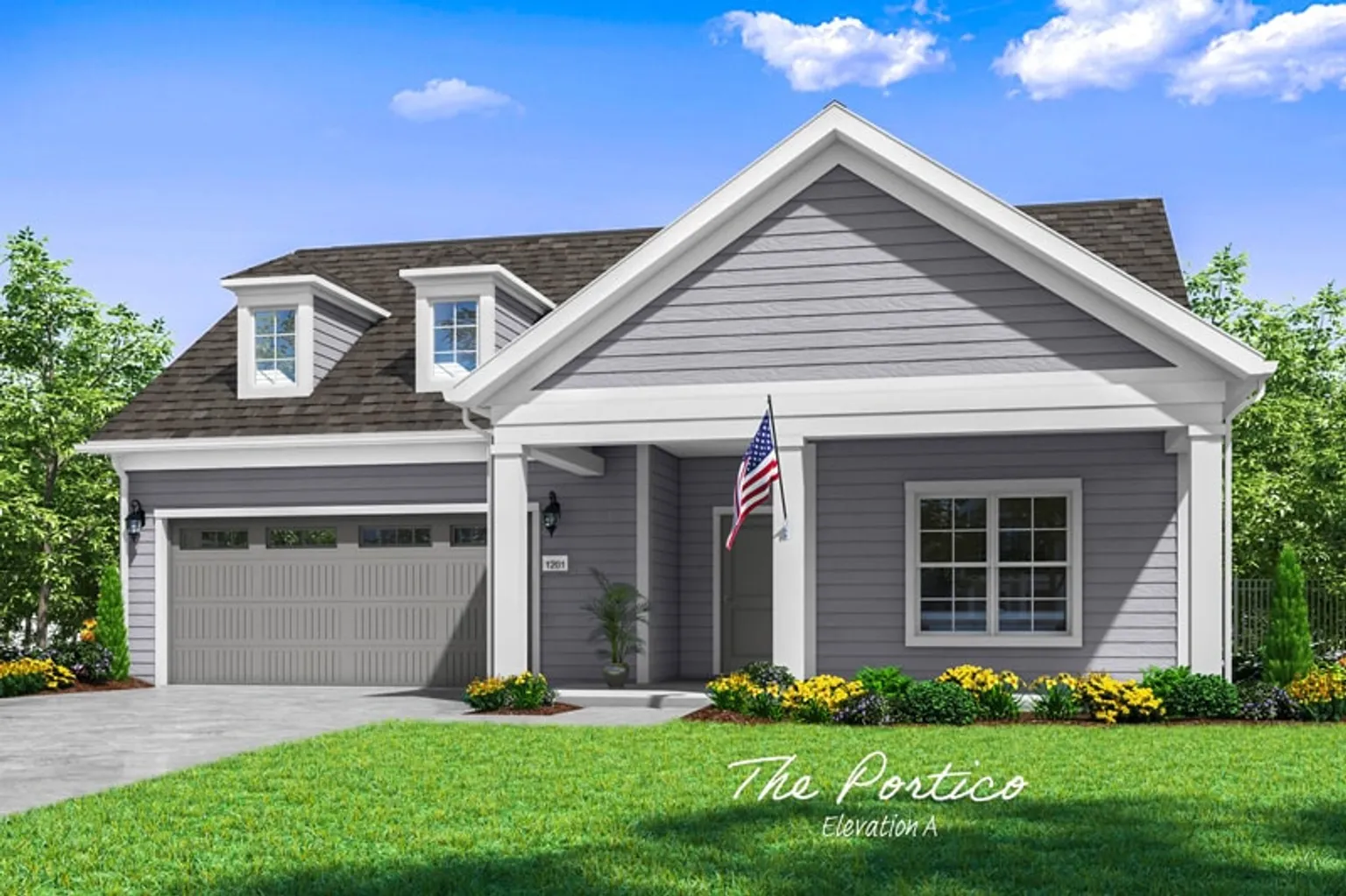 The Portico has 1,776 to 2,468 square feet, two to three bedrooms, and two or three bathrooms. The kitchen includes a large island that accommodates seating and there’s a separate dining room.