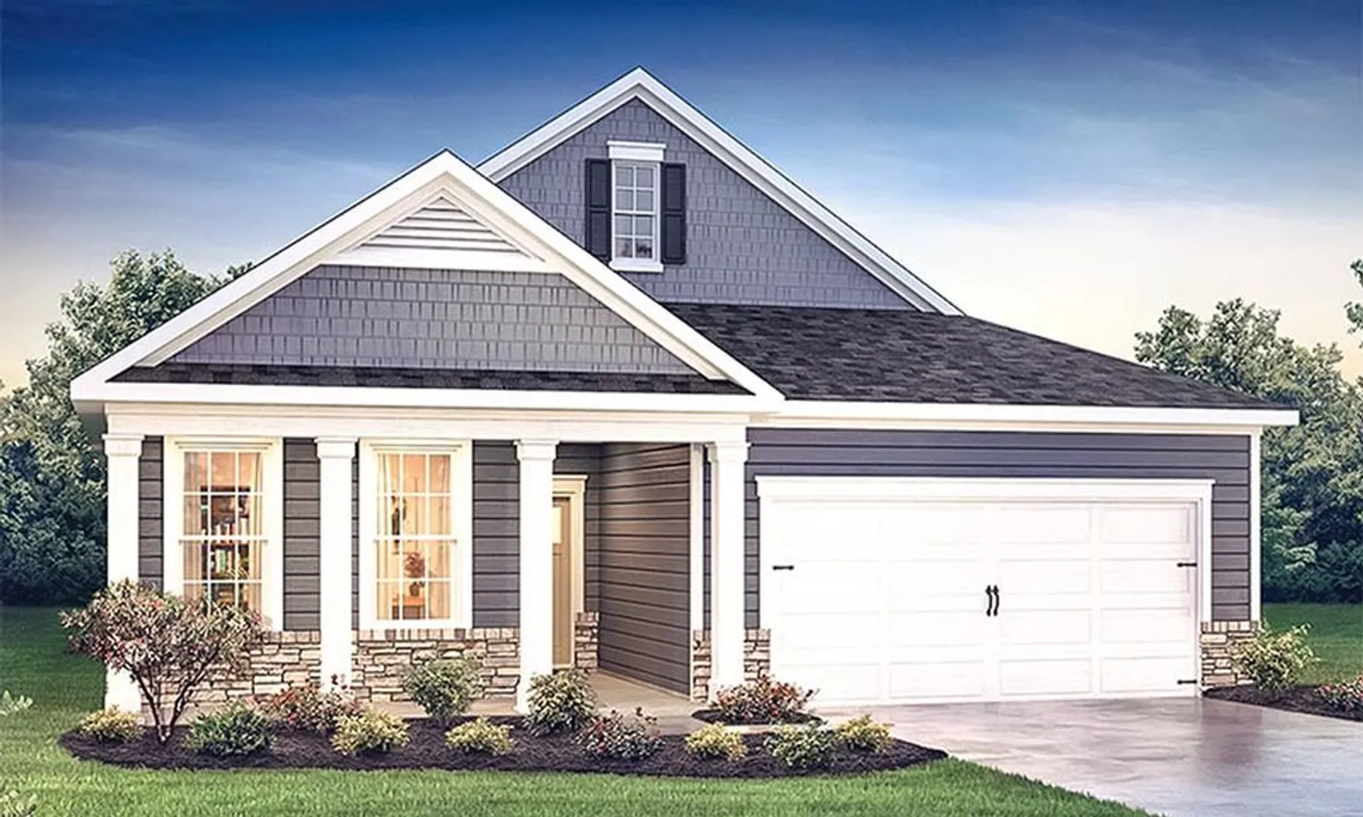 The Arlington is a 1,664-square-foot model with three to four bedrooms, two to three bathrooms, and an attached two-car garage. Homes feature two large bedrooms, a laundry room, and an open kitchen on the main floor. A walk-in closet, covered porch, and optional loft are also offered with this model.