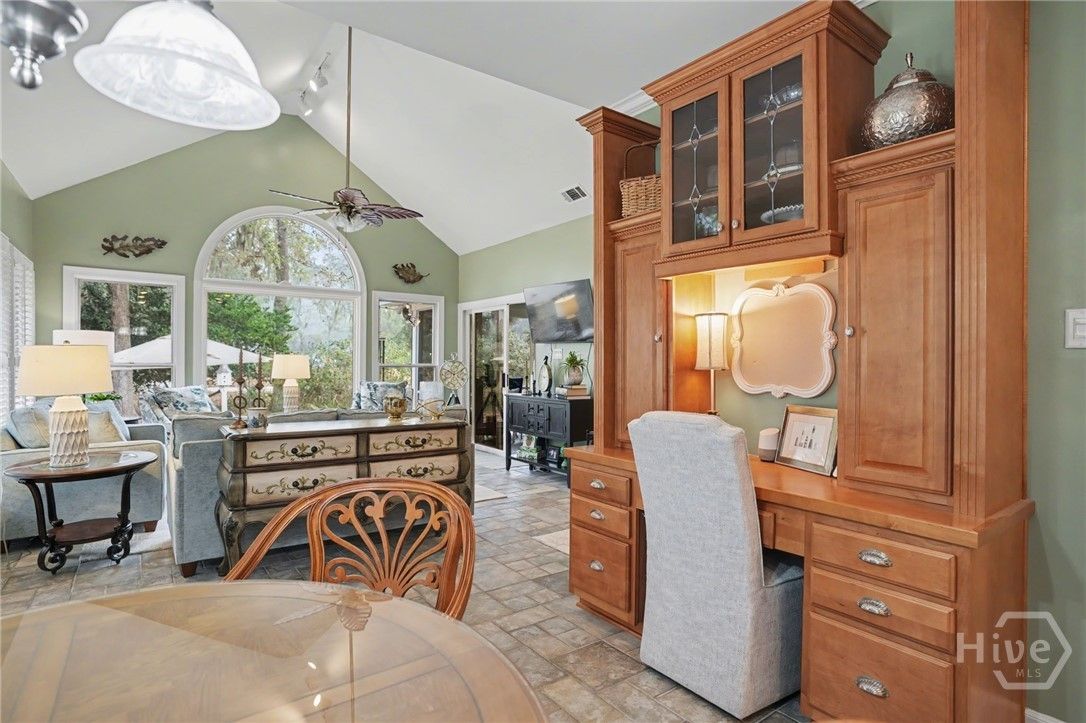 - Built-in Features, Breakfast Area, Double Vanity, Entrance Foyer, High Ceilings, Jetted Tub, Main Level Primary, Pantry, Pull Down Attic Stairs, Recessed Lighting, Skylights, Separate Shower, Vaulted Ceiling(s), Fireplace, Programmable Thermostat