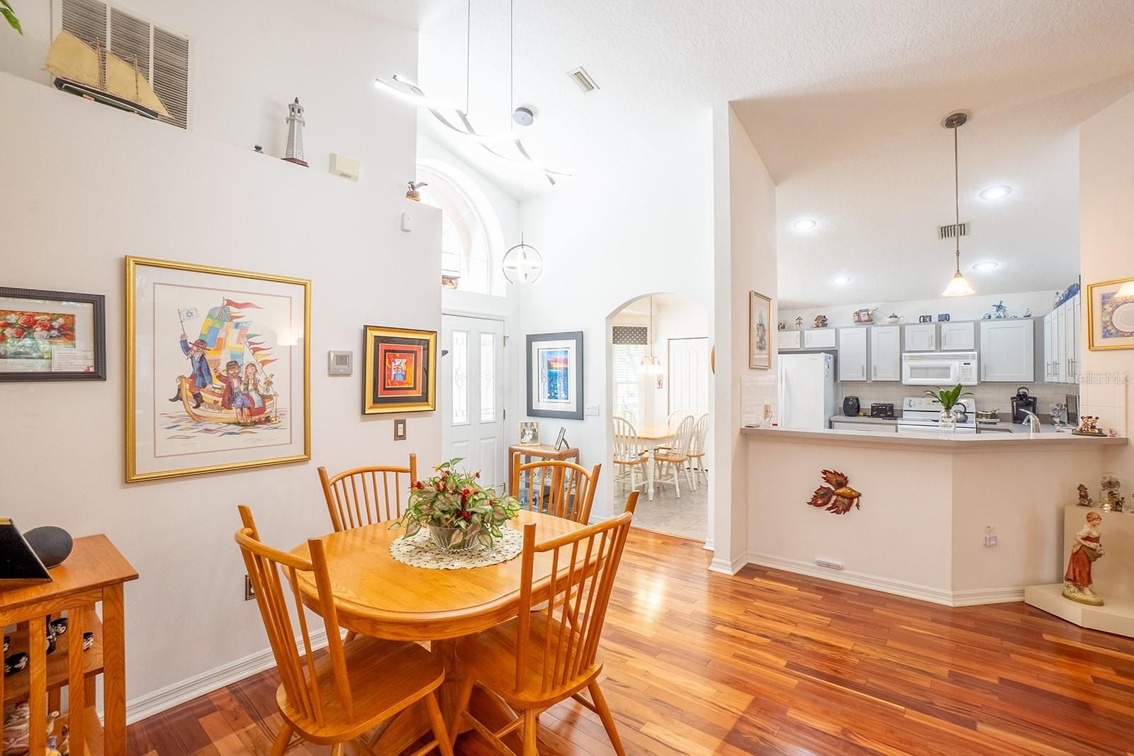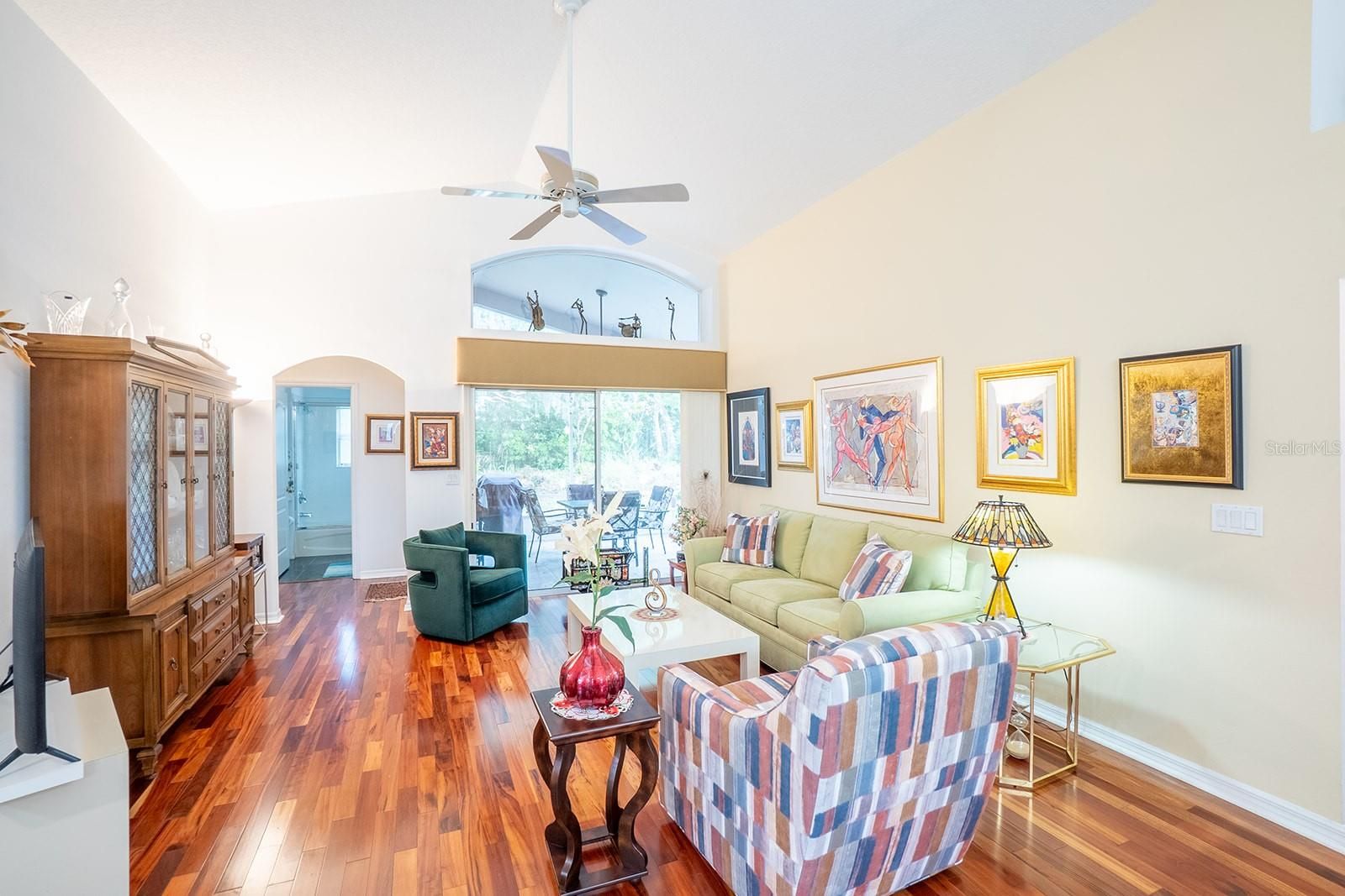 Pride of ownership shows with this one owner home. Very well maintained home which the sellers built, sits on a corner lot with a circular driveway for extra parking. This home is in Grand Haven which offers exceptional amentities - 2 pools, 2 fitness centers, tennis courts, pickleball courts, croquet, restaurant and bar, miles of walking and cycling trails and much much more. Enter this home through double doors to high ceilings and Brazilian Teak Wood floor throughout the main area. Sliding patio doors out to the lanai and backyard with mature trees. The kitchen which has had new cabinet doors and soft closing drawers (2024) has a bay window with enough room for a table for casual dining. Kitchen windows replaced in 2024. Split plan with the primary bedroom on one side. Ensuite has a walk in shower, separate tub and separate private WC. Two other bedrooms and bathroom on the other side of the house. The house sits in a very quiet neighborhood with sidewalks and within a 5 minute walk to the Village Center.