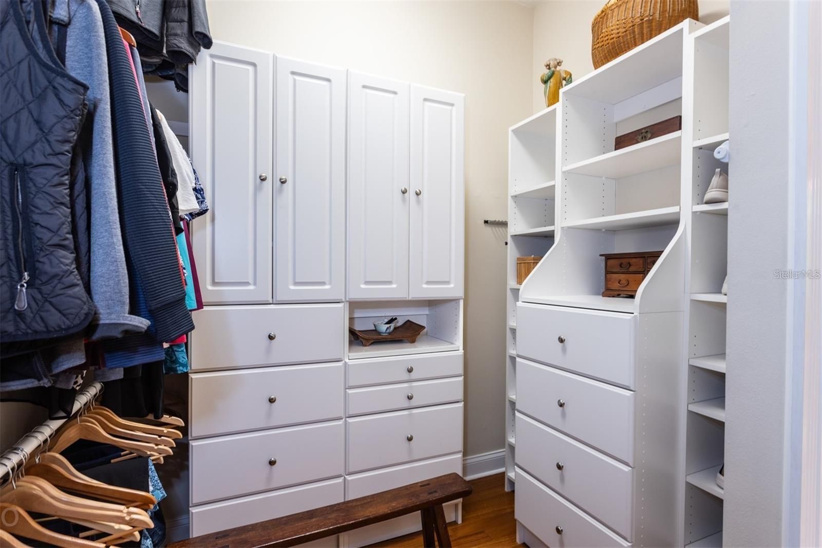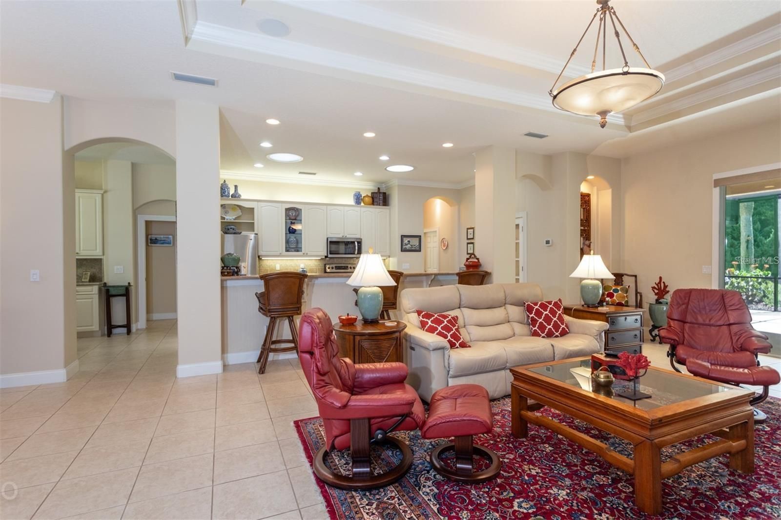 - Built-in Features, Ceiling Fan(s), Central Vacuum, Crown Molding, High Ceilings, Living/Dining Room, Open Floorplan, Main Level Primary, Solid Surface Counters, Solid-Wood Cabinets, Split Bedrooms, Tray Ceiling(s), Walk-In Closet(s), Window Treatments