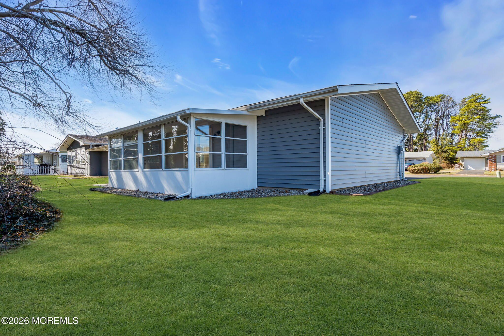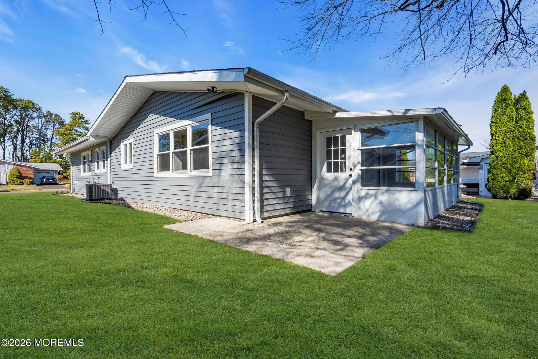 Discover modern elegance and carefree living in this beautifully updated 2-bedroom, 1.5-bath ranch-style home nestled in the highly sought-after Greenbriar I 55+ active adult community Completely remodeled with high-end finishes throughout, this open-architecture gem backs up to serene woods for ultimate privacy while offering immediate occupancy and a prime location just steps from the clubhouse. Step into a welcoming custom entry foyer with extra storage closets, leading to an expansive open floor plan featuring an oversized living room and dining area adorned with elegant crown molding and recessed lighting. The heart of the home is the chef's kitchen, boasting a large center island with seating for three, pristine white cabinetry, upgraded granite countertops, and premium LG stainless steel appliances--perfect for entertaining or everyday enjoyment. Custom-tiled walk-in shower with designer ceramic flooring in the Main bath and jack and Jill 1/2 half bath.. Recent upgrades ensure worry-free living: new gas heating, new central air conditioning, new hot water heater, and new ductwork throughout; new vinyl siding, new double-length asphalt driveway and new front landscaping. Thermopane tilt wash vinyl windows and separate Laundry room with New Gas Washer/Dryer Tower. Additional highlights include a spacious Florida room for summer relaxation, an oversized garage for extra storage, freezer or refrigerator area or workshop. This home is ideally situated around the corner from Greenbriar I's vibrant amenities, including a large clubhouse hosting clubs and events, outdoor pools a private 6-hole golf course, billiards room, fitness facilities, and more--all covered by a low monthly HOA fee including lawn care, snow removal, and common area maintenance. Enjoy effortless commuting with entrances to the Garden State Parkway (North & South) just one minute away, and reach the beautiful Jersey Shore beaches in only 20 minutes. Low taxes and a vibrant community. Please note: Grass has been enhanced and home is virtually staged for illustrative purposes only.