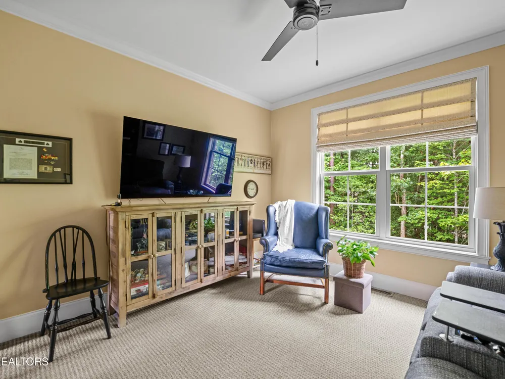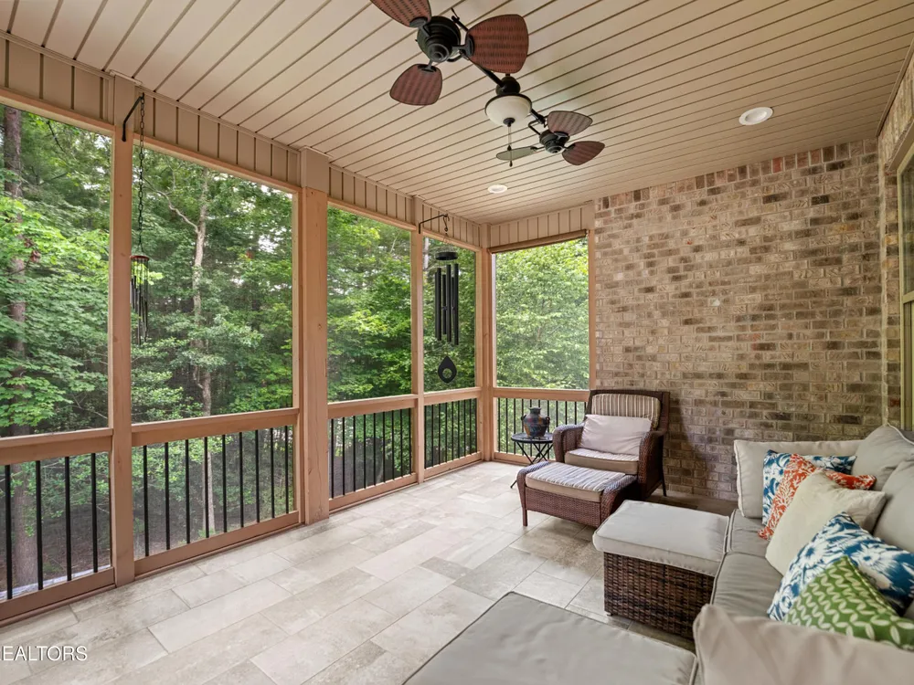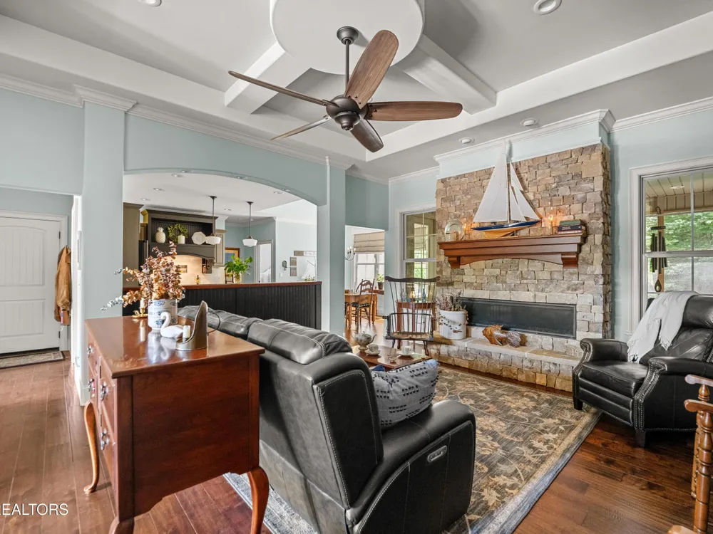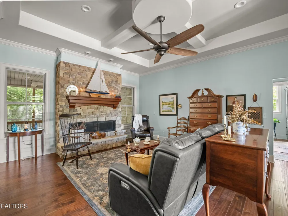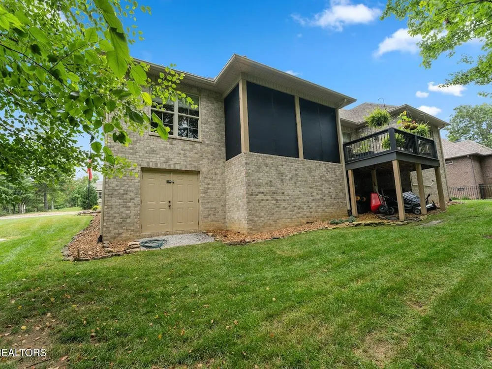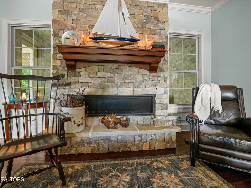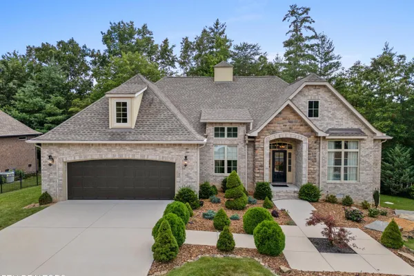 Luxury meets Craftsmanship in this One-Of-A-Kind Fairfield Glade Home. Step into timeless elegance with this custom all-brick-and-stone masterpiece constructed in 2016 by one of Fairfield Glade's premier builders. From the moment you enter the wide foyer with trey ceiling and intricate millwork, you will know this home is something truly special. The stunning great room boasts a soaring trey ceiling, a handcrafted native Crab Orchard Stone fireplace and a rich walnult mantle by Pearl Mantel--complete with a hidden pearl inlay. A 72' designer fan perfectly complements the custom finishes. The chef's kitchen is a dream; solid wood cabinetry, sleek white quartz countertops, a marble island with leathered finish (installed 2022), and a premium Ruvati Workstation sink with high-end accessories. A built-in spice niche over the stove, spacious pantry, powder room and laundry room add style and function. Enjoy forested views from the light-filled breakfast area or entertain on the expansive Trex deck and 16'x14' newly screened porch. Retreat in the luxurious primary suite with a trey ceiling, custom wood-trimmed windows, and spa-style bath featuring dual vanities, granite countertops, and a massive 13'x7' wet-room shower with dual heads and ceiling rain shower. The 7' x 10' walk-in closet is fully customized for effortless organization. This thoughtfully designed split-bedroom floor plan includes two generous guest rooms (one with a custom walk-in closet) and a fully remodeled guest bath with walk-in tiled shower and granite vanity. Upstairs, a finished 21'x14' bonus room with mini-split offers the perfect flex space for a media room, studio or private guest suite. Even the utility spaces shine; an oversized garage with crown molding and new insulated door (2025), walk-in crawl space with commercial dehumidifier and safe room. The LeafGuard gutter system (2023) comes with a lifetime transferable warranty. A whole-house surge protection system is in place. Every inch of this home has been carefully curated for comfort, style and longevity. Don't miss your chance to own this rare gem in Fairfield Glade! **Buyer to verify all information before making an informed decision***
