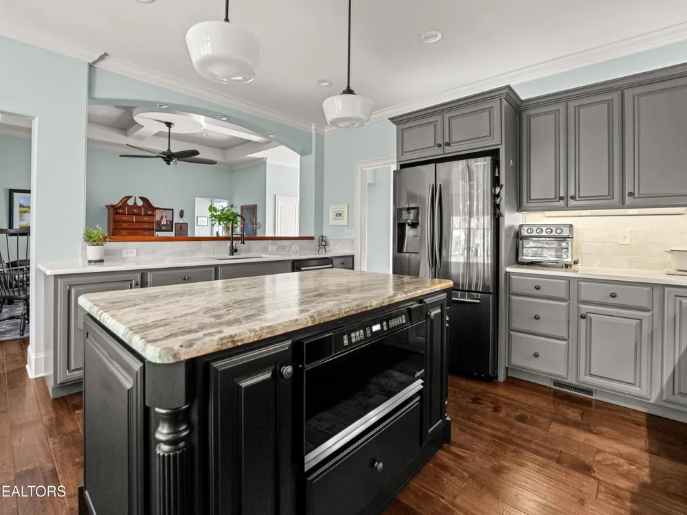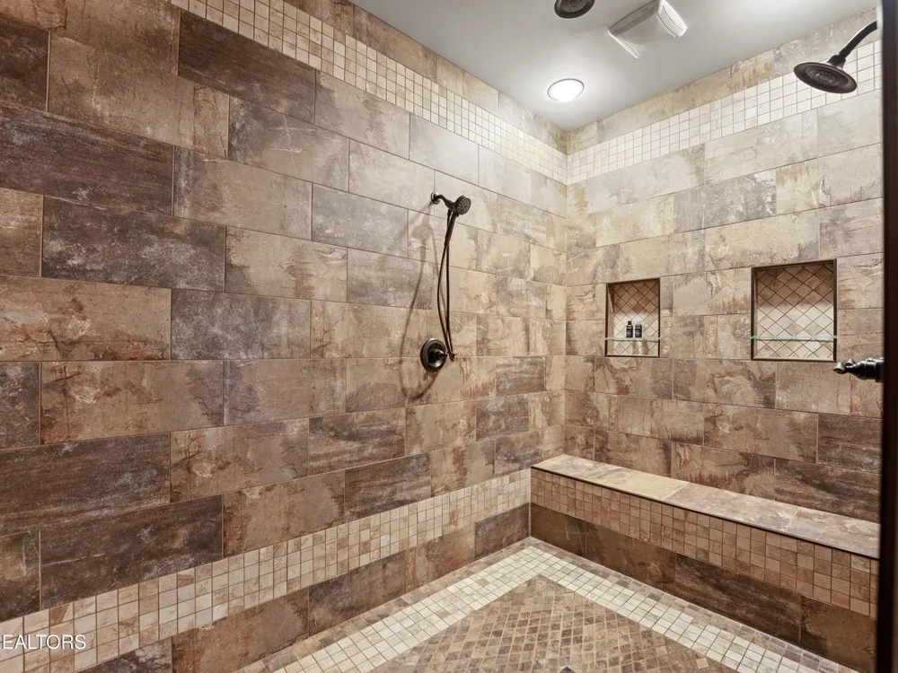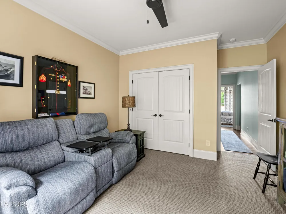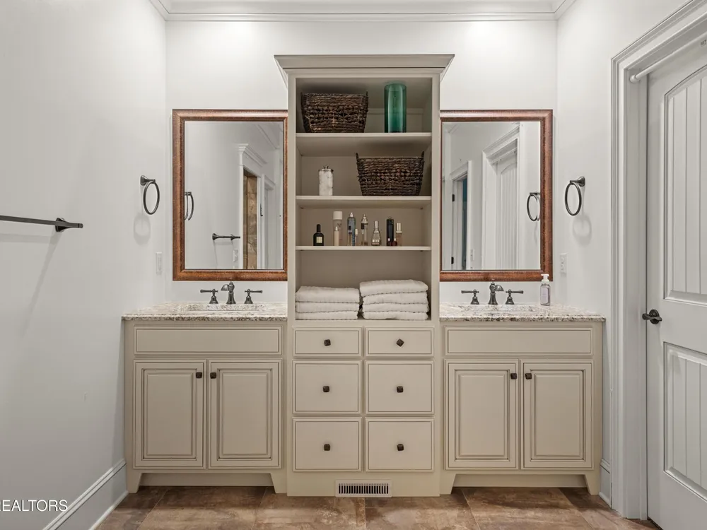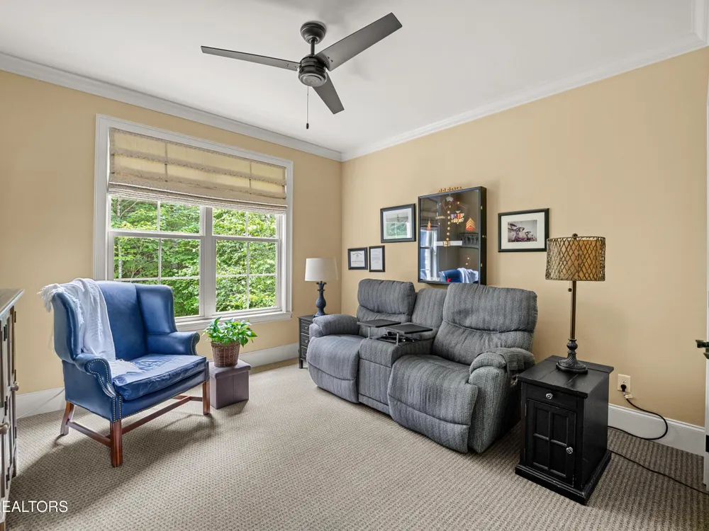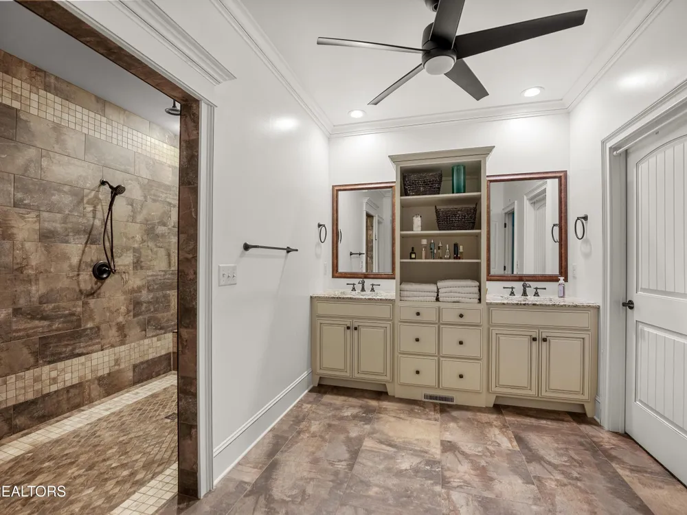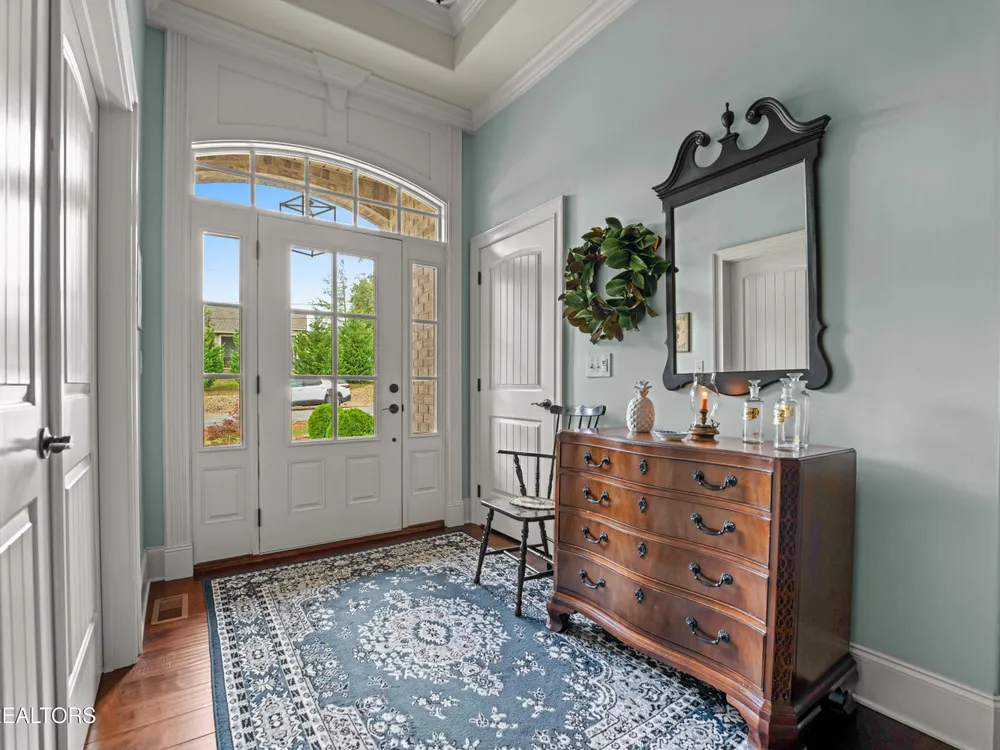 Luxury meets Craftsmanship in this One-Of-A-Kind Fairfield Glade Home. Step into timeless elegance with this custom all-brick-and-stone masterpiece constructed in 2016 by one of Fairfield Glade's premier builders. From the moment you enter the wide foyer with trey ceiling and intricate millwork, you will know this home is something truly special. The stunning great room boasts a soaring trey ceiling, a handcrafted native Crab Orchard Stone fireplace and a rich walnult mantle by Pearl Mantel--complete with a hidden pearl inlay. A 72' designer fan perfectly complements the custom finishes. The chef's kitchen is a dream; solid wood cabinetry, sleek white quartz countertops, a marble island with leathered finish (installed 2022), and a premium Ruvati Workstation sink with high-end accessories. A built-in spice niche over the stove, spacious pantry, powder room and laundry room add style and function. Enjoy forested views from the light-filled breakfast area or entertain on the expansive Trex deck and 16'x14' newly screened porch. Retreat in the luxurious primary suite with a trey ceiling, custom wood-trimmed windows, and spa-style bath featuring dual vanities, granite countertops, and a massive 13'x7' wet-room shower with dual heads and ceiling rain shower. The 7' x 10' walk-in closet is fully customized for effortless organization. This thoughtfully designed split-bedroom floor plan includes two generous guest rooms (one with a custom walk-in closet) and a fully remodeled guest bath with walk-in tiled shower and granite vanity. Upstairs, a finished 21'x14' bonus room with mini-split offers the perfect flex space for a media room, studio or private guest suite. Even the utility spaces shine; an oversized garage with crown molding and new insulated door (2025), walk-in crawl space with commercial dehumidifier and safe room. The LeafGuard gutter system (2023) comes with a lifetime transferable warranty. A whole-house surge protection system is in place. Every inch of this home has been carefully curated for comfort, style and longevity. Don't miss your chance to own this rare gem in Fairfield Glade! **Buyer to verify all information before making an informed decision***