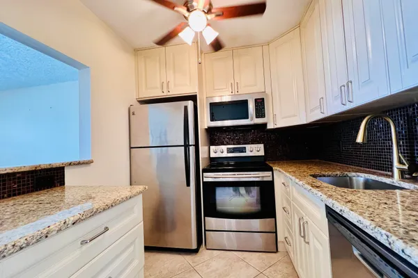 BEAUTIFUL WATER VIEWS & UPDATES IN 55+ CENTURY VILLAGE! Lovely Move In Ready 1/1 In The Convenient Kent Section. Beautiful Updated Kitchen With Luxury Finishes; Granite Counters, Tile Backsplash, and Full Stainless Appliance Package - Including A Dishwasher. Updated Bath. Neutral Tile Flooring Set on the Diagonal Flows Throughout. Spacious Water View Bedroom Leads to the Enclosed Lanai. Enclosed Lanai Offers Extra Space & a Delightful Spot to Take In The Water Views! Plenty of Storage Space With a Walk-in Hall Closet and a Wall of Closets in the Bedroom. Great Location Close to the Popular Kent Pool! Century Village Is a Vibrant 55+ Community Centrally Located In Highly Desirable Palm Beach County! Enjoy An Active Lifestyle Filled With Activities and Resort Style Amenities...