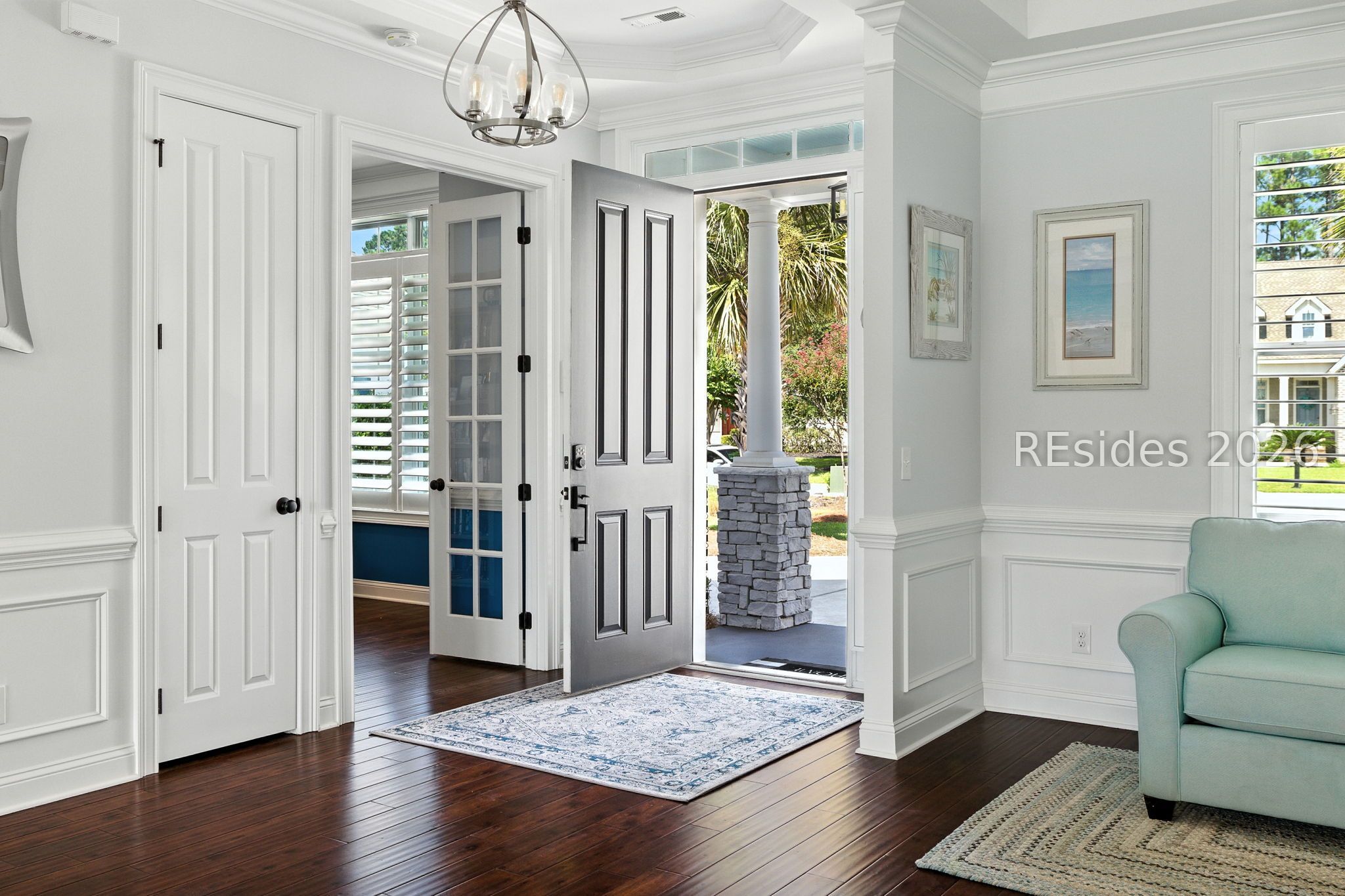 This stunning 4-bedroom, 3.5-bath home offers 2,984 sq. ft. of beautifully designed living space and sits directly on Hampton Lakes navigable waters, complete with its own private dock. From its courtyard entry to its expansive screened patio with secluded lake views, every detail has been thoughtfully crafted for comfort, style, and function. Inside, you'll find wood floors, soaring tray, vaulted, and coffered ceilings, and high-end finishes throughout. The open-concept layout seamlessly blends the spacious family room, gourmet kitchen, and dining area, making it perfect for both entertaining and everyday living. The spacious office is ideal for working from home, while abundant natural light fills every room. Upstairs, the custom-finished family room over the garage features bamboo flooring, offering a flexible space for guests, hobbies, or a private retreat. The garage is climate-controlled with a split-air system, providing year-round comfort and functionality. The screened-in patio overlooks the water and large, private backyard perfect for relaxing, dining al fresco, or simply taking in the view. From your own dock, launch a boat, kayak, or paddleboard and explore Hampton Lakes beautiful waterways. As a Hampton Lake resident, you'll enjoy resort-style amenities including a lakeside pool, fitness center, spa, clubhouse, tennis and pickleball courts, walking trails, and a waterfront restaurant. Known for its strong sense of community and exceptional lifestyle, Hampton Lake is more than a neighborhood its a way of life. This home is turnkey and ready for you to start living the waterfront dream.
