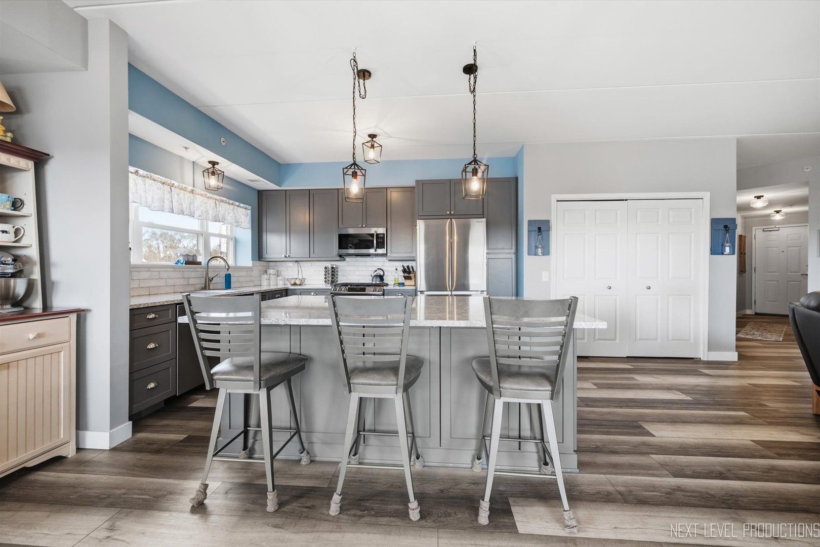 - Elevator, Bedroom on Main Level, Lobby, Quartz Counters, Balcony, Kitchen/Dining Combo