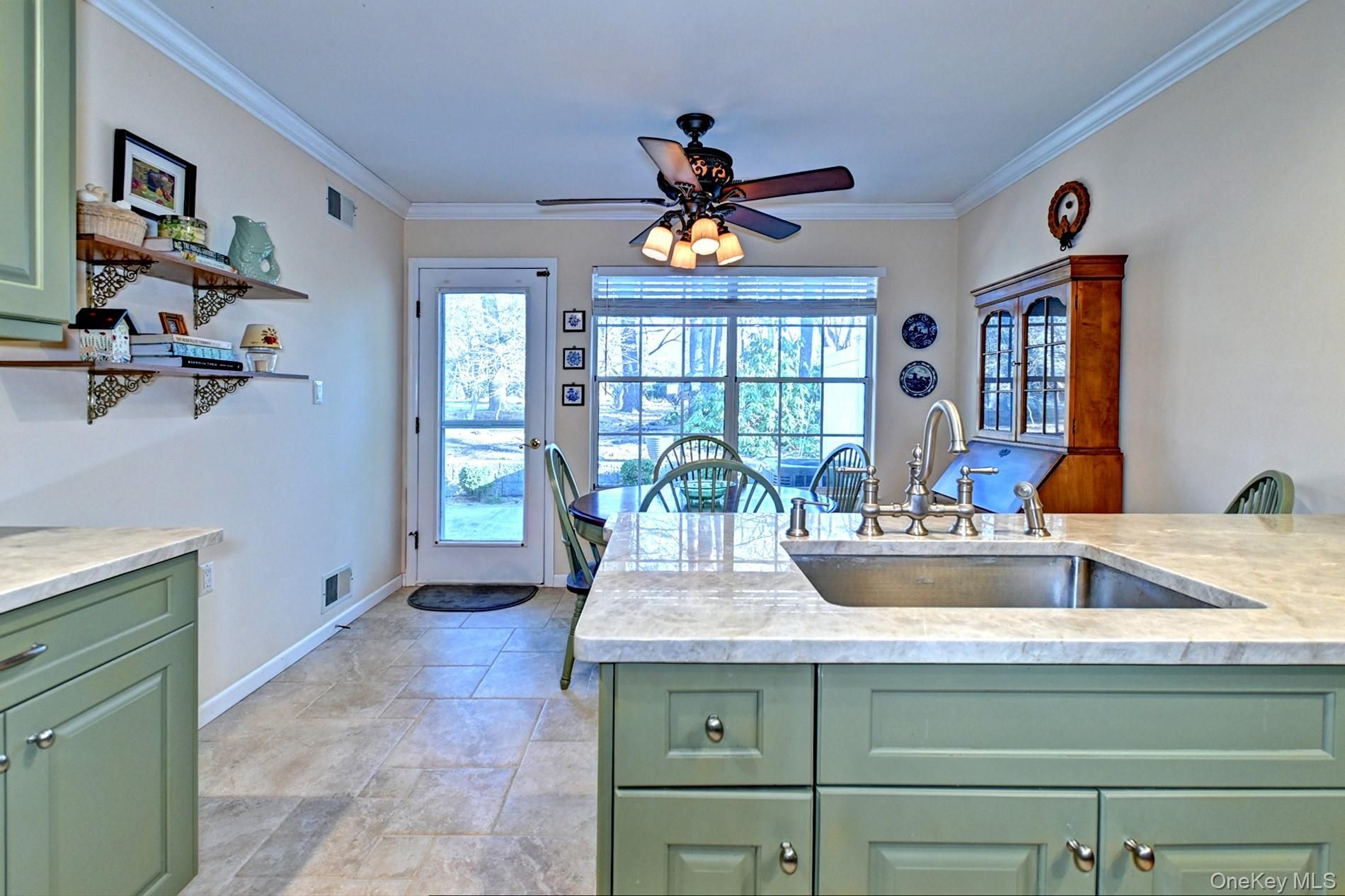 Welcome to 10 Oakdale Ct in the desirable Leisure Glen gated community, featuring the highly sought-after Greenport model. Located at the end of a quiet cul-de-sac, this home is ideally positioned near the paseo walking path, offering easy and immediate access to all of the community’s amenities. The pool, community center, tennis, bocce, and pickleball courts are all just a short, convenient walk from the backyard, while mature pine trees provide privacy. Inside, the home feels bright and expansive with a formal living room featuring a wood-burning fireplace, a formal dining room with cathedral ceilings, skylights, and abundant natural light throughout. The custom kitchen by NDA Kitchens features custom cabinetry, a built-in pantry, stainless steel appliances, quartz countertops, tumbled travertine backsplash tile and a porcelain tile floor. The primary bedroom includes a spacious walk-in closet and updated bath, along with a guest bedroom and updated guest bath. A sunny greenery room offers flexible space ideal for a den, home office, or hobby room. Outdoors, enjoy a large patio surrounded by trees that enhance privacy. An attic with shelving and pull-down stairs above the garage provides generous and convenient storage. Leisure Glen is an active 55+ gated community with 24-hour security, offering a vibrant social lifestyle. Amenities include a clubhouse, pool and hot tub, fitness center, billiards, creative arts classes, clubs, and social activities, as well as tennis, bocce, and pickleball courts. The HOA covers lawn care, snow and leaf removal, common grounds, the roof, and the asphalt driveway: no mowing, no shoveling, and no exterior maintenance, allowing you to fully enjoy low-maintenance living.
