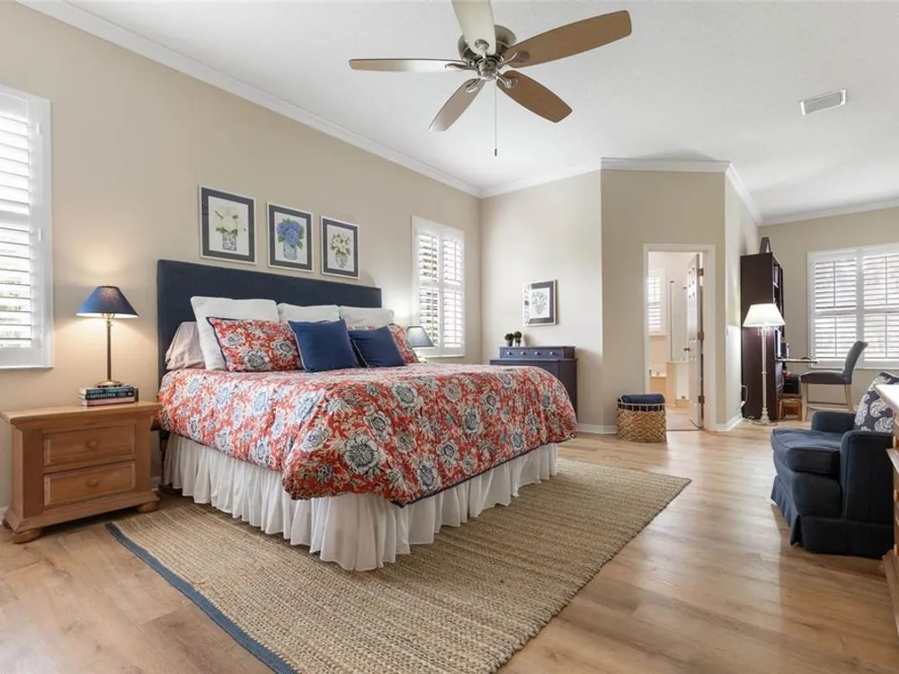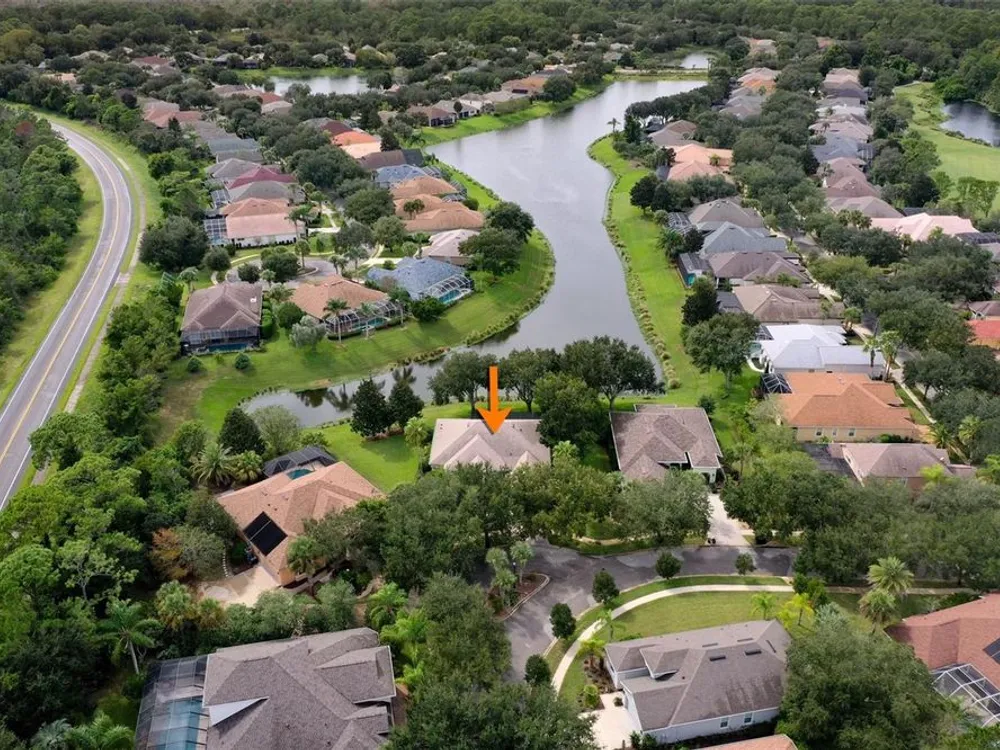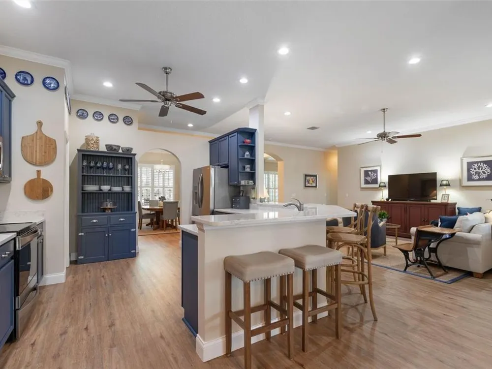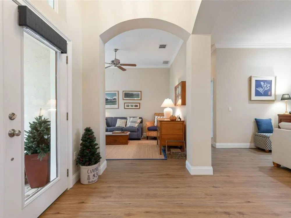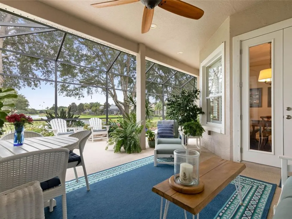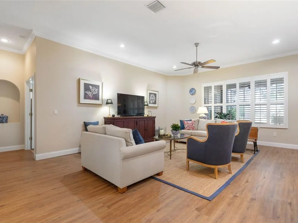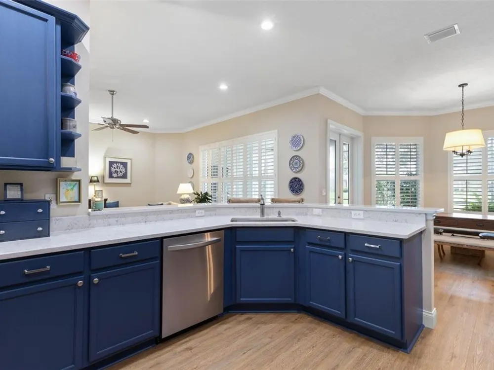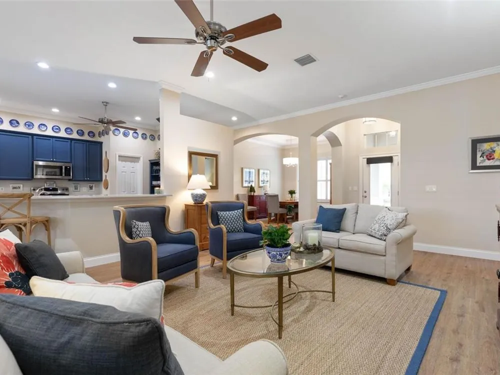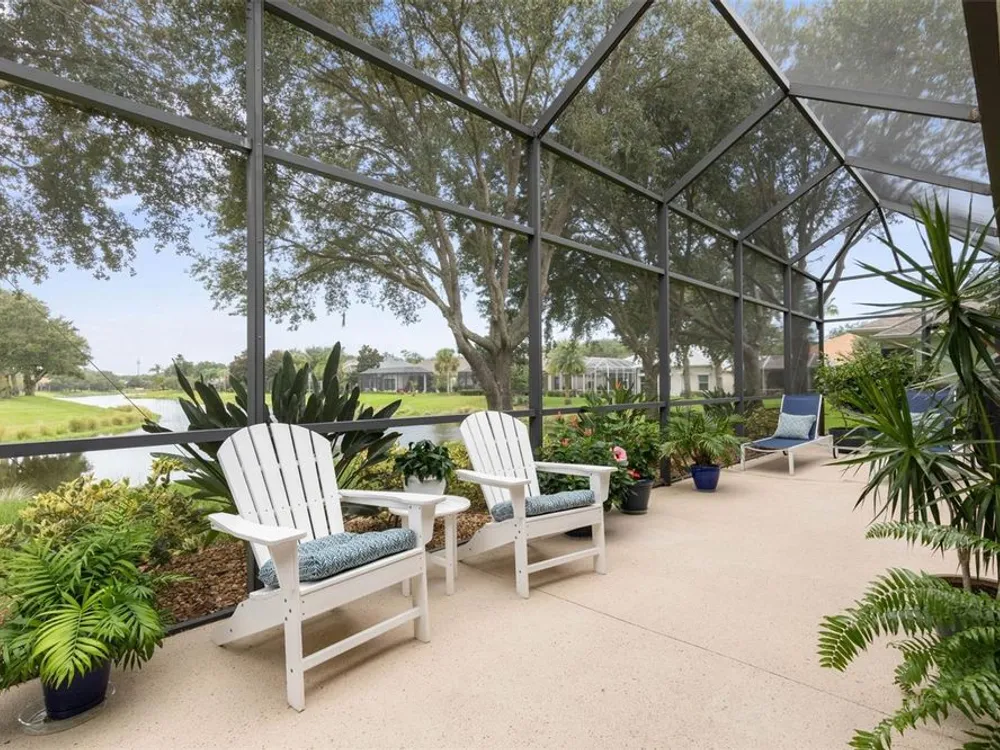 Welcome to this beautifully updated three bedroom, two bath home, 3 car tandem garage with a breathtaking pond/lake view. This home is located in the sought after Grand Havenn golf community. Designed to impress, this residence offers modern upgrades and stylist finishes throughout. Step inside the front door and you will find a light filled open floor plan. A formal living room and dining room off the foyer with a large gathering room. The open floor plan features luxury vinyl flooring, a designer kitchen with beautiful blue cabinets and perfectly curated decor. You feel like you have entered a model home but better. The kitchen has stainless steel applicences, a walk in pantry, bar height counter tops and plenty of storage The breakfast room has a wonderful view of the lake and access to the lanai. The primary bedroom boosts a large walk in closet and a extra space for perhaps an office, exercise area or reading nook. The other two bedrooms and guest bath are spacious. The bathrooms and kitchen were recently remodeled, plantation shutters added, roof, water filtration system, painted garage floor, paver driveway and sidewalk and new screen for lanai. Enjoy peaceful evenings from your patio overlooking the serene lake, all while living in a secure, gated community known for its charm and amenities. This is more than a home. I know you will fall in love with it the moment you step through the door.