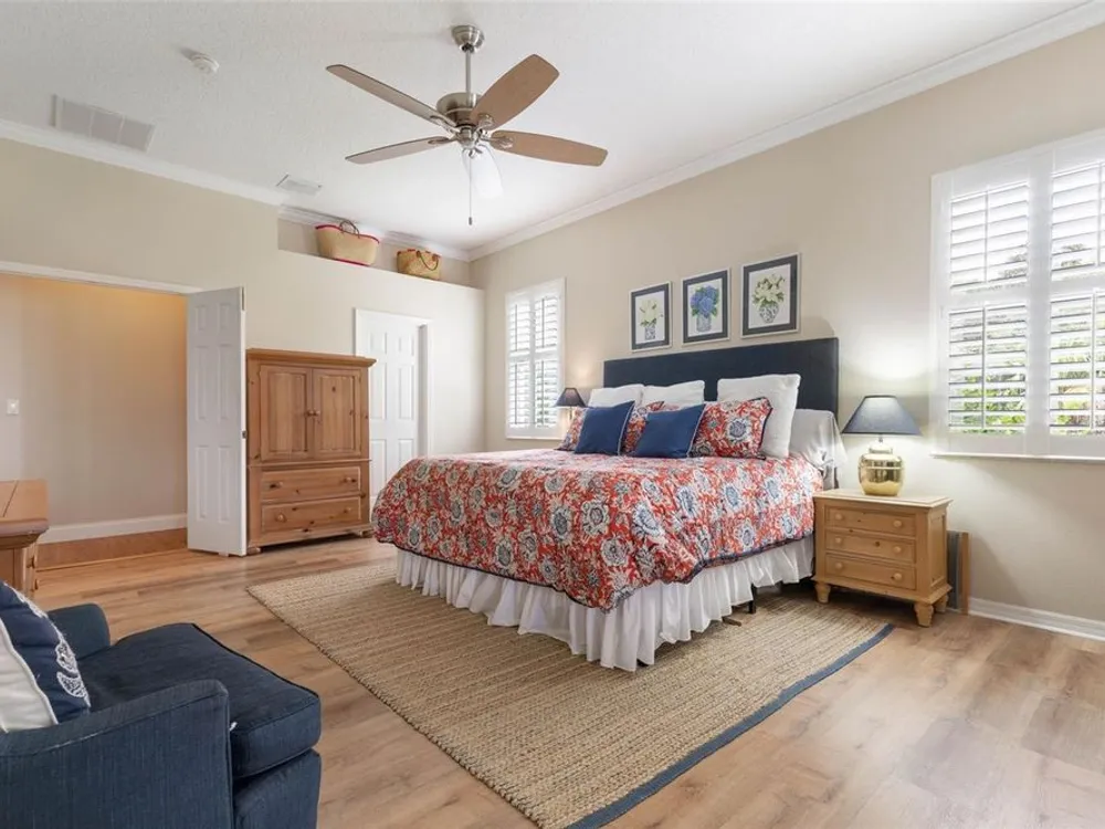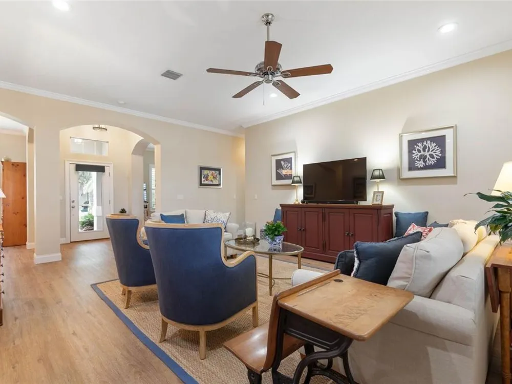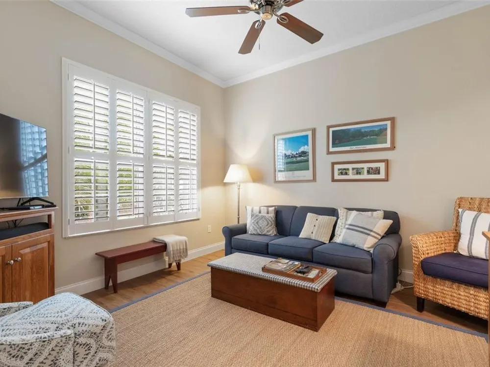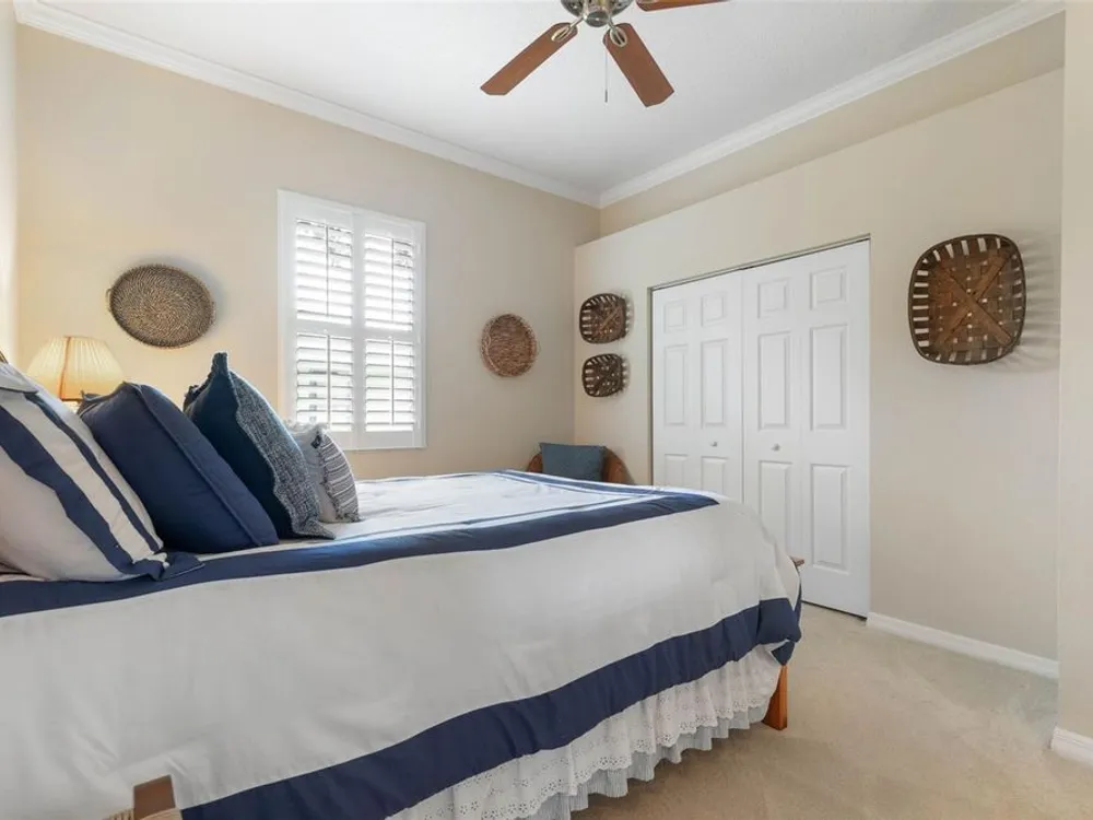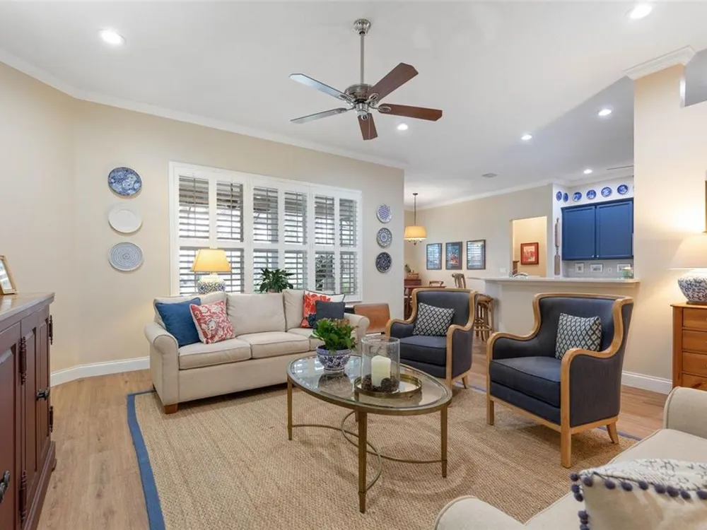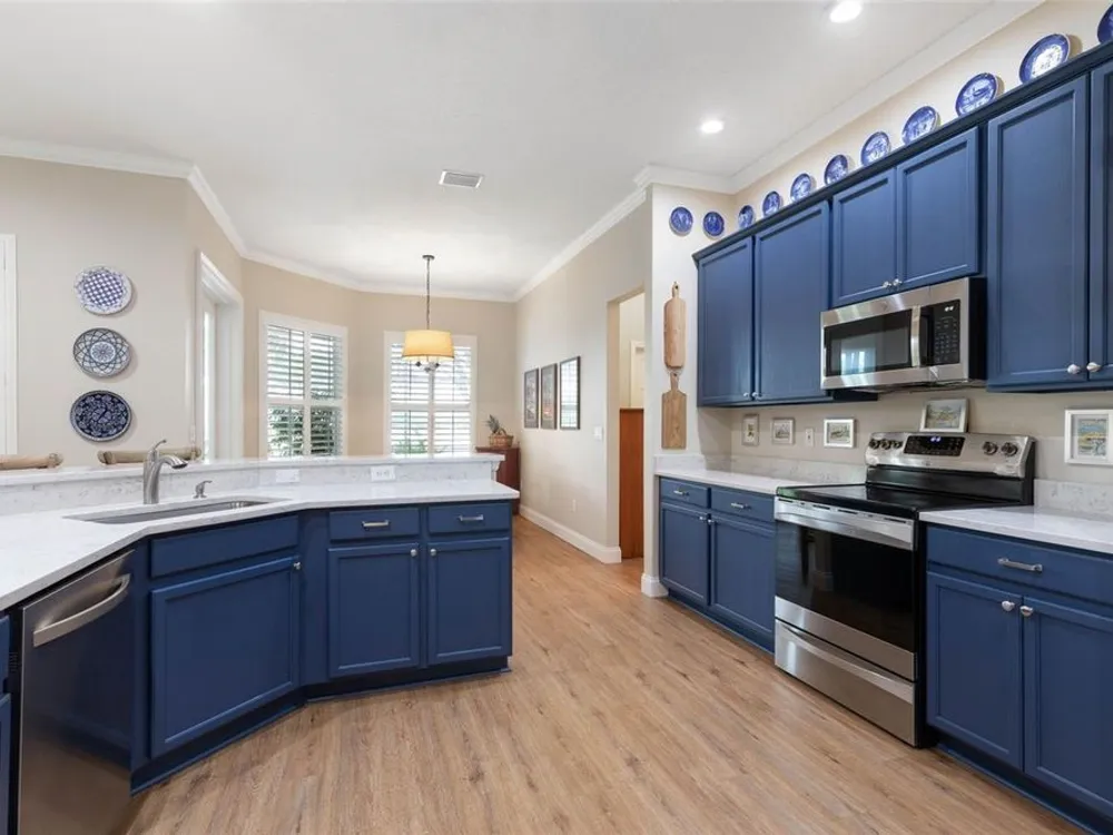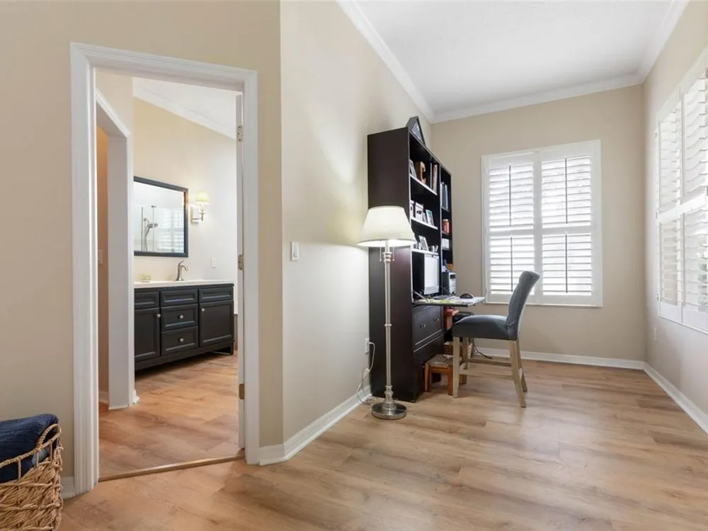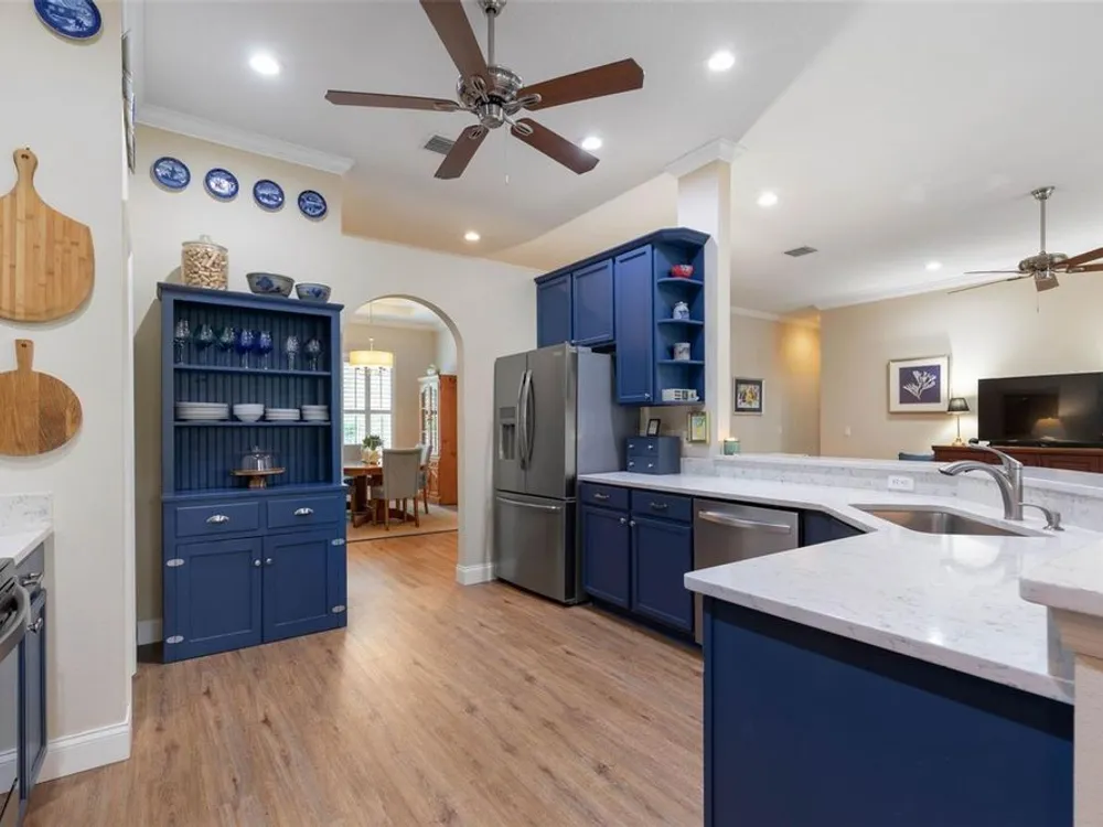 Welcome to this beautifully updated three bedroom, two bath home, 3 car tandem garage with a breathtaking pond/lake view. This home is located in the sought after Grand Havenn golf community. Designed to impress, this residence offers modern upgrades and stylist finishes throughout. Step inside the front door and you will find a light filled open floor plan. A formal living room and dining room off the foyer with a large gathering room. The open floor plan features luxury vinyl flooring, a designer kitchen with beautiful blue cabinets and perfectly curated decor. You feel like you have entered a model home but better. The kitchen has stainless steel applicences, a walk in pantry, bar height counter tops and plenty of storage The breakfast room has a wonderful view of the lake and access to the lanai. The primary bedroom boosts a large walk in closet and a extra space for perhaps an office, exercise area or reading nook. The other two bedrooms and guest bath are spacious. The bathrooms and kitchen were recently remodeled, plantation shutters added, roof, water filtration system, painted garage floor, paver driveway and sidewalk and new screen for lanai. Enjoy peaceful evenings from your patio overlooking the serene lake, all while living in a secure, gated community known for its charm and amenities. This is more than a home. I know you will fall in love with it the moment you step through the door.