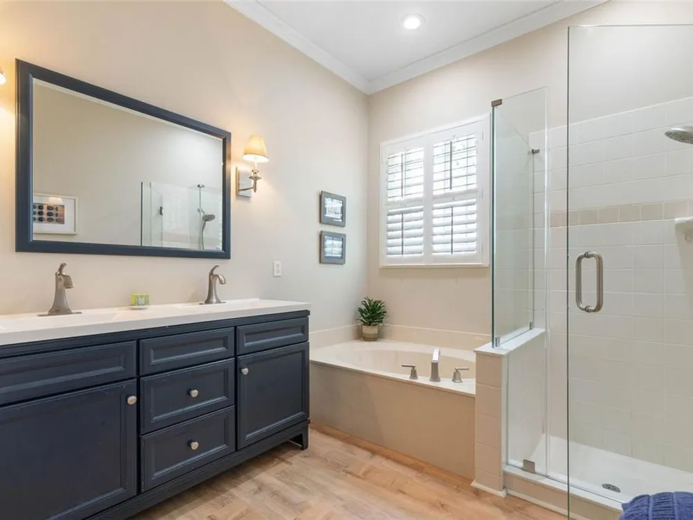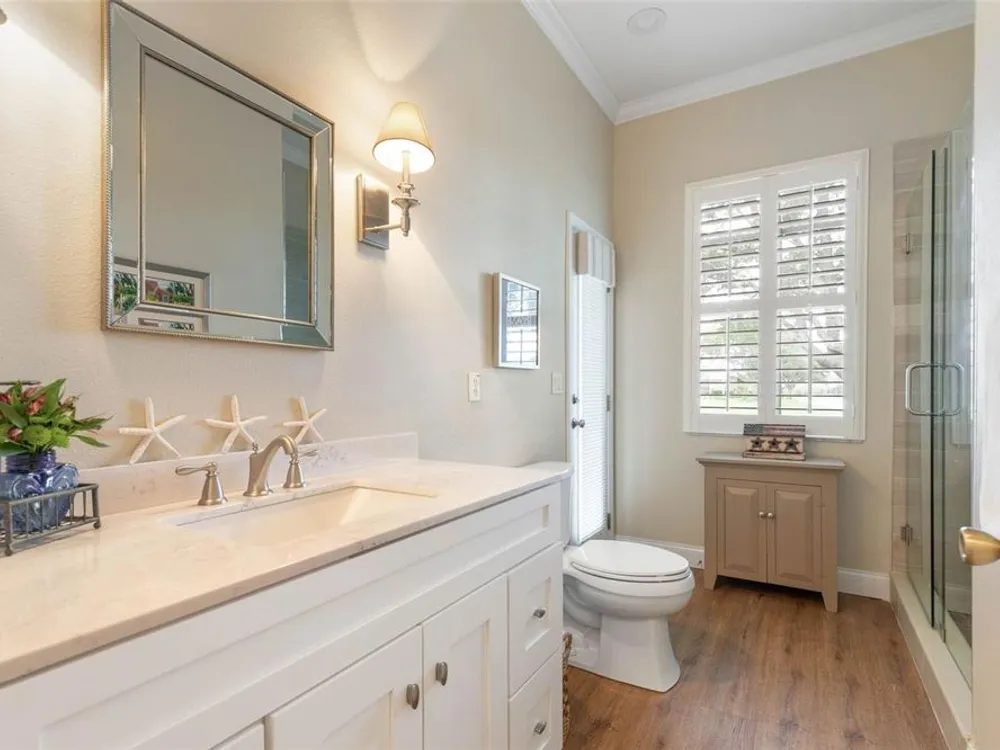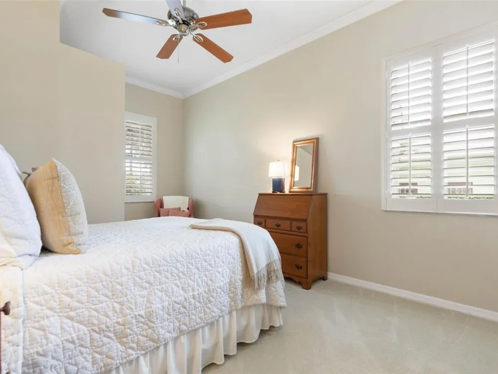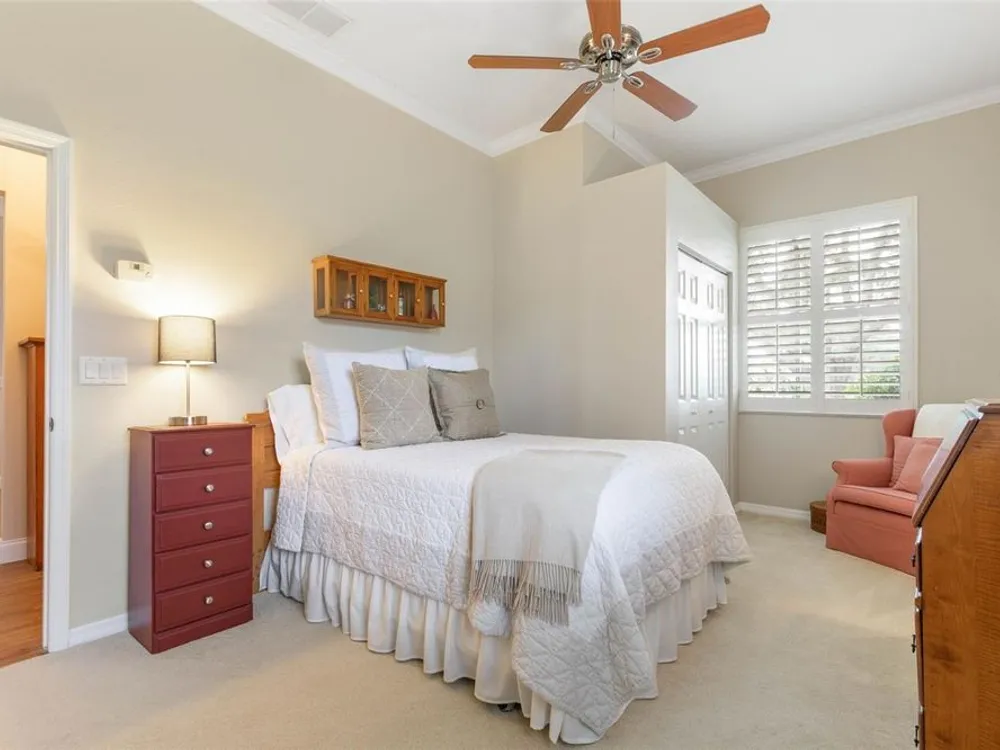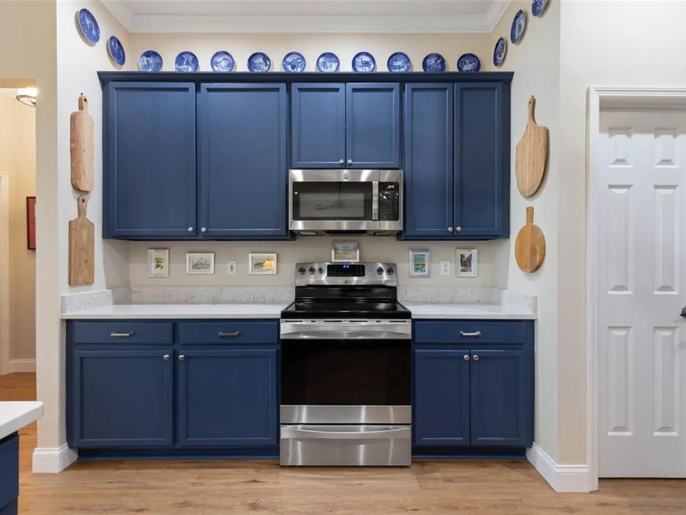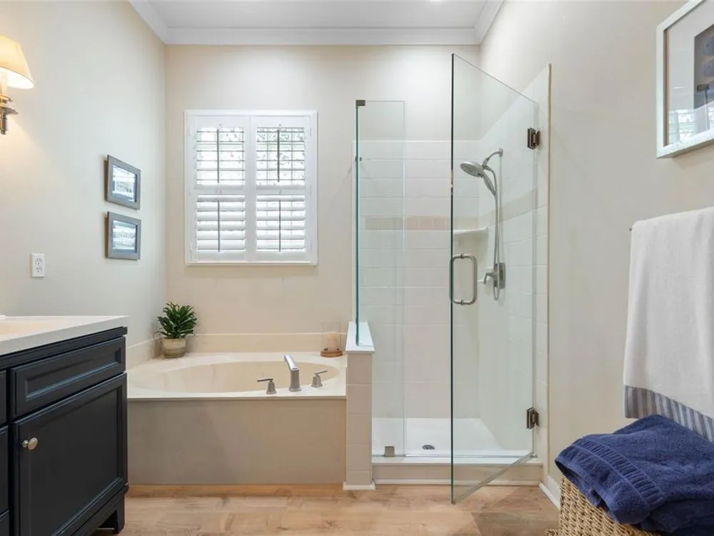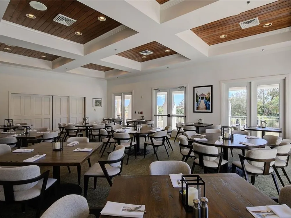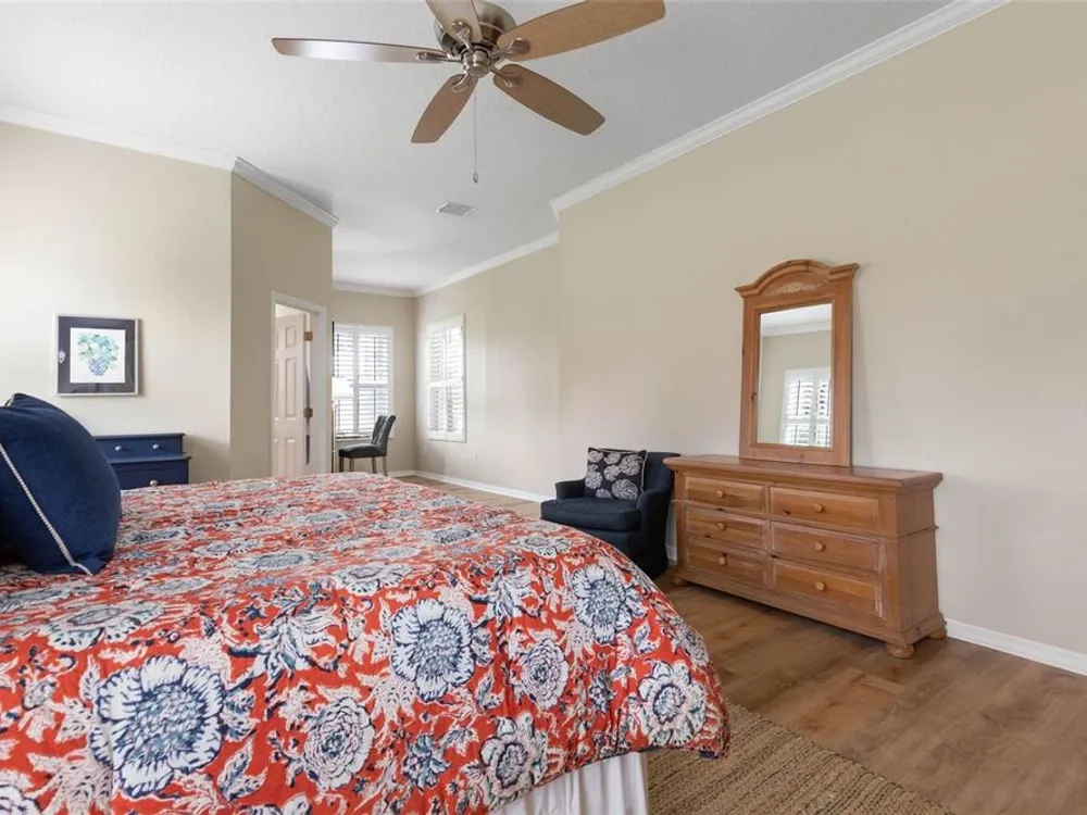 - Ceiling Fan(s), Coffered Ceiling(s), Crown Molding, Eat-in Kitchen, High Ceilings, Kitchen/Family Room Combo, L-Shaped Dining Room, Open Floorplan, Main Level Primary, Solid Surface Counters, Split Bedrooms, Thermostat, Tray Ceiling(s), Walk-In Closet(s), Window Treatments
