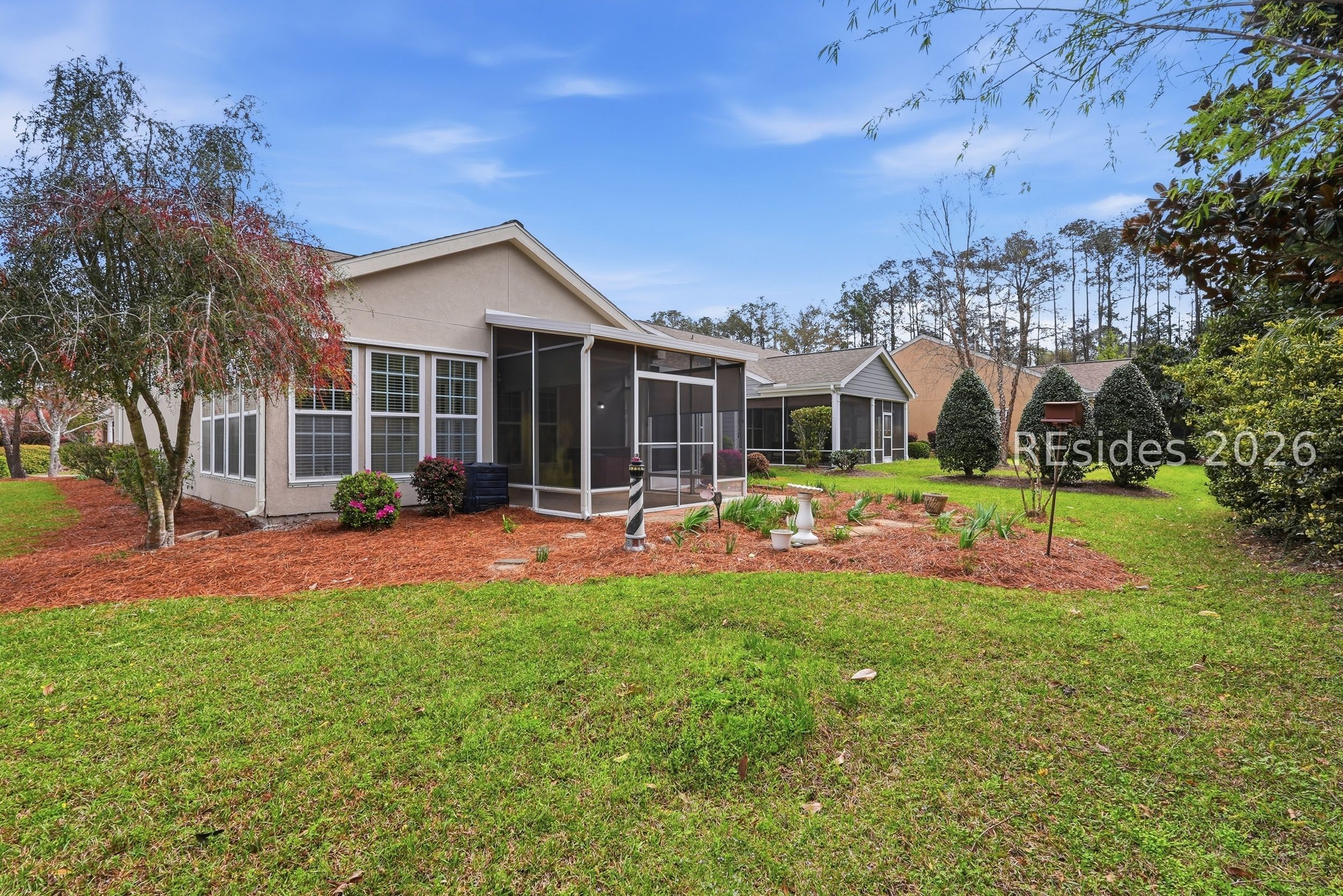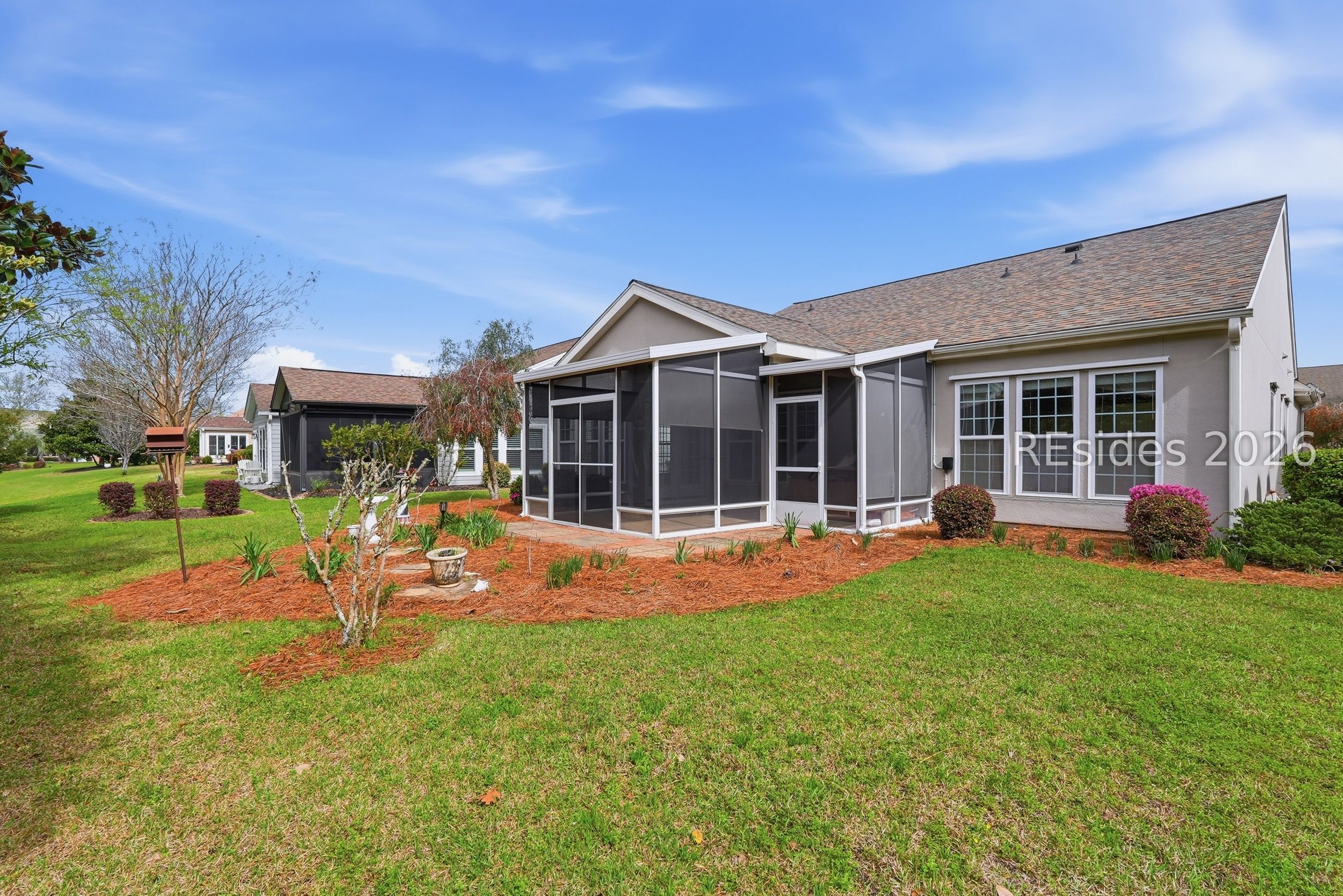 Beautifully maintained Copper Ridge model located on a quiet cul-de-sac street in the desirable Sun City Hilton Head community. This 2BD/2BA home plus Den w/French doors offers a spacious and flexible floor plan with wood flooring in the main living areas, abundant natural light, and comfortable living spaces throughout. The kitchen provides ample cabinetry and counter space and opens to the main living area, ideal for everyday living or entertaining. A bright Carolina room adds additional living space and overlooks the custom screened lanai w/pavers, perfect for relaxing and enjoying the peaceful setting. The primary suite includes a walk-in closet, tray ceiling and private bathroom with separate shower and jetted tub, while the guest bedroom and full bath provide comfortable accommodations for visitors. Additional highlights include an extended garage for extra storage, roof new in 2020, HVAC 2022, covered front porch, and convenient location with easy access to the Hwy 170 gate for quick travel to Beaufort, Bluffton, and Hilton Head Island. Situated on a low-traffic cul-de-sac homesite, this property offers both privacy and convenience within one of the Lowcountry's premier active adult communities. Sun City Hilton Head offers resort-style living with golf courses, indoor and outdoor pools, fitness centers, tennis, pickleball, walking trails, clubs, dining, and a full calendar of social activities, all just minutes from shopping, medical facilities, and the beaches of Hilton Head Island.