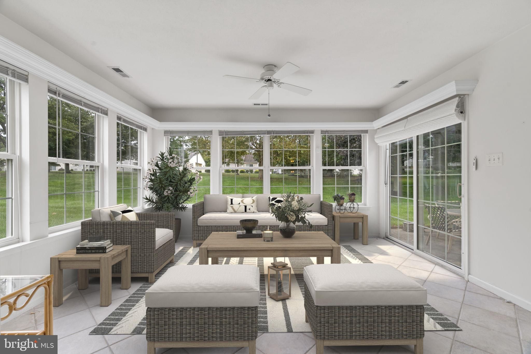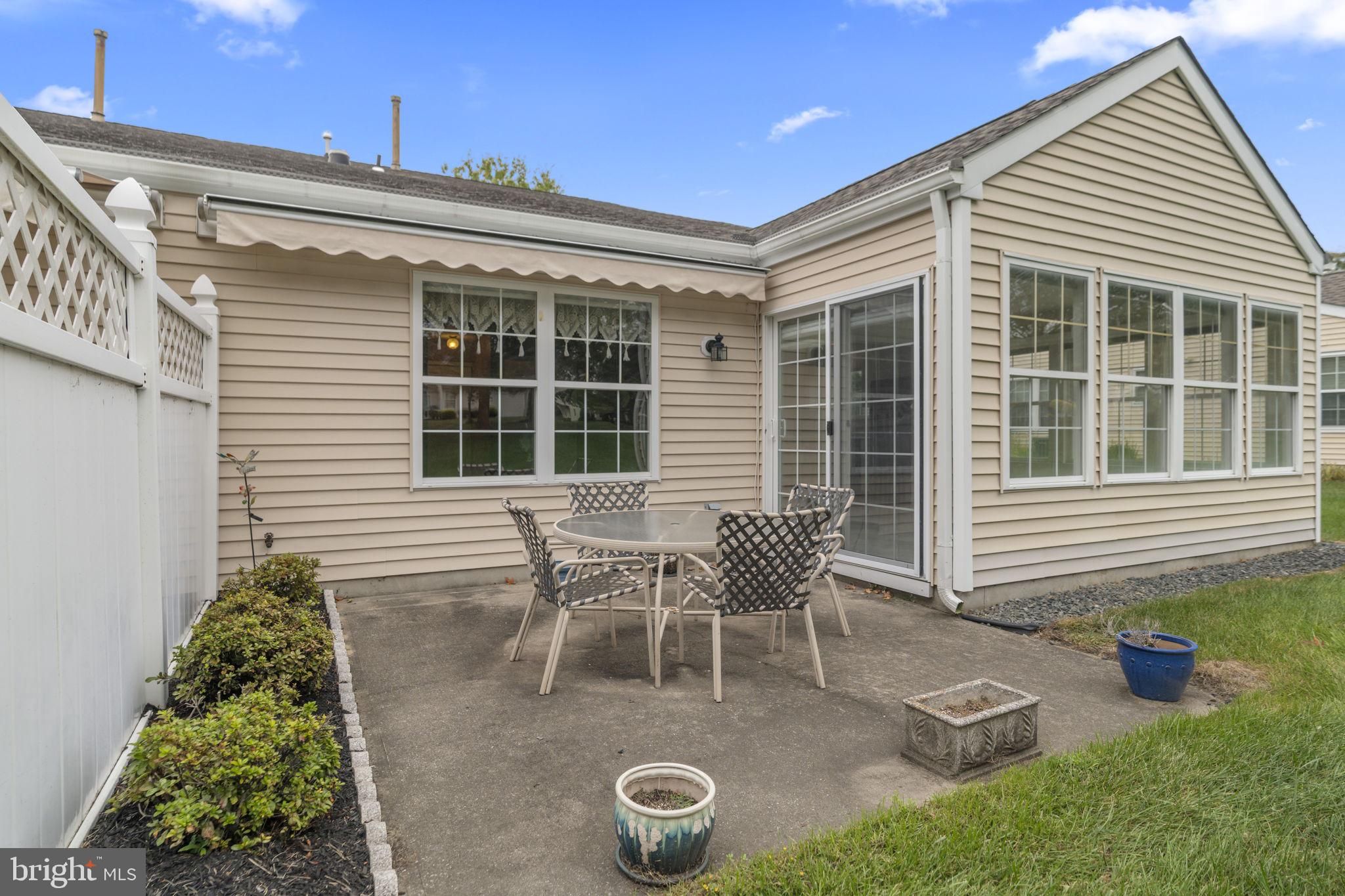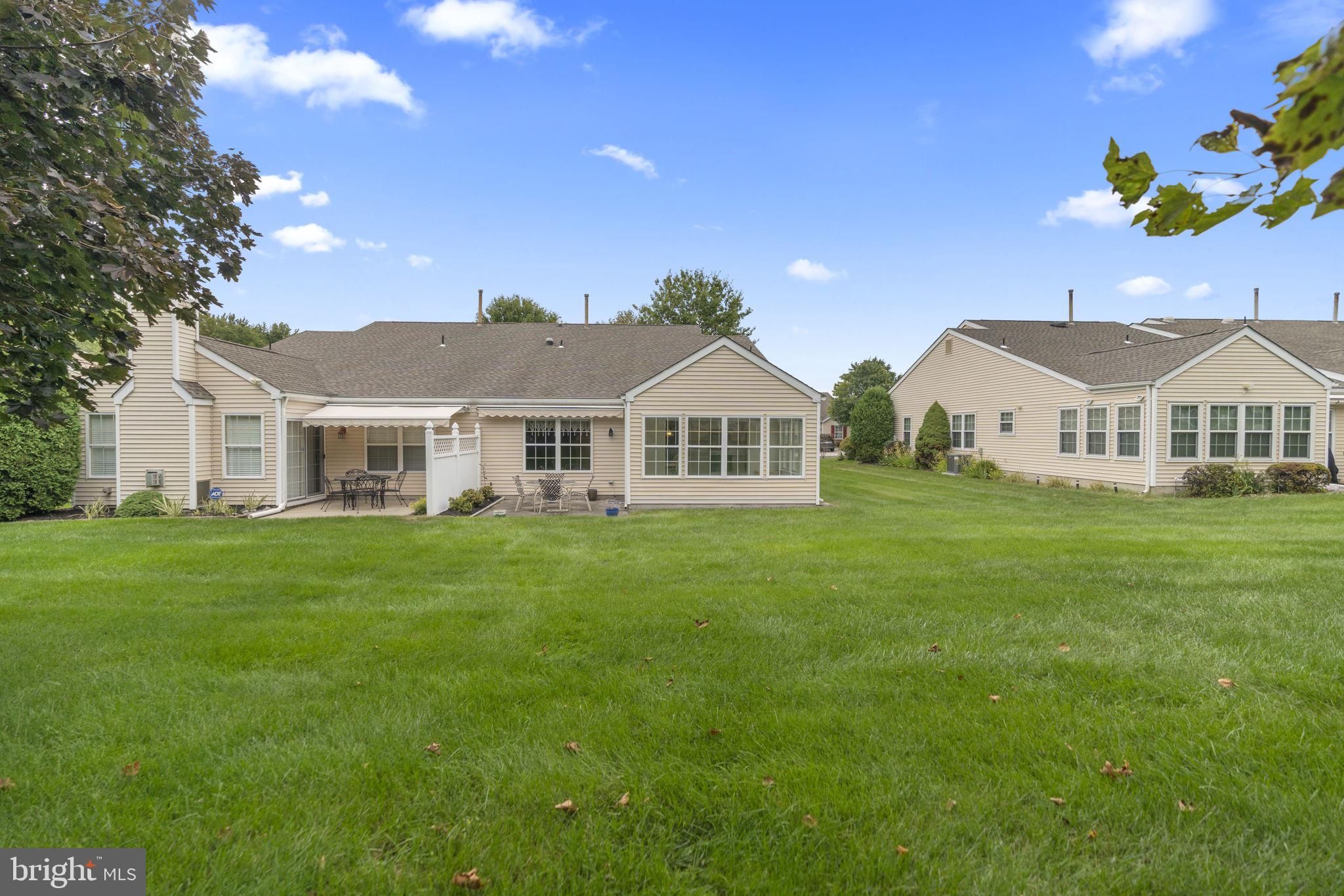 Welcome to this beautifully maintained end-unit patio home in the highly desirable Holiday Village East active adult community. This spacious Rosemont model offers nearly 1,600 sq ft of comfortable one-floor living and is tucked away on a quiet cul-de-sac. Step inside to a bright, sun-filled floorplan featuring neutral paint, new plush carpeting, and ceramic tile flooring in the foyer. The formal living and dining rooms provide a warm and welcoming space for hosting gatherings, while the updated eat-in kitchen features classic white cabinetry, mostly stainless steel appliances, and a built-in desk workspace. A convenient pantry closet offers extra storage. Just off the kitchen, you’ll find the light-filled four-season sunroom—a perfect place to relax or entertain while enjoying peaceful views of the open backyard. Step outside to a private concrete patio, ideal for morning coffee or al fresco dining, complete with a new remote-controlled awning for added comfort. The primary suite, located at the rear of the home for privacy, includes a large walk-in closet and an en suite bath with a walk-in shower. A generous guest bedroom with closet and a nearby full hall bath are located at the front of the home—perfect for overnight guests. Additional features include a laundry room with washer and dryer, and access to a one-car garage with pull-down attic stairs for extra storage. Enjoy the convenience of a newer water heater (2023), HVAC system (2014), new gutters (2023), custom window treatments, a security system, and an underground sprinkler system. The roof was replaced by the HOA in 2011. Holiday Village East offers resort-style amenities, including lawn maintenance, snow and leaf removal, a clubhouse, outdoor pool, tennis, pickleball, bocce courts, and a full calendar of social activities—all for a low monthly fee of just $156. Conveniently located near top-rated medical centers, shopping, dining, and with easy access to Philadelphia and the Jersey Shore, this is low-maintenance living at its best. Schedule your private showing today and discover why Holiday Village East is one of the area’s most sought-after 55+ communities! ***A couple of photos are virtually staged.***