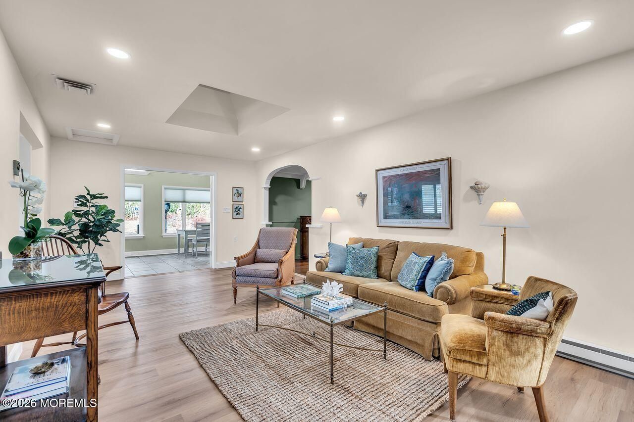Classic coastal home with huge sunroom in sought after Greenbriar I! This tastefully updated 2BR/2BA features a light and bright kitchen w/ white cabinets, quartz counters, s/s appliances, breakfast peninsula, opens to spacious dining area. Updated bathroom with custom cabinetry and marble countertop. Large living room w/ new LVP floors & recessed lighting. Bonus room w/ nautical-inspired millwork. Spacious primary suite with walk in closet and full bath. Enjoy the expansive sunroom with vaulted ceilings, large windows, heated floors and sliders to the patio, perfect for year round nature views. Energy efficient solar panels offset the costs of this all electric home. Renovated garage w/ epoxy floor. Custom millwork, custom plantation shutters, new water heater and central air, new LVP floors in LR & DR. The rooms have all been painted, the only thing left to do is move in! * Lawn has been digitally enhanced. Greenbriar 1 is a hidden gem in Ocean County with low HOA fee and an abundance of activities and events! Community amenities include the clubhouse, 2 pools, fitness center, 6 hole golf course, pickleball, bocce, shuffleboard, ceramics studio, woodshop, clubs, events and much more. Close to Dining, shopping and beaches.
