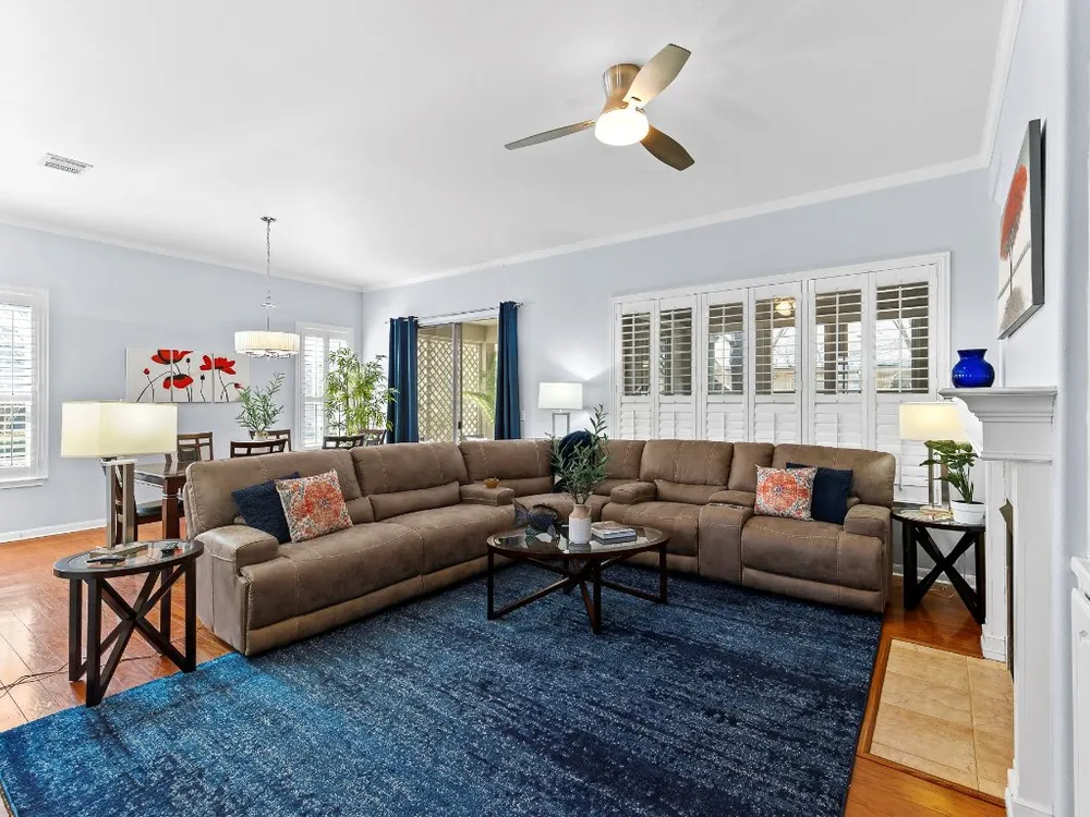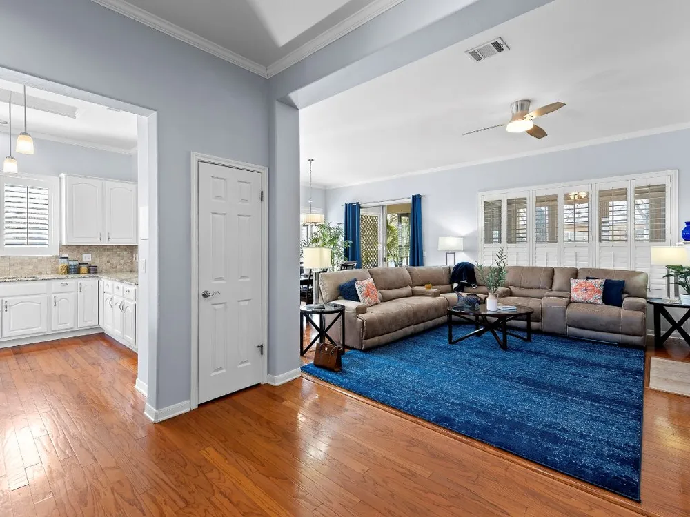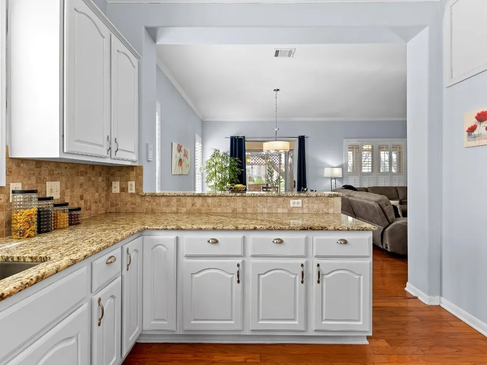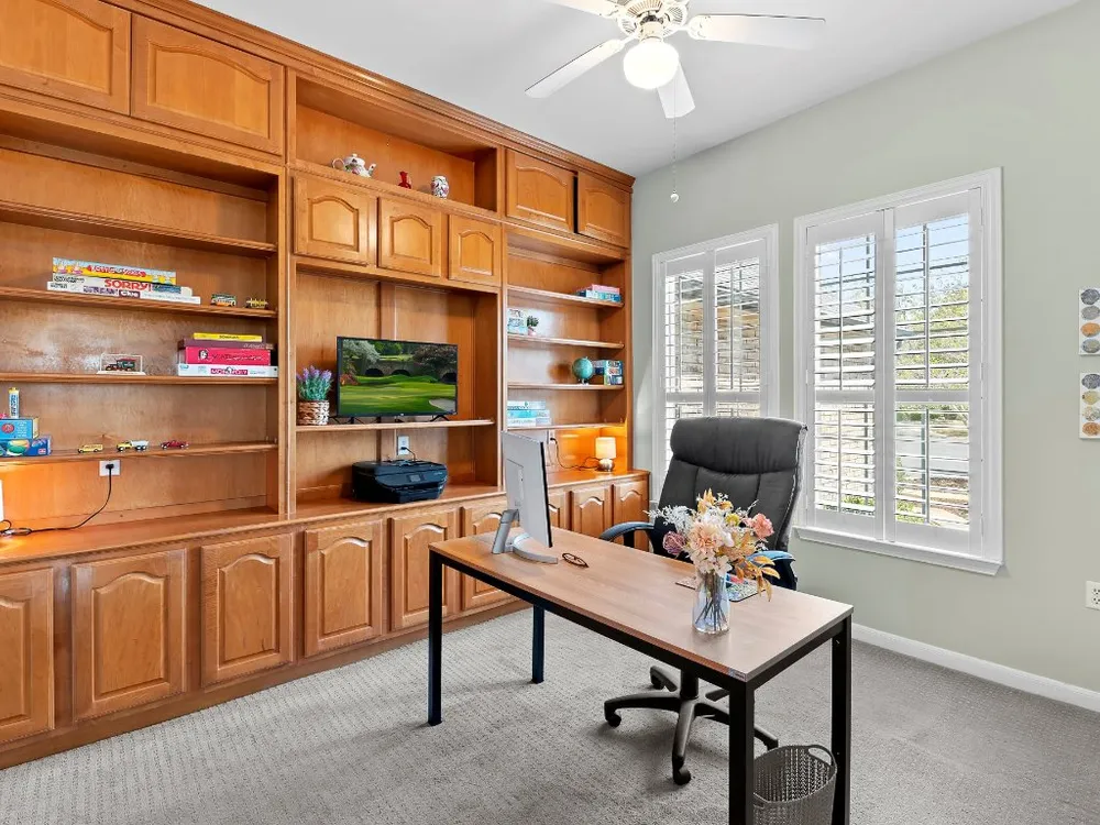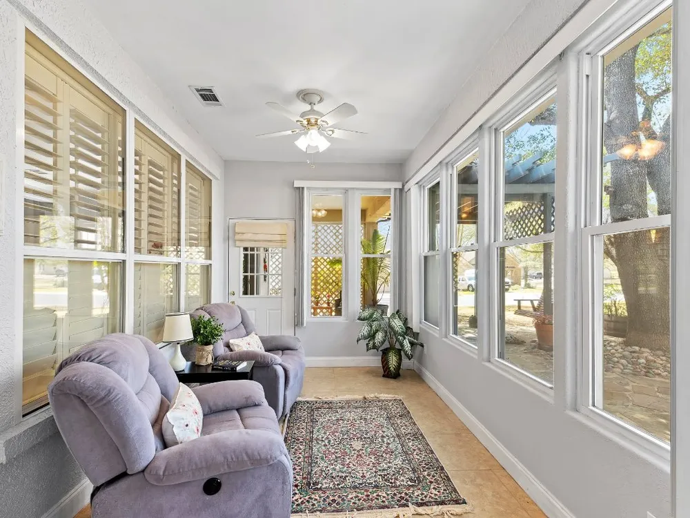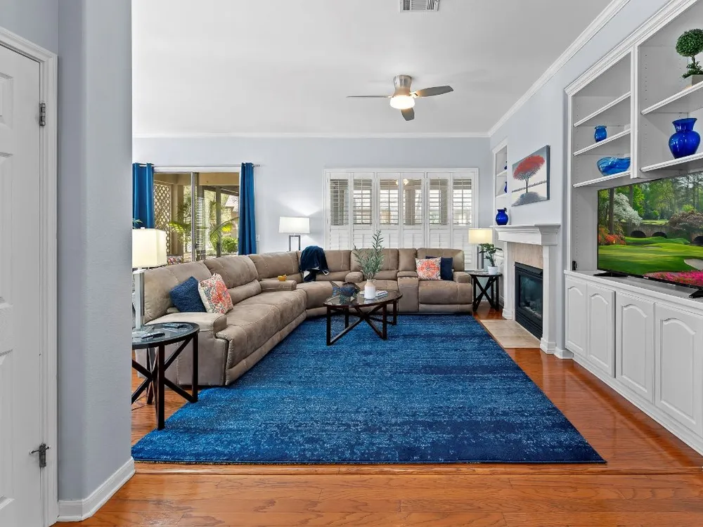 Fantastic price! Located on a charming corner cul-de-sac lot on one of the best streets in Sun City, this Trinity model welcomes you with beautiful wood floors in the main areas, and plantation shutters throughout. Opening the 8 ft solid wood door found in the original Del Webb homes, the full-glass storm door and sidelight provide great natural light in the entry. French doors give privacy to the office, complete with a wall of built-ins, while even more built-ins frame the fireplace in the living room. In the spacious kitchen, rich granite countertops surround the island, and the bay-windowed breakfast room offers a great spot to enjoy your morning coffee. A newer gas range, smart refrigerator and stainless- steel appliances are a bonus! With a welcoming back porch and extended stone patio with pergola providing serene outdoors space, there is plenty of yard left to fence in for a furry friend. Enjoy year-round the heated and cooled sunroom that provides a private retreat just off the primary bedroom. The primary bathroom features dual sinks and a separate soaking tub and shower. Additional shelves in the primary closet will make for easy organization, and with the laundry room relocated to the garage, that extra flex space inside is an ideal home drop-zone or hobby/craft room. NOTE- Seller will return laundry room to inside if buyer desires, with accepted contract. Storage cabinets in the garage, as well as a decked attic, 2022 HVAC, 2025 Water Heater. Don't miss the opportunity to make this home your own! *Home can be sold with furniture, please inquire with agent.*
