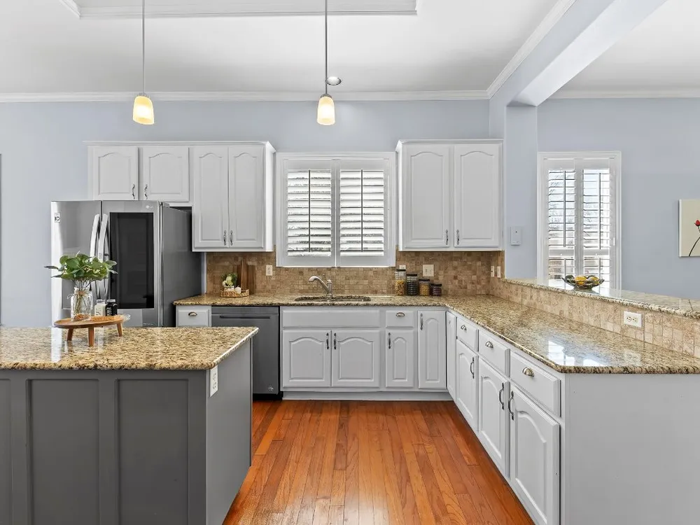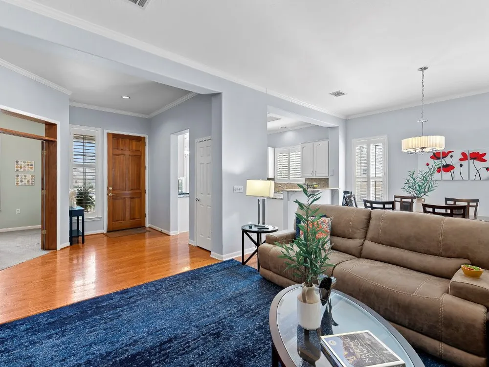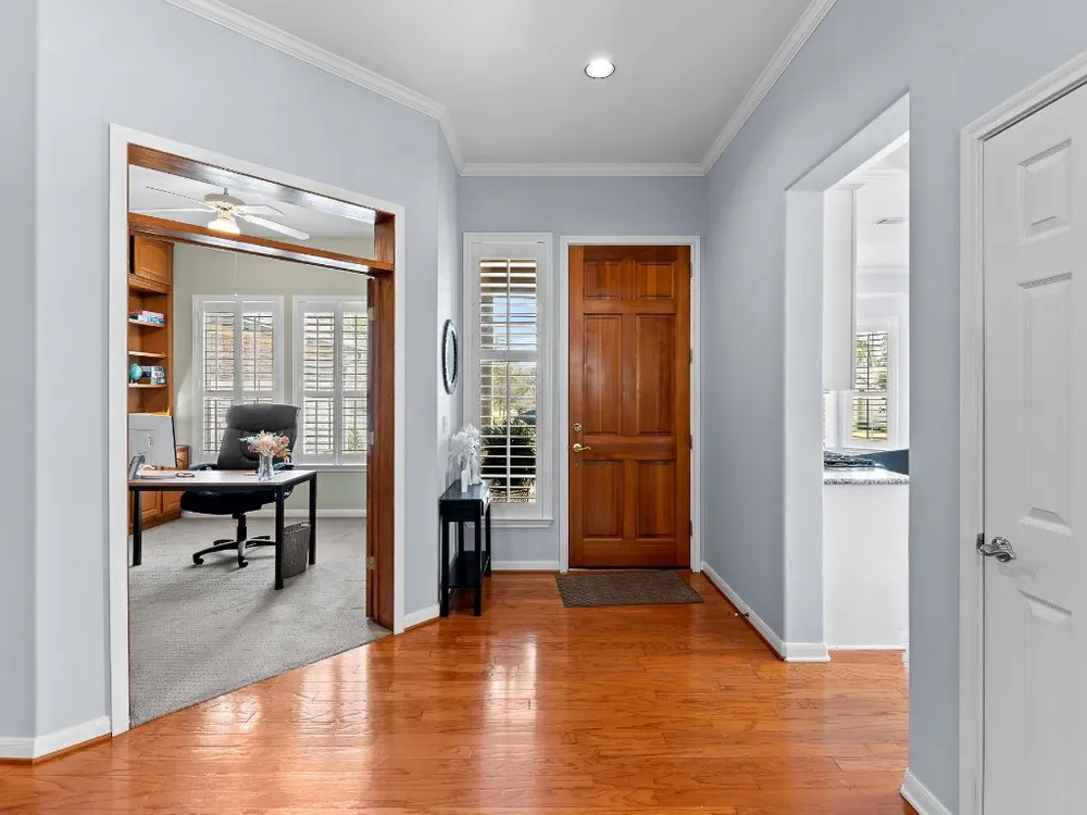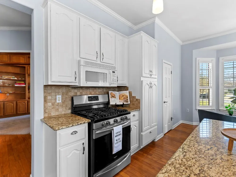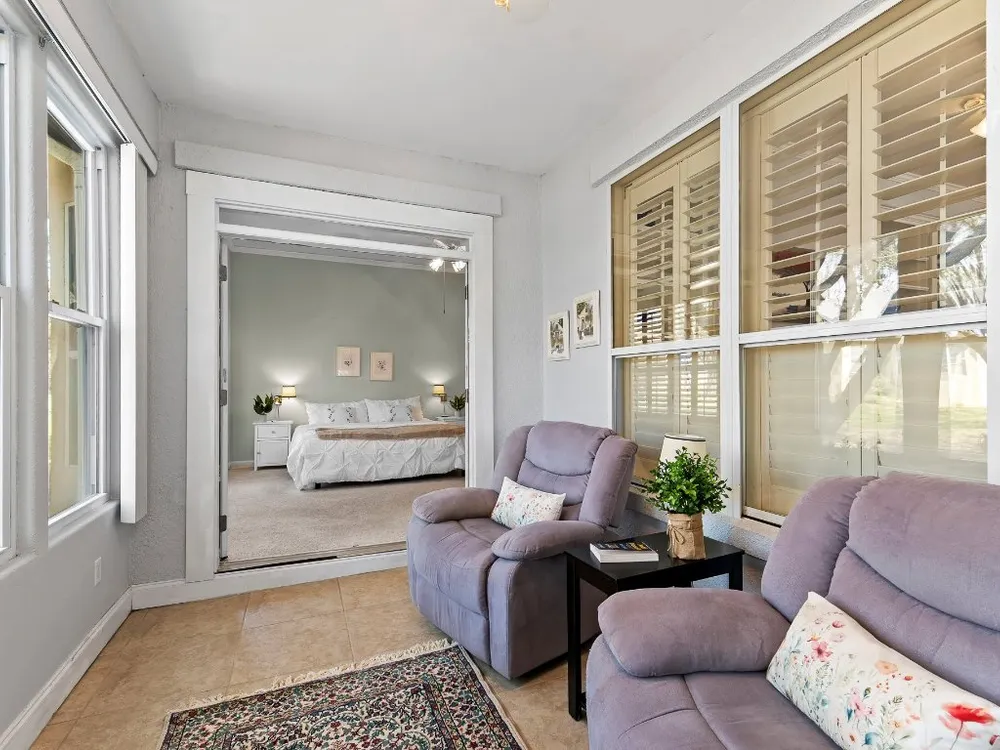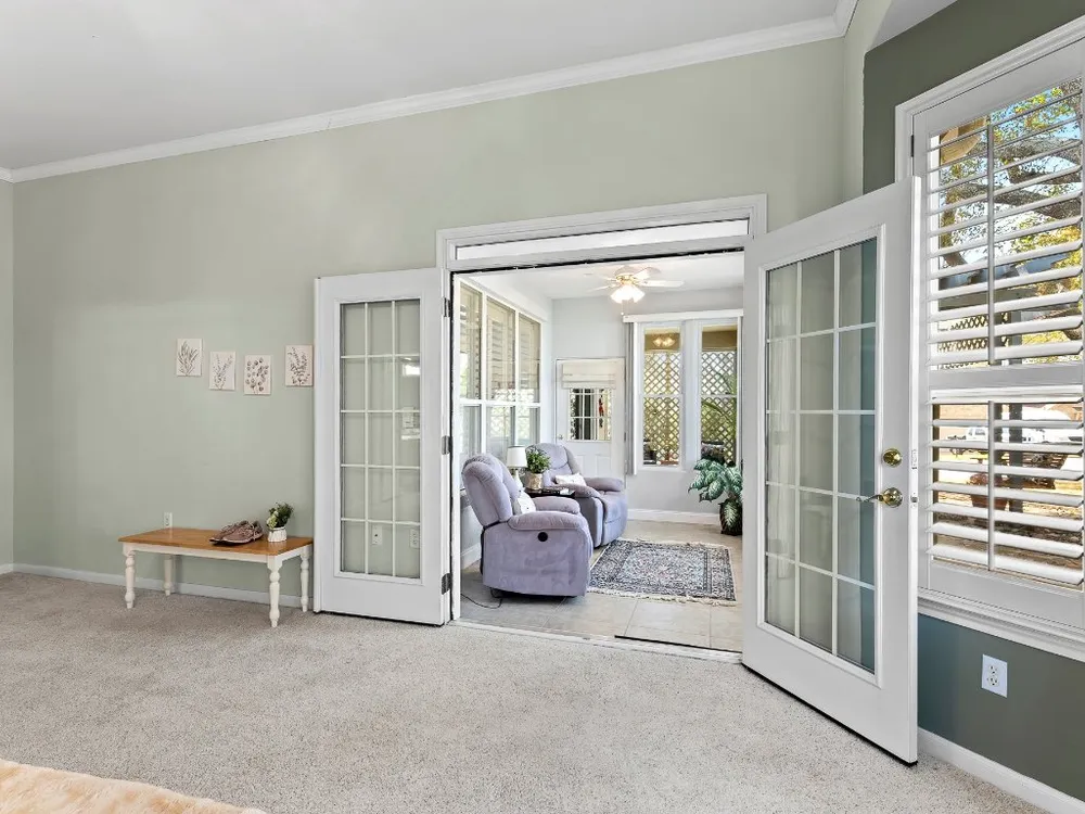 Fantastic price! Located on a charming corner cul-de-sac lot on one of the best streets in Sun City, this Trinity model welcomes you with beautiful wood floors in the main areas, and plantation shutters throughout. Opening the 8 ft solid wood door found in the original Del Webb homes, the full-glass storm door and sidelight provide great natural light in the entry. French doors give privacy to the office, complete with a wall of built-ins, while even more built-ins frame the fireplace in the living room. In the spacious kitchen, rich granite countertops surround the island, and the bay-windowed breakfast room offers a great spot to enjoy your morning coffee. A newer gas range, smart refrigerator and stainless- steel appliances are a bonus! With a welcoming back porch and extended stone patio with pergola providing serene outdoors space, there is plenty of yard left to fence in for a furry friend. Enjoy year-round the heated and cooled sunroom that provides a private retreat just off the primary bedroom. The primary bathroom features dual sinks and a separate soaking tub and shower. Additional shelves in the primary closet will make for easy organization, and with the laundry room relocated to the garage, that extra flex space inside is an ideal home drop-zone or hobby/craft room. NOTE- Seller will return laundry room to inside if buyer desires, with accepted contract. Storage cabinets in the garage, as well as a decked attic, 2022 HVAC, 2025 Water Heater. Don't miss the opportunity to make this home your own! *Home can be sold with furniture, please inquire with agent.*