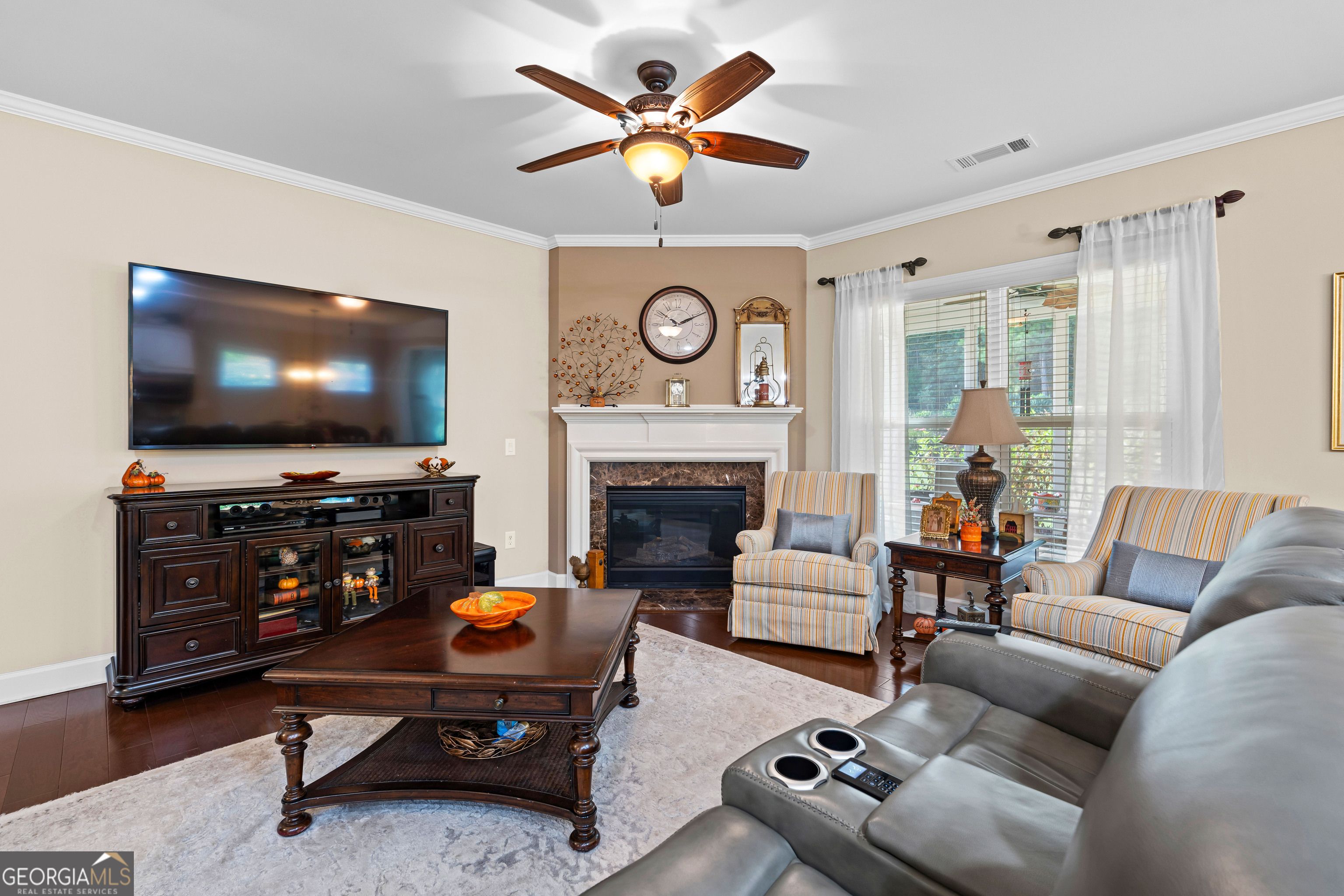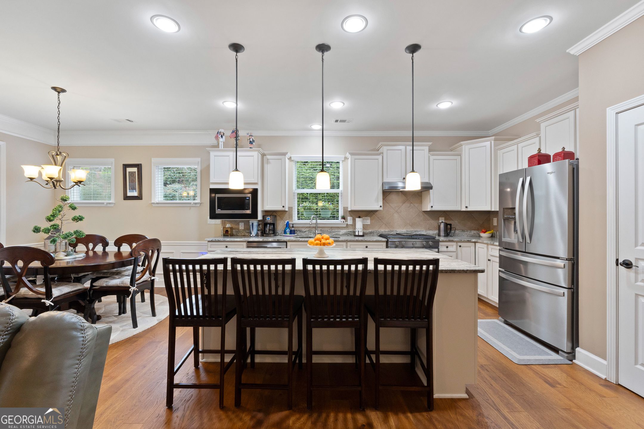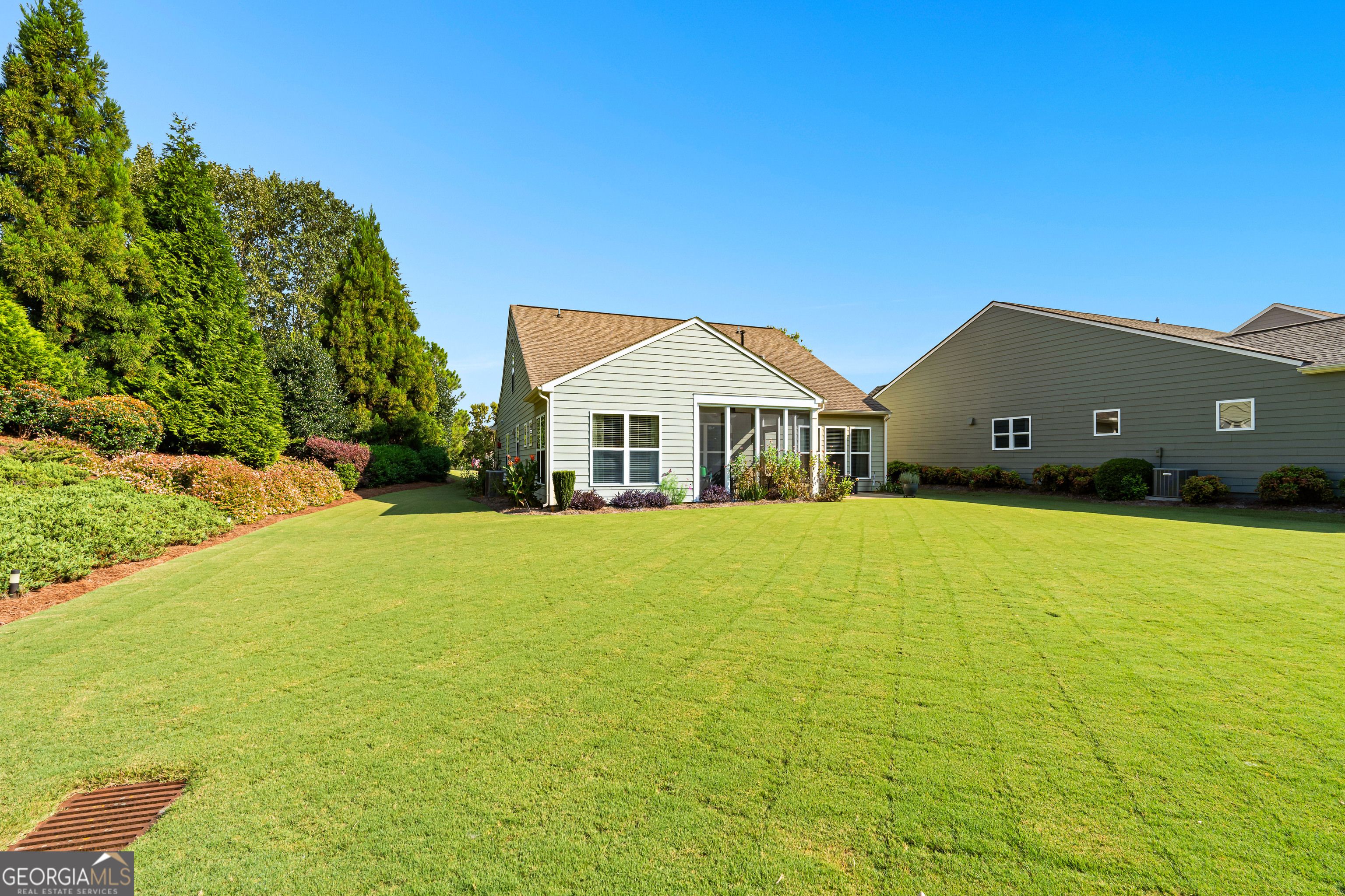 Welcome home to elegance in this 3 bedroom, 3 bathroom Abbeyville plan. This home sits beautifully on one of the most desired and meticulously landscaped lots in the neighborhood. The inviting front porch is detailed with polished concrete-stone and beadboard ceilings, leading inside to a charming foyer and into the open family room and chef's kitchen with leathered granite and brand-new hardwood flooring throughout. Custom-built out closets and pantry make storage plentiful. Floor to ceiling tile in the primary bathroom with amazing closet with custom storage. Loft area with bedroom and full bathroom is perfect for guests or in-laws. The screened-in sunroom looks out to the lush, oversized backyard, which feels like your own private oasis. The garage is complete with a screened garage door and walk-up stairs to extra loft storage with flooring and shelving. This home has been exceptionally well-maintained and is located in the premier Sun City Peachtree, a 24-hour guard-gated community where active adults embrace a refined, amenity-rich lifestyle and enjoy endless opportunities for leisure and connection.