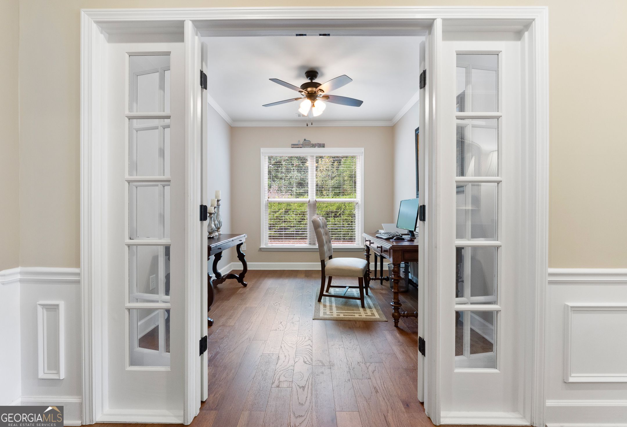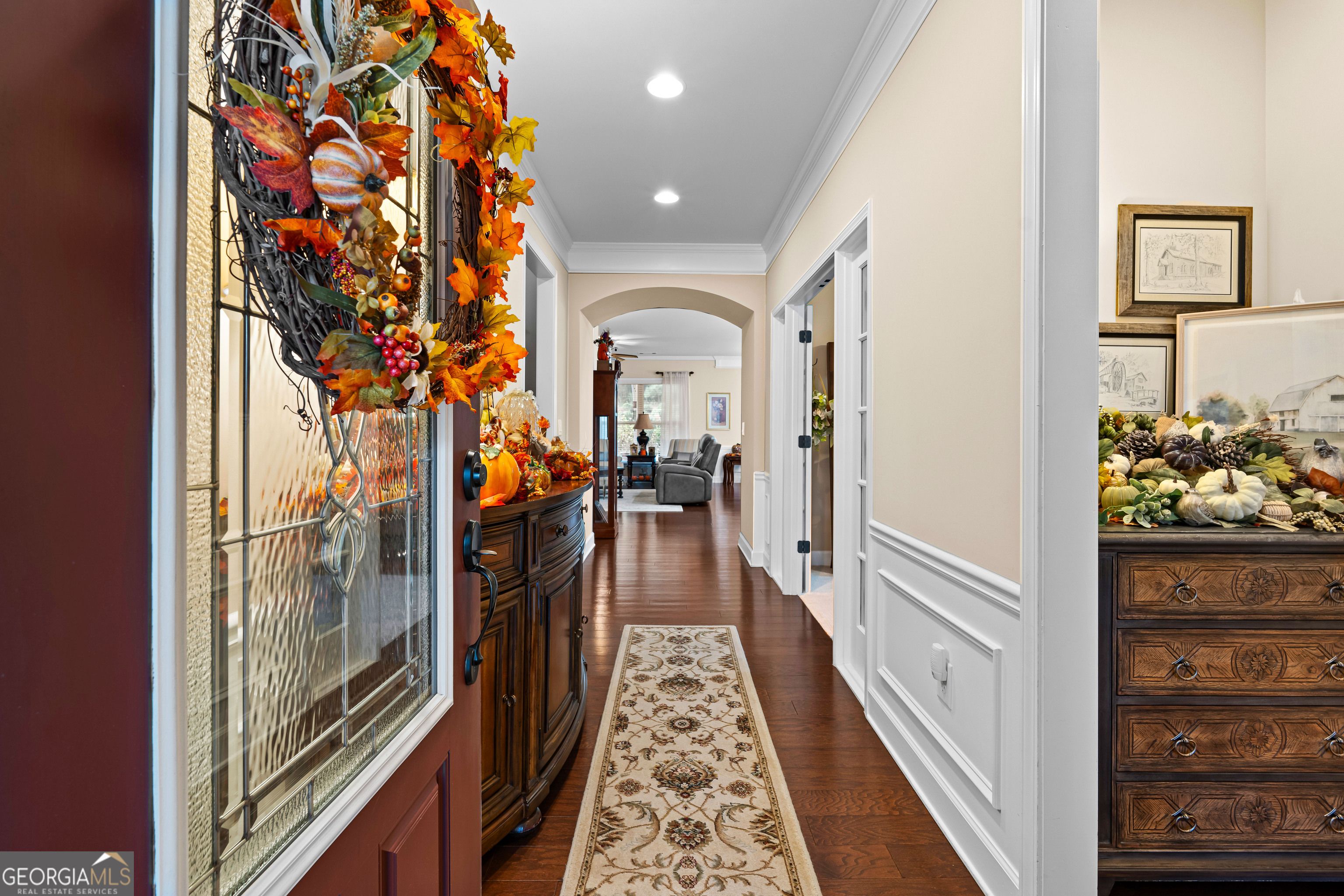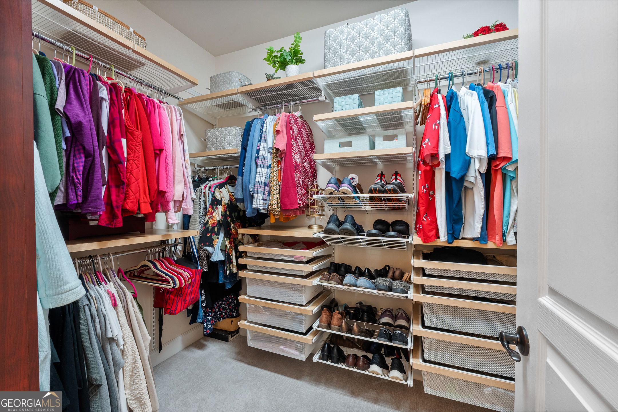Welcome home to elegance in this 3 bedroom, 3 bathroom Abbeyville plan. This home sits beautifully on one of the most desired and meticulously landscaped lots in the neighborhood. The inviting front porch is detailed with polished concrete-stone and beadboard ceilings, leading inside to a charming foyer and into the open family room and chef's kitchen with leathered granite and brand-new hardwood flooring throughout. Custom-built out closets and pantry make storage plentiful. Floor to ceiling tile in the primary bathroom with amazing closet with custom storage. Loft area with bedroom and full bathroom is perfect for guests or in-laws. The screened-in sunroom looks out to the lush, oversized backyard, which feels like your own private oasis. The garage is complete with a screened garage door and walk-up stairs to extra loft storage with flooring and shelving. This home has been exceptionally well-maintained and is located in the premier Sun City Peachtree, a 24-hour guard-gated community where active adults embrace a refined, amenity-rich lifestyle and enjoy endless opportunities for leisure and connection.