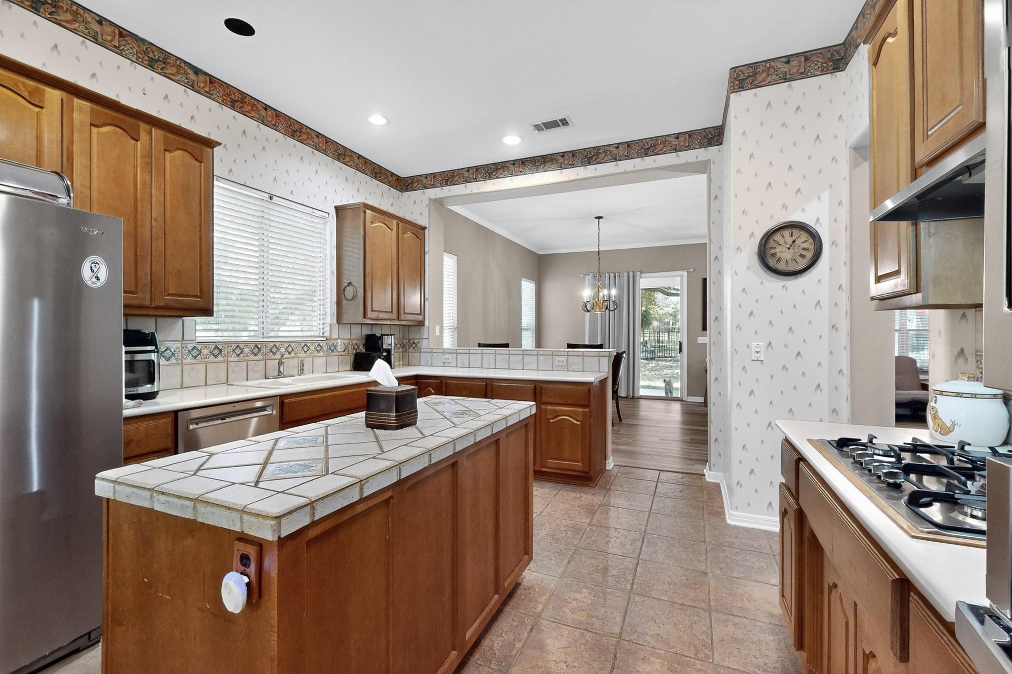 This upgraded popular Trinity floor plan offers 1,915 sq. ft. with 2 spacious bedrooms, 2 full bathrooms, and a dedicated study/office. Sitting on a gorgeous .27-acre corner lot, the home is surrounded by beautiful mature oak trees. Inside, the open layout connects the living, dining, and kitchen areas seamlessly. The living room features a gas log fireplace with built-in cabinetry and crown molding, and the wall-mounted TV convey. The kitchen is well-appointed with new stainless-steel appliances, including a gas cooktop, built-in oven, microwave, and refrigerator. A center island and bay window dining nook make it a bright, functional space, while a bar-top counter opens to the formal dining area with sliding doors leading to a large covered back patio. The backyard is fully fenced with wrought iron, perfect for pets, and shaded by beautiful oak trees recently trimmed to encourage new grass growth. The spacious laundry room with washer and dryer (less than 2 years old), plus a stand-up freezer can convey. Updates include Luxury Vinyl Plank flooring throughout. The primary suite is generous in size with a bay window, room for large furniture and a relaxing ensuite featuring dual vanities, a walk-in shower, and soaking tub. Tall ceilings throughout make this home feel spacious and open. Sun City residents enjoy a vibrant 55+ community with planned activities, clubs, golf courses, multiple fitness centers, and pools. Seller is willing to offer the buyer a 2-1 Rate Buydown for Buyers . Ask me for details.