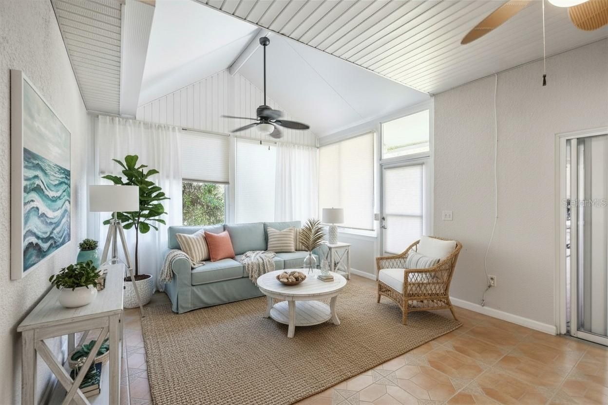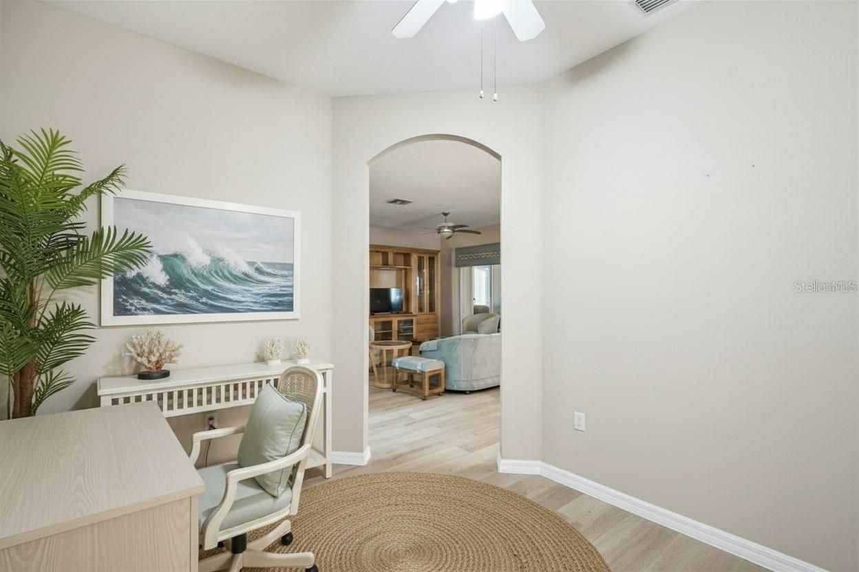 One or more photo(s) has been virtually staged. Price Reduction! This beautiful 2 bedroom, 2 bathroom home with a den/study offers the highly desired Sonata floor plan, situated across from a green space and just steps from a neighborhood pool. Featuring brand new luxury vinyl plank flooring throughout, this home offers an open and welcoming layout with a spacious living and dining area. The kitchen includes a breakfast nook, pantry, and a slider leading to the tiled 4-season lanai, providing additional year-round living and relaxation space. The primary suite includes private lanai access, a large custom walk-in closet, and an en-suite bathroom with a large walk-in shower and knee-space vanity for makeup or grooming. The guest bedroom is conveniently located near the full guest bathroom and includes a ceiling fan for comfort. A den/study provides flexible use for an office, hobby room, or extra guest space. Additional features include a laundry room, and a 2-car garage equipped with pull-down stairs for attic access, and extra storage space. Solar panels help keep electricity costs low. The exterior was painted in 2023, and the roof was replaced in 2016 for added peace of mind. This home offers comfort, value, and convenience in a fantastic location—move-in ready and easy to love. All this in one of the top 55+ communities in America. Solivita offers residents access to state of the art amenities and work out facilities, dance and aerobics studios, a business center, 14 heated swimming pools, 2 heated spas, tennis courts, pickleball courts, shuffleboard, bocce ball, billiards room, art gallery, 3 restaurants and 2 championship 18-hole golf courses, driving range and putting course. Every day offers something new to explore and enjoy! This home also features easy access to nearby shops, dining, and health care, offering the perfect balance of privacy and lifestyle. Don't miss out on the opportunity to have a first class lifestyle. All this in one of the top 55+ communities in America. Solivita offers residents access to state of the art amenities and work out facilities, dance and aerobics studios, a business center, 14 heated swimming pools, 2 heated spas, tennis courts, pickleball courts, shuffleboard, bocce ball, billiards room, art gallery, 3 restaurants and 2 championship 18-hole golf courses, driving range and putting course. Every day offers something new to explore and enjoy! This home also features easy access to nearby shops, dining, and health care, offering the perfect balance of privacy and lifestyle. Don't miss out on the opportunity to have a first class lifestyle.