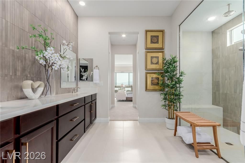 BEAUTIFULLY UPGRADED home at Lake Las Vegas. This residence offers panoramic lake vistas and views galore, wrap-around sliding doors, and 24” tile flooring throughout the main living areas. The chef’s kitchen features an executive island, LED-lit cabinetry, double ovens, and a 48” built-in KitchenAid refrigerator. Enjoy a fully tiled AV niche with accent lighting, a 6-speaker surround sound system, and a built-in desk in the den. The expanded dining area and primary suite include designer touches such as an accent wall, upgraded carpet/padding, and a decorated powder room with batten board detailing. Additional upgrades include extended laundry cabinetry with backsplash, dining room & primary bedroom extended an additional 2 ft., wainscoting in the entry, all under elegantly designed 12 ft. ceilings, courtyard gate and lighting, intimate landscaping, and epoxy-coated garage floors. Located in a premier 55+ community with a private rec center, two pools, pet park and pickleball courts.