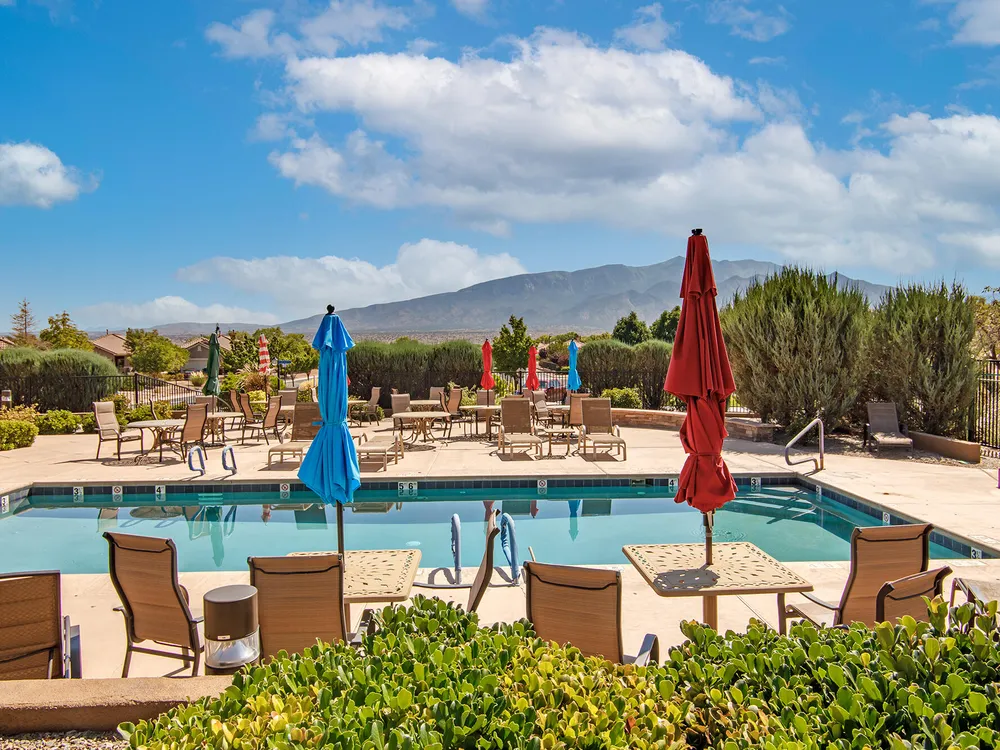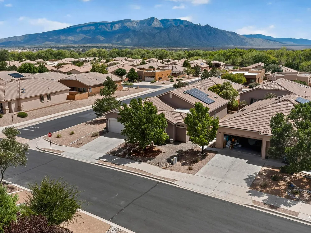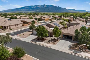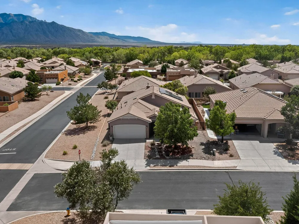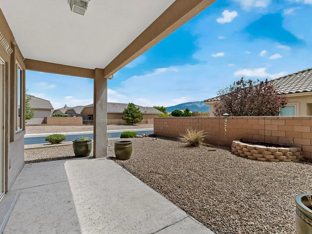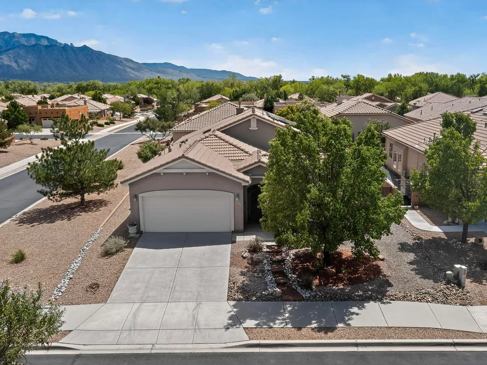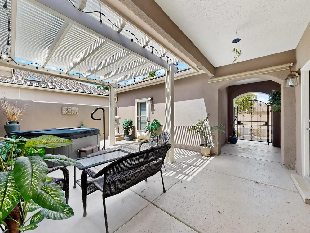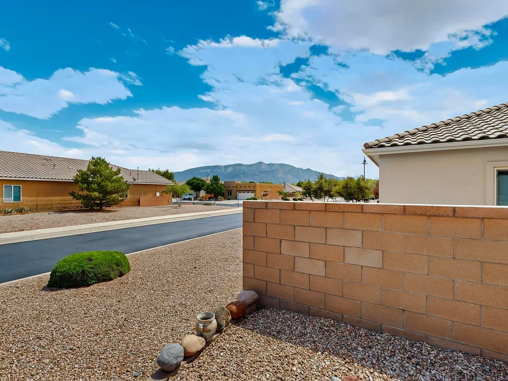 Discover this corner-lot beauty in Alegria, Del Webb's premier 55+ community in NM. Enjoy Sandia Mountain views from the living room and patio, plus a courtyard with custom gate, pergola, and hot tub. The main home offers 2 bedrooms, 2 baths, and upgrades like owned solar, 42'' upper kitchen cabinets, fireplace, and water softener. The highlight is the private casita with full bath--perfect for guests, family, or a hobby retreat. Alegria residents enjoy gated entry, clubhouse, fitness center, pools, walking paths, and an active social calendar. Style, efficiency, and flexibility come together in this exceptional home.