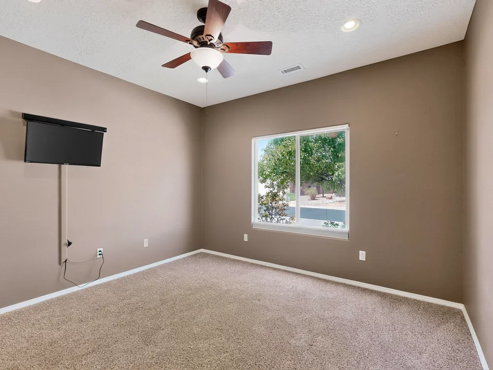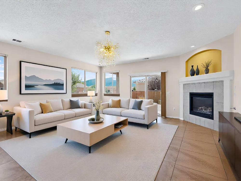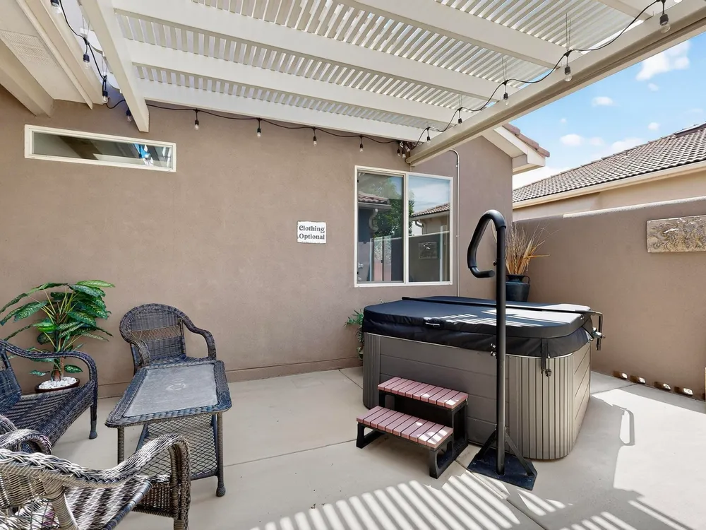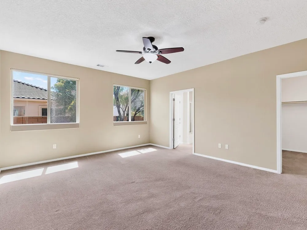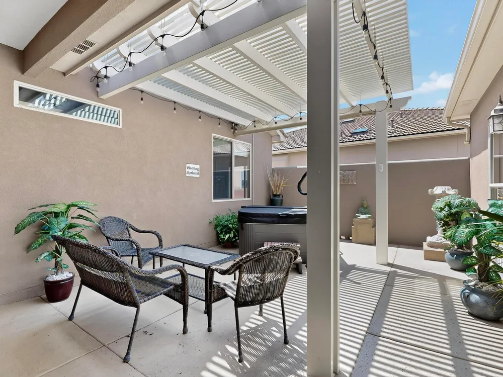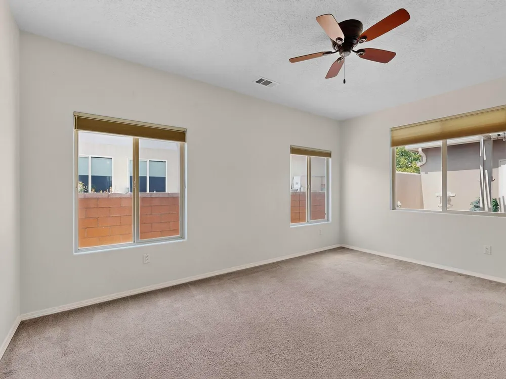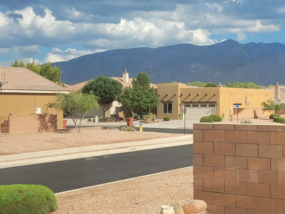 Discover this corner-lot beauty in Alegria, Del Webb's premier 55+ community in NM. Enjoy Sandia Mountain views from the living room and patio, plus a courtyard with custom gate, pergola, and hot tub. The main home offers 2 bedrooms, 2 baths, and upgrades like owned solar, 42'' upper kitchen cabinets, fireplace, and water softener. The highlight is the private casita with full bath--perfect for guests, family, or a hobby retreat. Alegria residents enjoy gated entry, clubhouse, fitness center, pools, walking paths, and an active social calendar. Style, efficiency, and flexibility come together in this exceptional home.