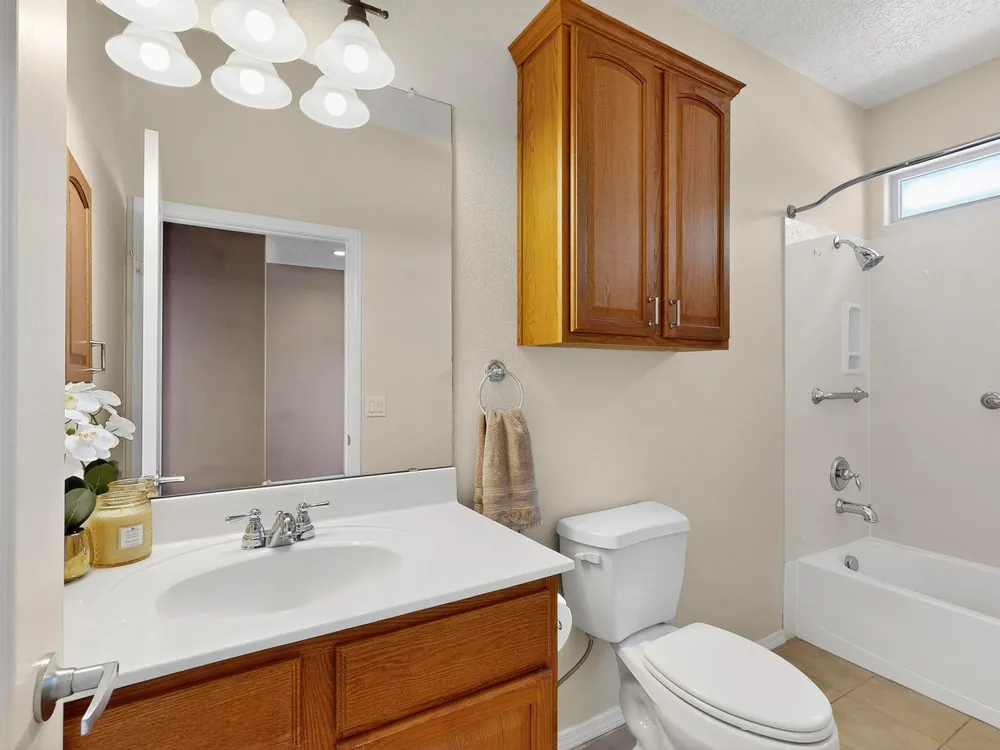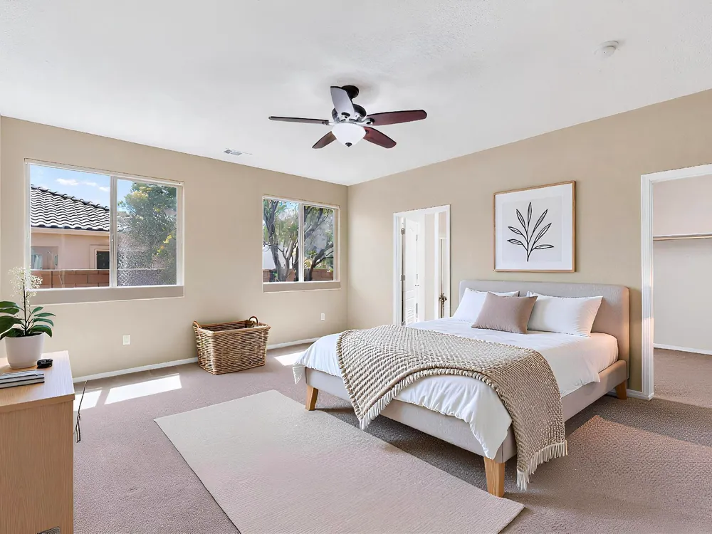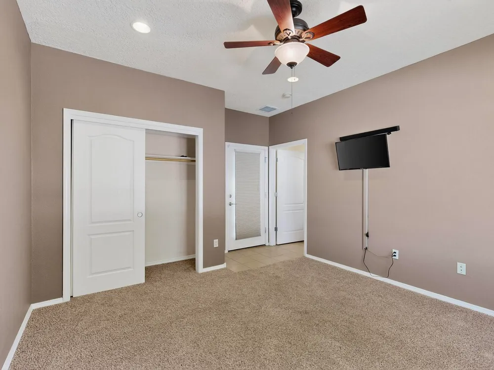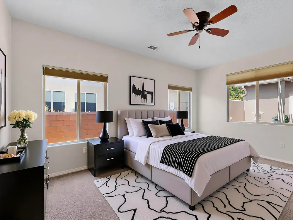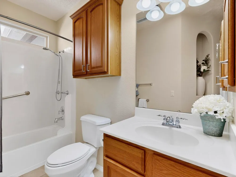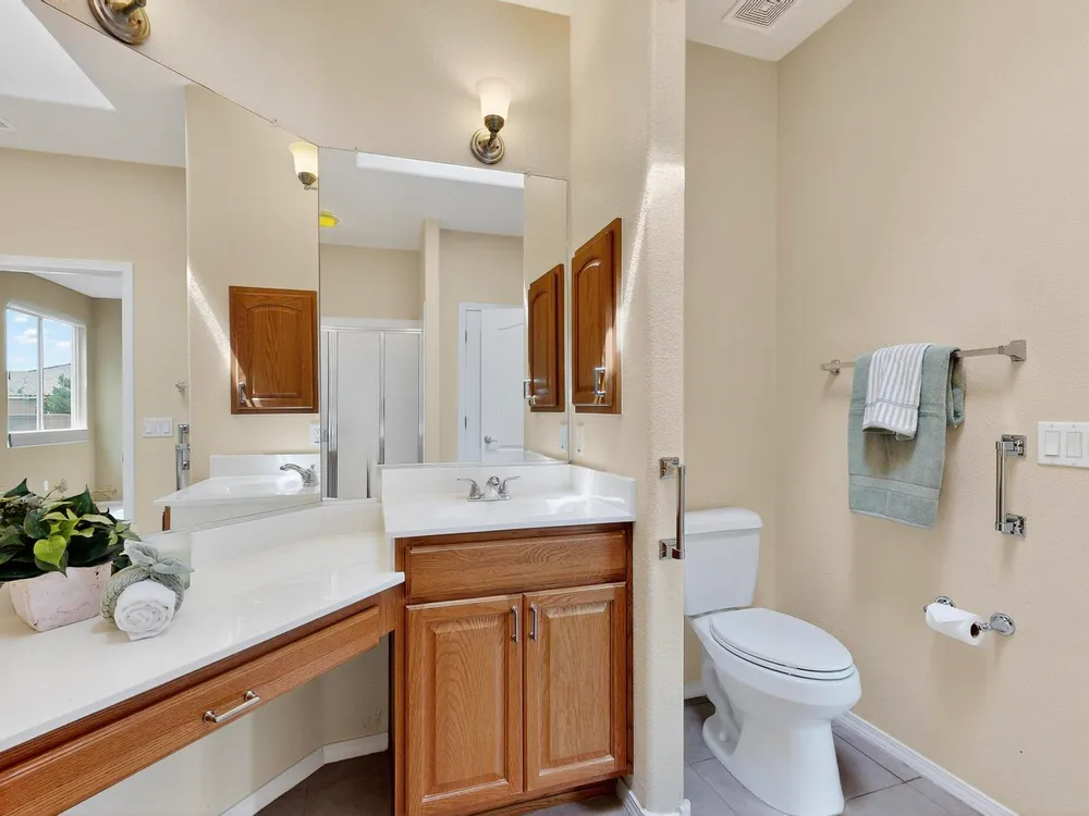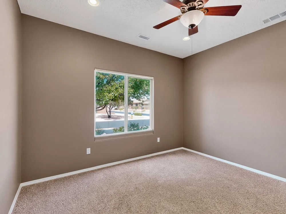 Discover this corner-lot beauty in Alegria, Del Webb's premier 55+ community in NM. Enjoy Sandia Mountain views from the living room and patio, plus a courtyard with custom gate, pergola, and hot tub. The main home offers 2 bedrooms, 2 baths, and upgrades like owned solar, 42'' upper kitchen cabinets, fireplace, and water softener. The highlight is the private casita with full bath--perfect for guests, family, or a hobby retreat. Alegria residents enjoy gated entry, clubhouse, fitness center, pools, walking paths, and an active social calendar. Style, efficiency, and flexibility come together in this exceptional home.