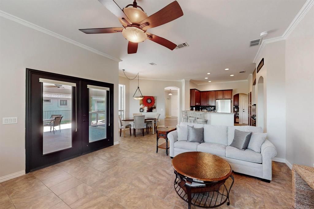 Discover the charm and comfort of this beautifully upgraded Milano floorplan, complete with a separate side golf cart garage and set on a serene greenbelt lot. This home boasts a truly one-of-a-kind steel roof with composite overlay, installed in 2009 and backed by a 50-year transferable warranty—a rare and valuable feature.Step through the flagstone courtyard and into the thoughtfully remodeled interior. The chef-inspired kitchen features granite countertops, roll-out shelves, a Blanco sink, electric oven, gas cooktop with griddle, and a custom decorative arch with accent lighting. A high-top breakfast bar with seating makes it perfect for casual dining or entertaining.The light-filled living room offers a cozy fireplace, ceiling fan, and seamless access to the extended covered patio, ideal for indoor-outdoor living.The spacious primary suite includes a bay window with greenbelt views, tray ceiling, ceiling fan, heated bathroom floors, dual vanities, and two custom closets. The guest bedroom is equally versatile with a built-in desk, cabinetry, and a queen-size Murphy bed, perfect for visitors or flex space.Step outside to your entertainer’s backyard, featuring an outdoor kitchen with sink, oversized covered patio, lush landscaping, and a fenced yard overlooking the greenbelt and walking path.Additional highlights include a dedicated office space, laundry room with sink, 20-amp breaker box, sump pump, central vacuum system, tankless water heater (2014), and HVAC system (2023).This home offers the ideal blend of luxury, functionality, and peace of mind—don’t miss this exceptional opportunity!