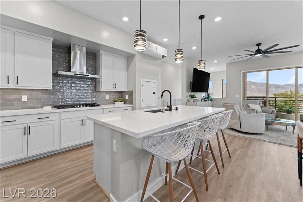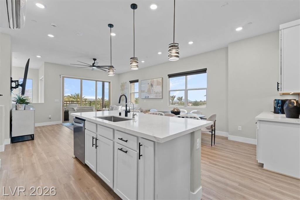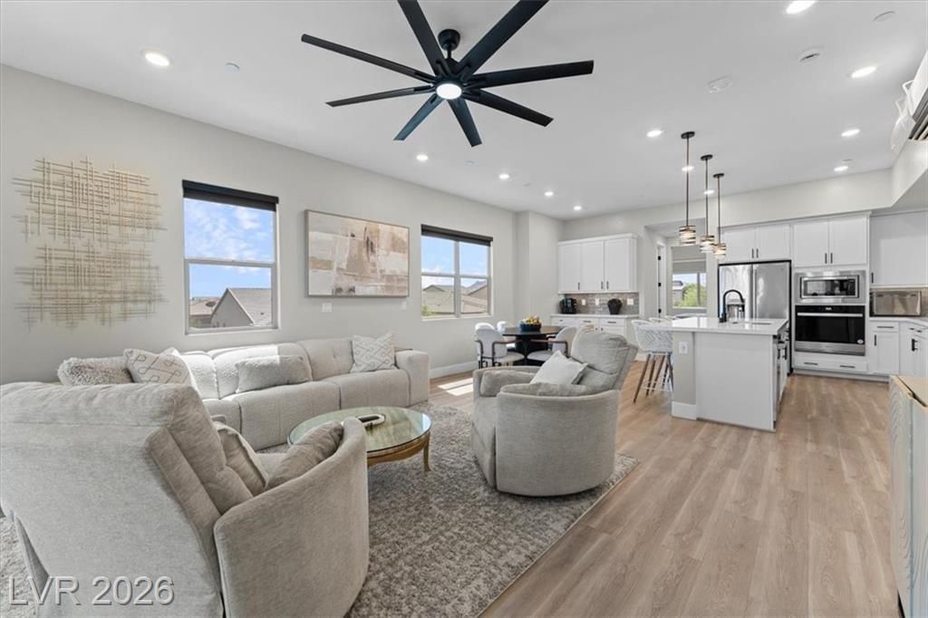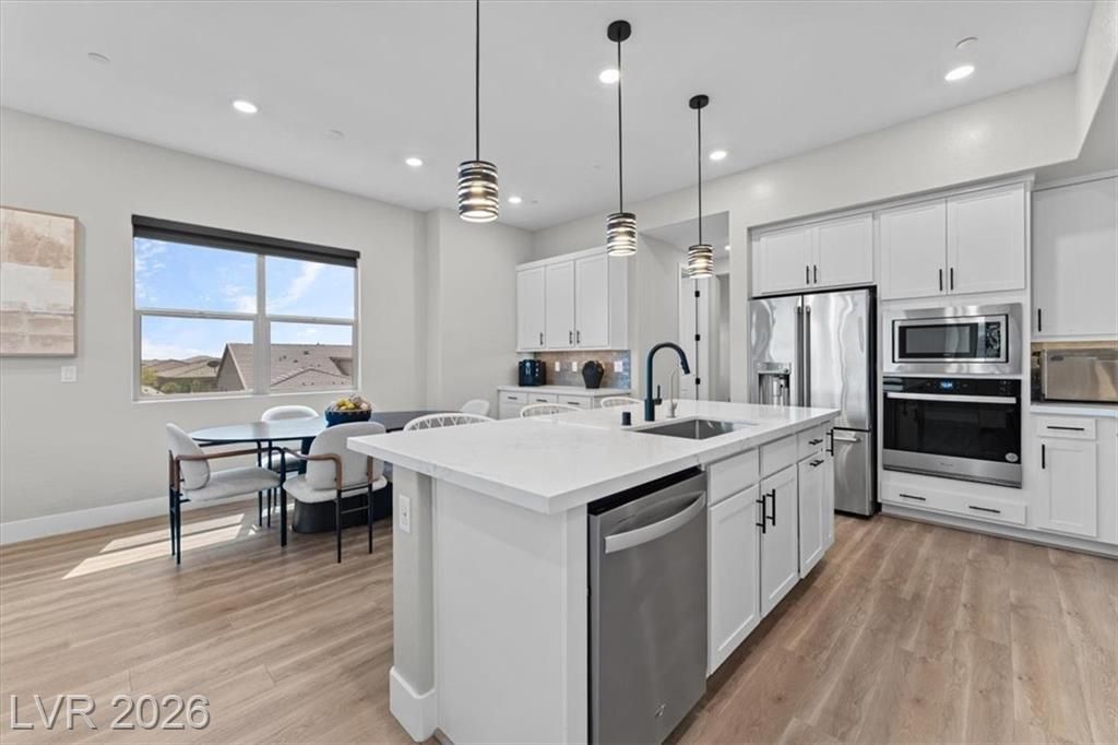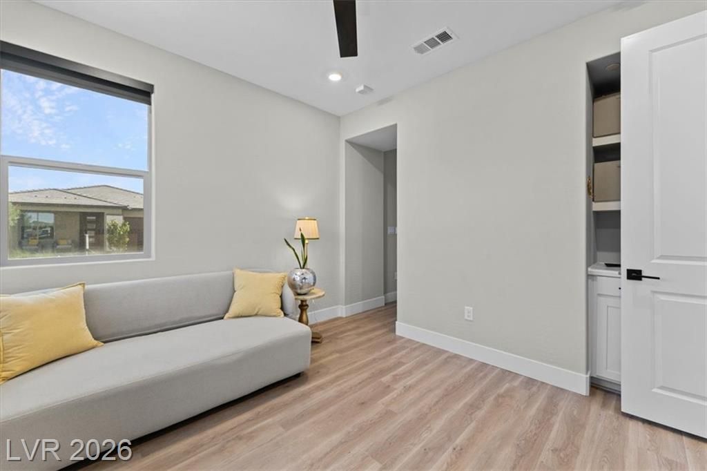Step into effortless condo living where luxury meets simplicity, no maintenance, no fuss. This upgraded residence features approximately $150,000 in builder upgrades, offering elevated finishes throughout. Located just a one minute walk from the community center, pool, and on site bar and restaurant, resort style amenities are right at your doorstep. Enjoy views of the Las Vegas Strip, or escape the heat with a quick 30 minute drive to Mount Charleston.Situated in the highly sought after Sunstone Master Plan, this home is part of Trilogy Sunstone, a premier 55+ community known for its resort style living and vibrant atmosphere. Demand is high, with buyers currently on a waitlist lottery for condos not completing until 2027, making this a rare, move in ready opportunity. Residents enjoy access to the Cabochon Club, a 15,000 sqft resort-style clubhouse with social spaces, events, and amenities designed for an active lifestyle.