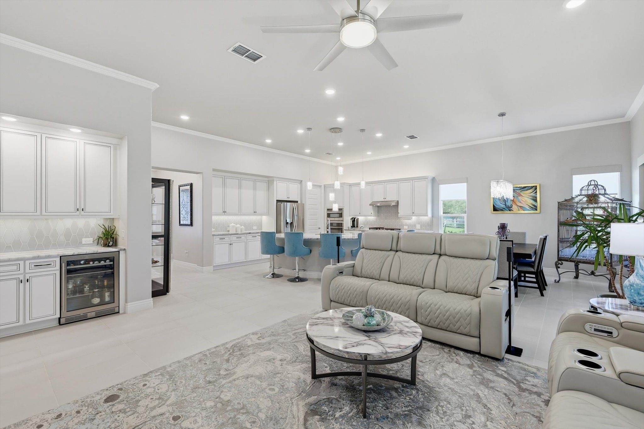 Discover this beautifully upgraded Larkspur model—better than new and ready for you! This thoughtfully designed home features 2 bedrooms, each with its own ensuite bath, plus a convenient half bath for guests. A versatile den and generously sized ( 21 x 9.5 ) hobby room give you all the space you need for work or play. Throughout the home, you’ll find custom touches that truly set it apart. Rich woodwork frames the cozy, electric fireplace, while elegant Dolomite counters elevate the kitchen, dry bar, and primary bath. Remote-controlled shades in the living room and primary suite let you adjust the light with ease, and plantation shutters add timeless style to the guest bedroom, den, and hobby room. Entertain effortlessly in the open-concept living area, complete with a dry bar and wine fridge—perfect for gatherings large or small. Step outside to an approximately 30' covered patio with full remote-controlled screens, pre-wired for a fan and TV, and an extra gas bib ready for your grill. Ideally located near the Robson Ranch entrance and I-35W, you’ll have quick access to shopping, dining, and all the amenities of this vibrant active adult community—including golf, tennis, pickleball, bocce ball, a fitness center, indoor and lagoon pools, plus countless clubs and activities. This home is loaded with upgrades and ready to welcome you. Come see it today and start your next adventure at Robson Ranch! * All information is deemed reliable but is not guaranteed and should be independently verified *