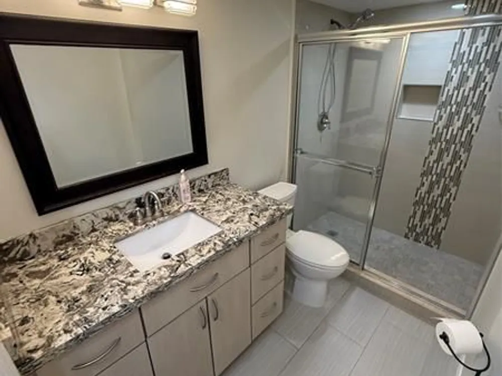 Move-in ready, freshly updated condo has 1-bedroom with walk-in closet, 2 bathrooms, has convertible room that could be used as a guest area, office, or use it to meet your specific needs. Both bathrooms have showers with waterfall tile design. Quartz countertops - bathrooms and kitchen. Stylish kitchen with neutral color cabinetry, stainless steel appliances, & stackable washer/dryer. All floors have continuous tile design. Dining & Living room combined - looks out to the screened patio. Colony Point is a Housing for Older Persons Act community with a guard gated entrance. Amenities include clubhouse, exercise room, pool, courtesy bus service, in-house property manager, unit - 1 assigned parking spot. Nearby Shopping, Restaurants and a Hospital. *As-Is with Right to Inspect.