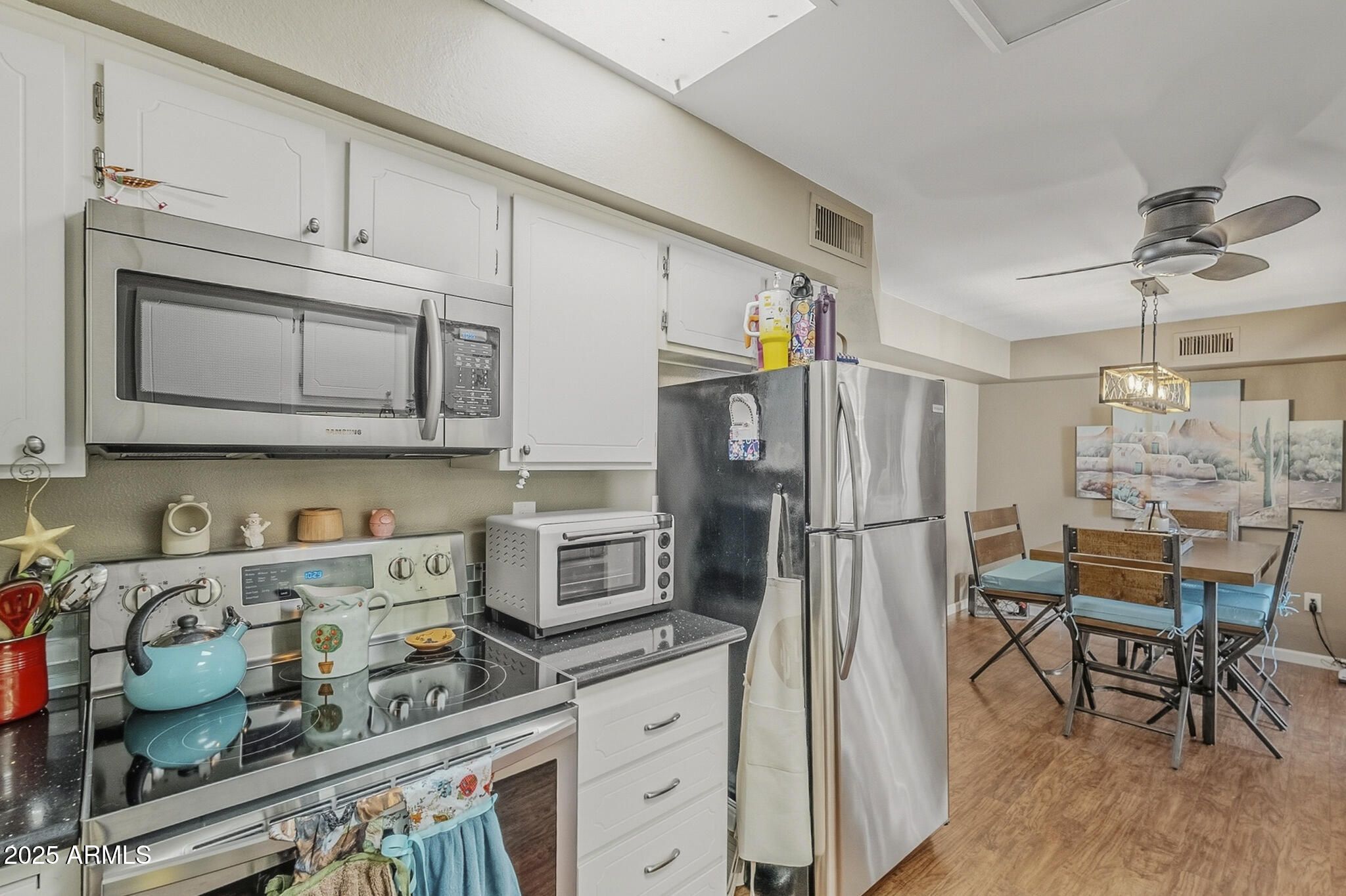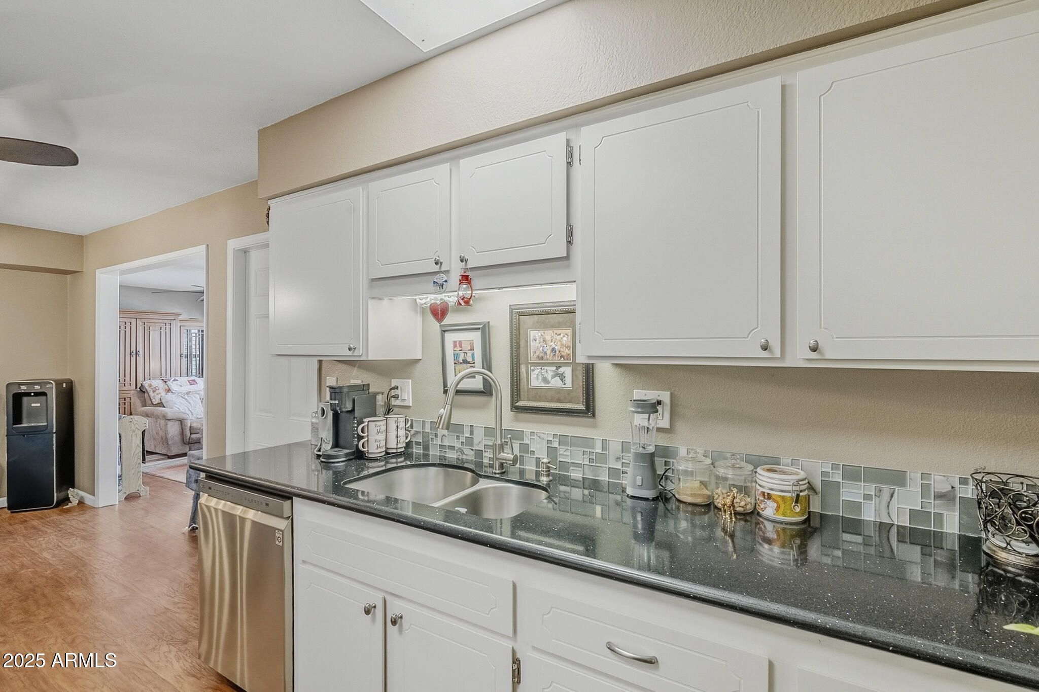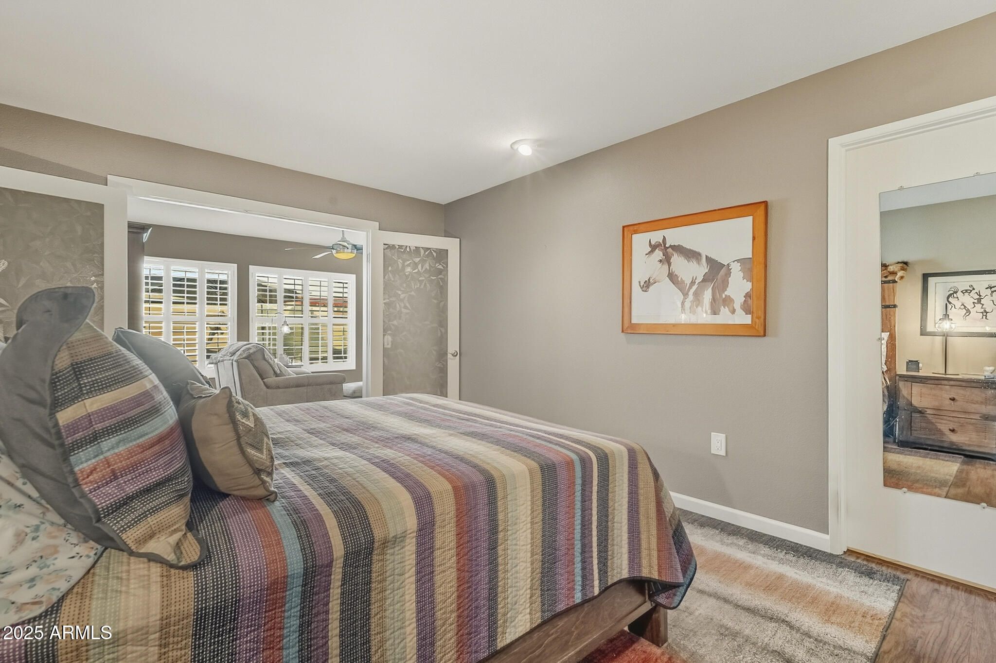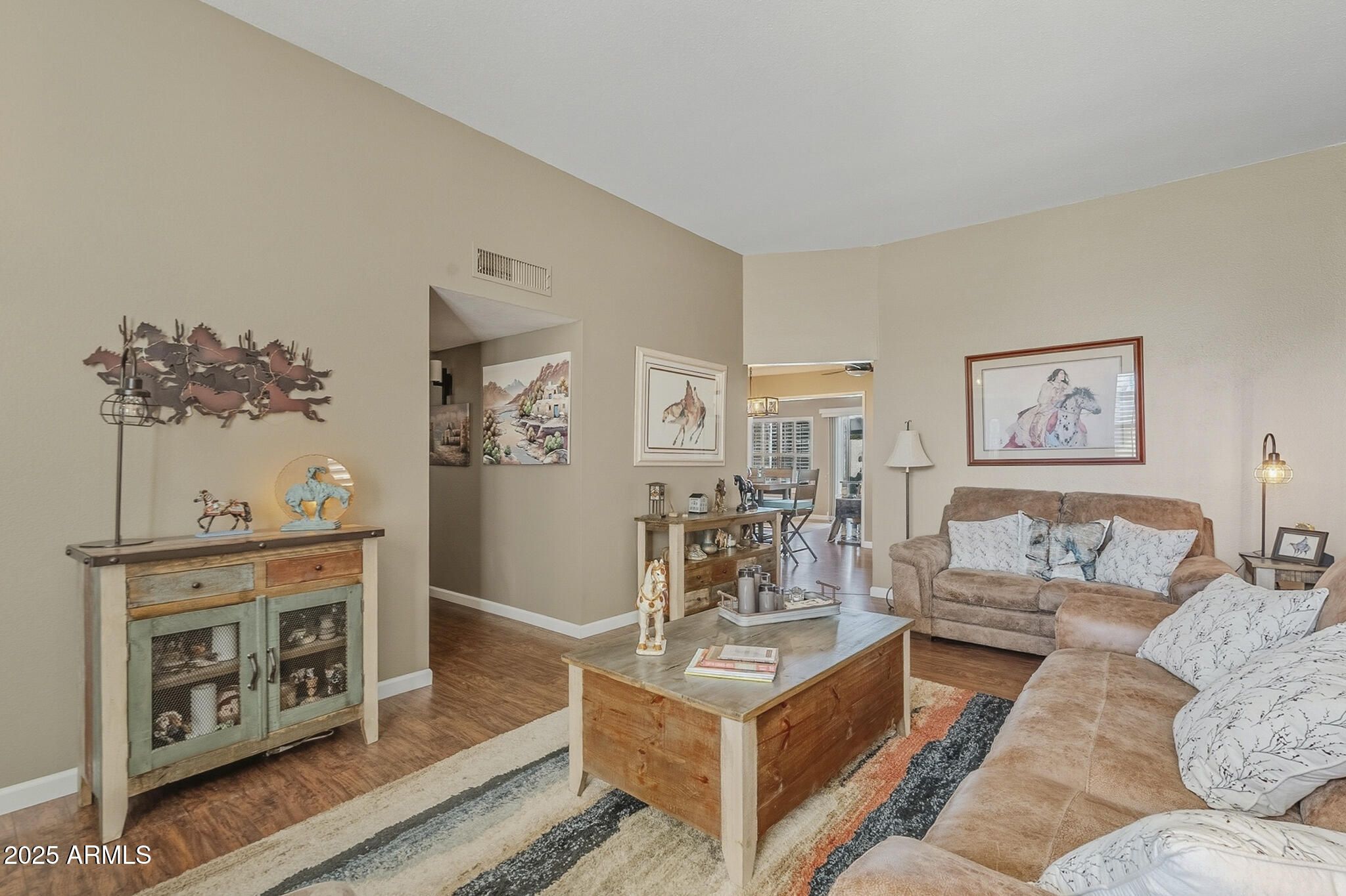 Step into this beautifully maintained home featuring a neutral color palette that complements any décor style. The spacious layout boasts 9+ foot ceilings, enhancing the open and airy feel throughout. Engineered wood flooring flows seamlessly through the main living areas, adding warmth and sophistication. Enjoy natural light and privacy with plantation shutters on the windows. The dining room is perfect for entertaining, while the inviting Arizona room offers a cozy retreat for year-round enjoyment. Outdoors, the fully block-fenced patio provides a private oasis, complete with pavers for easy maintenance and a polished look. Whether you're relaxing or hosting guests, this space is ideal for enjoying Arizona's beautiful weather.