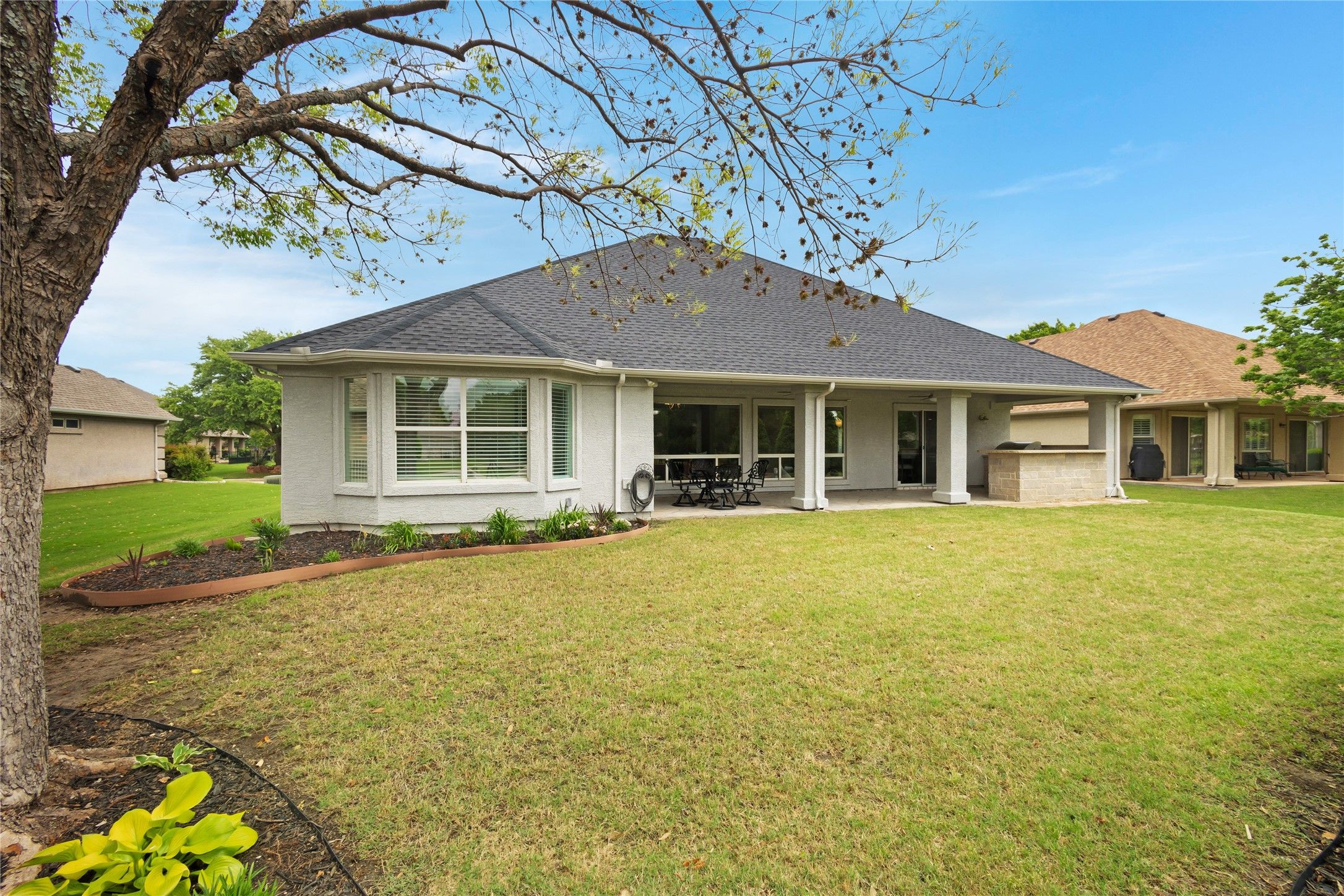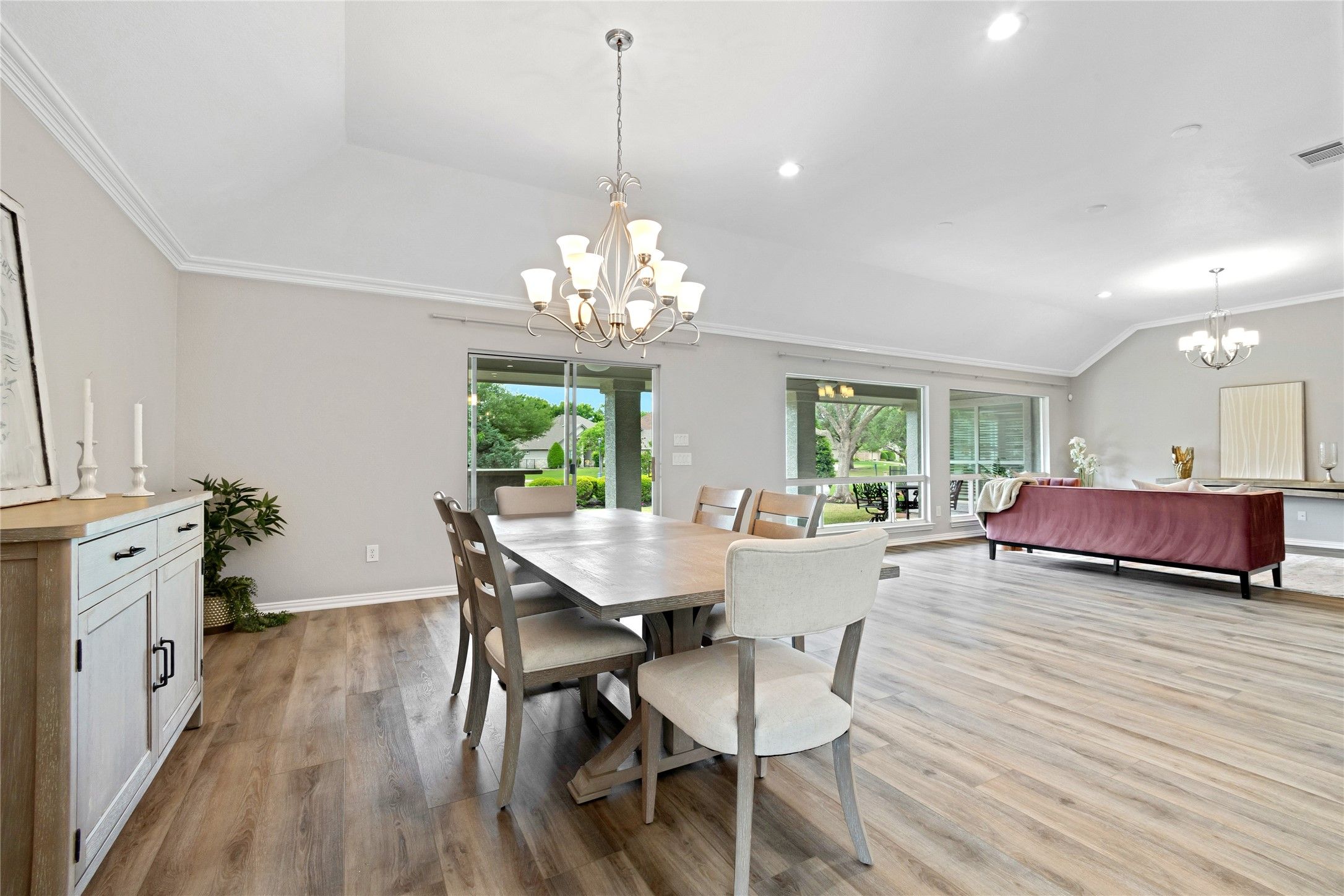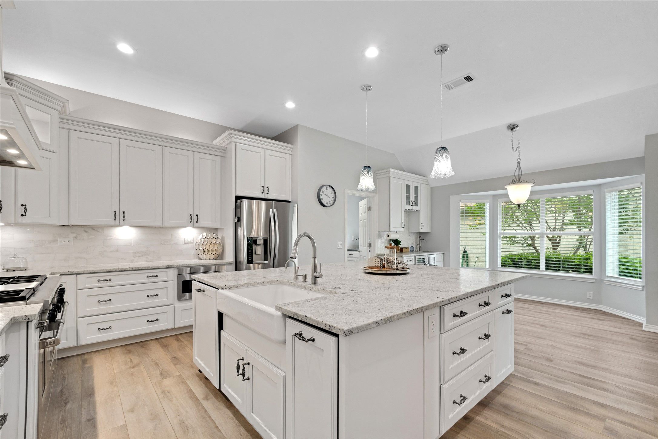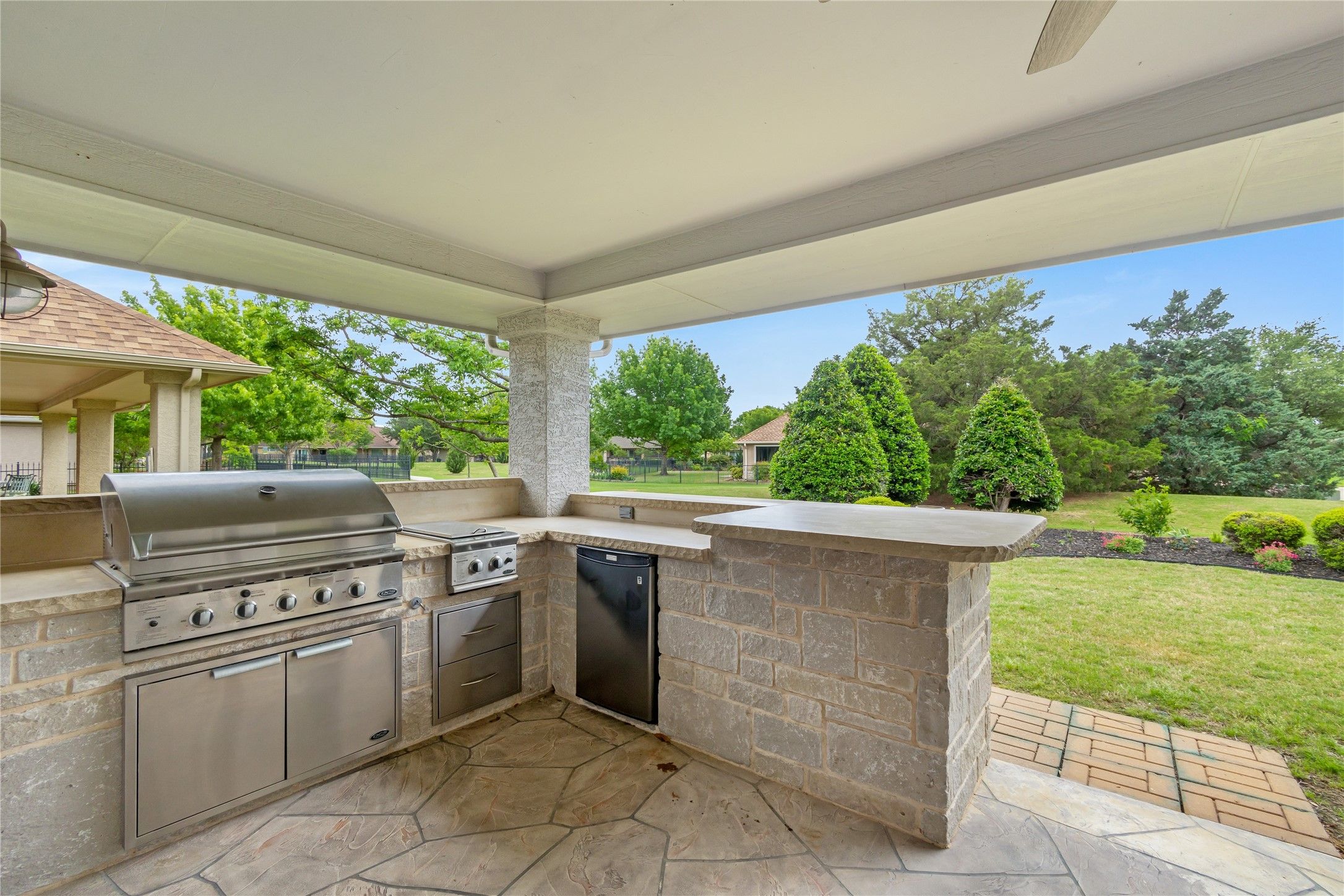 From the moment you step inside, it’s clear this home was designed for both everyday comfort and effortless entertaining, offering refined finishes and thoughtful upgrades throughout. Beautifully updated within the past four years, this exceptional 2-bedroom home, with an office, is located in the highly sought-after active adult community of Robson Ranch. The chef’s kitchen is a true showpiece, featuring a Wolf professional range with double ovens, professional hood vent, pot filler, leathered granite countertops, cabinets extending to the ceiling with illuminated glass uppers, a decorative mother-of-pearl backsplash, and a large island ideal for gathering with family and friends. New flooring flows seamlessly throughout the home, enhancing the bright, open layout highlighted by large windows that showcase peaceful backyard views. The breakfast nook includes a convenient wet bar, adding both functionality and charm for hosting guests. The spacious primary suite has been tastefully updated with new flooring, a beautifully tiled shower with custom glass enclosure, and quartz countertops, creating a relaxing, spa-like retreat. Step outside to enjoy the professionally updated landscape designed by a master gardener, with the added privacy and convenience of backing directly to the community walking path. Additional highlights include an epoxy-coated garage floor with built-in workbench, and the washer, dryer, and kitchen refrigerator conveying with the home. This meticulously maintained property blends quality craftsmanship, elegant design, and the vibrant lifestyle that makes Robson Ranch one of Denton’s premier active adult communities.