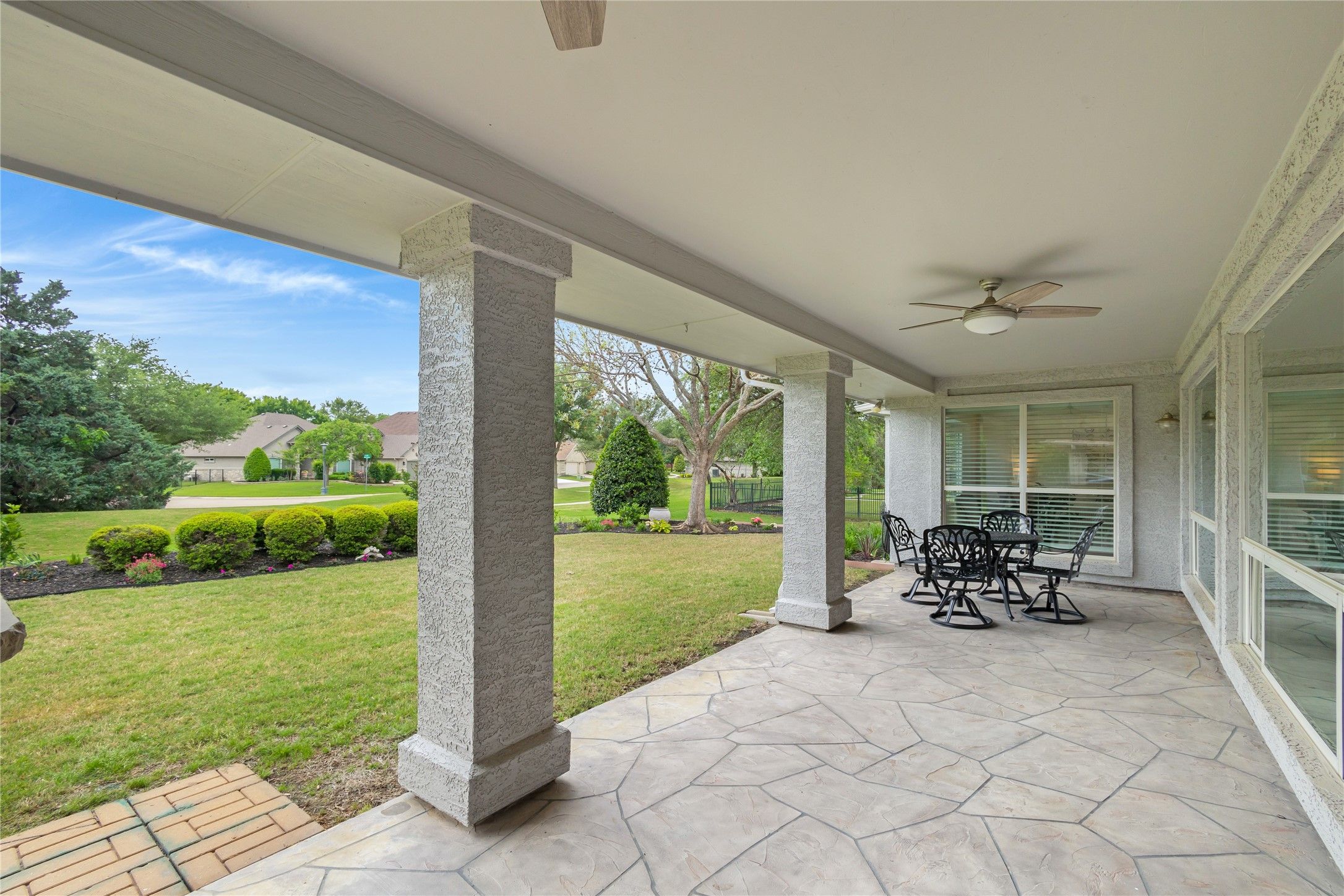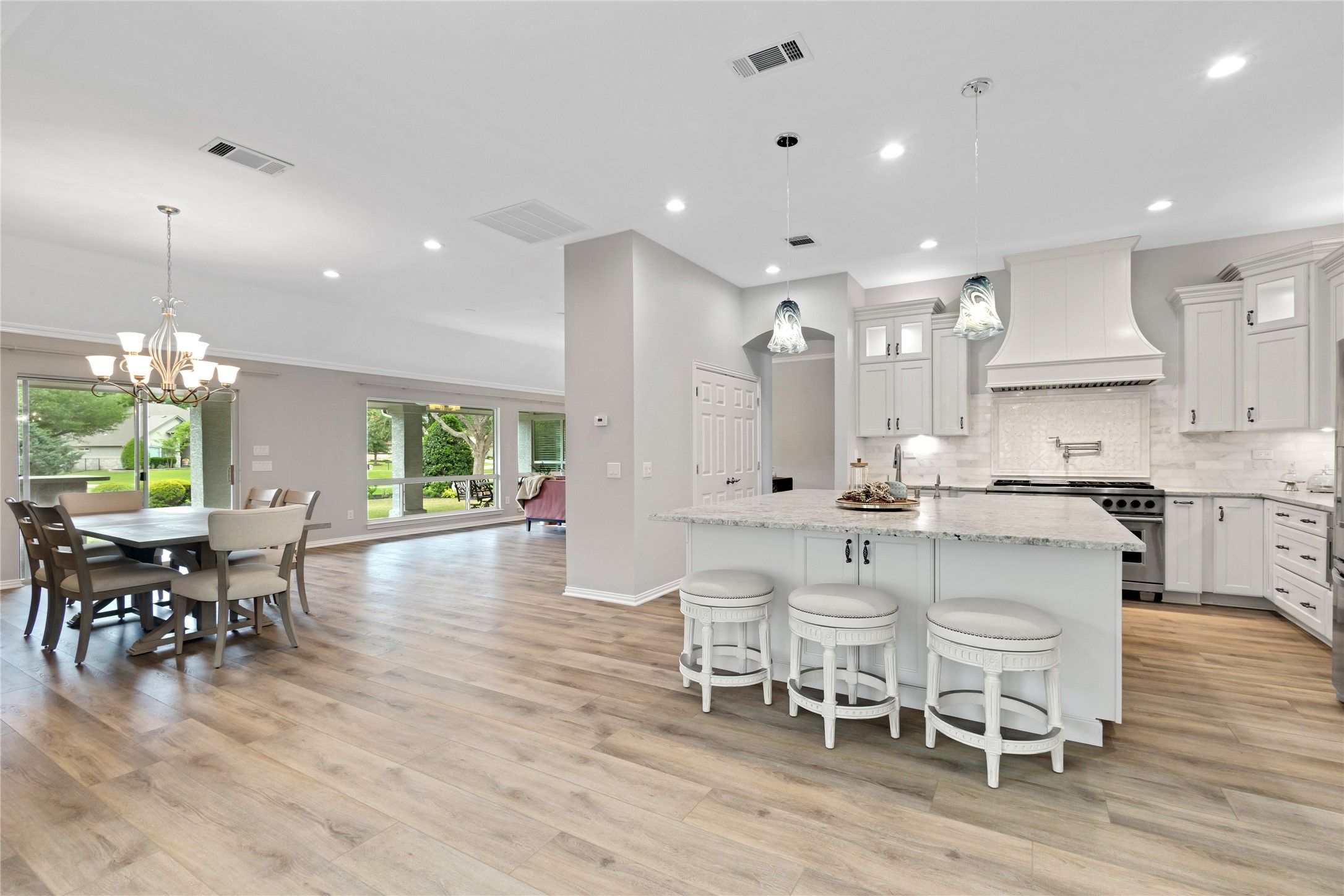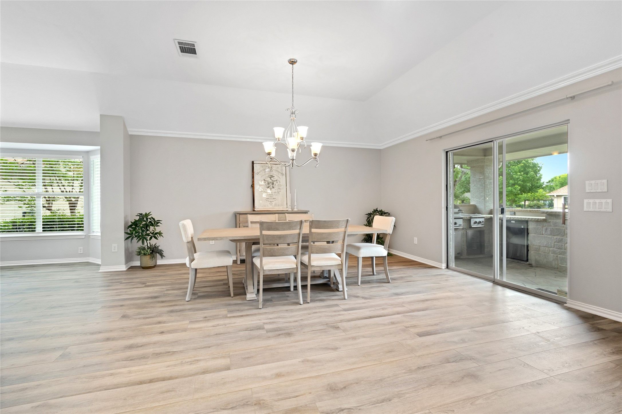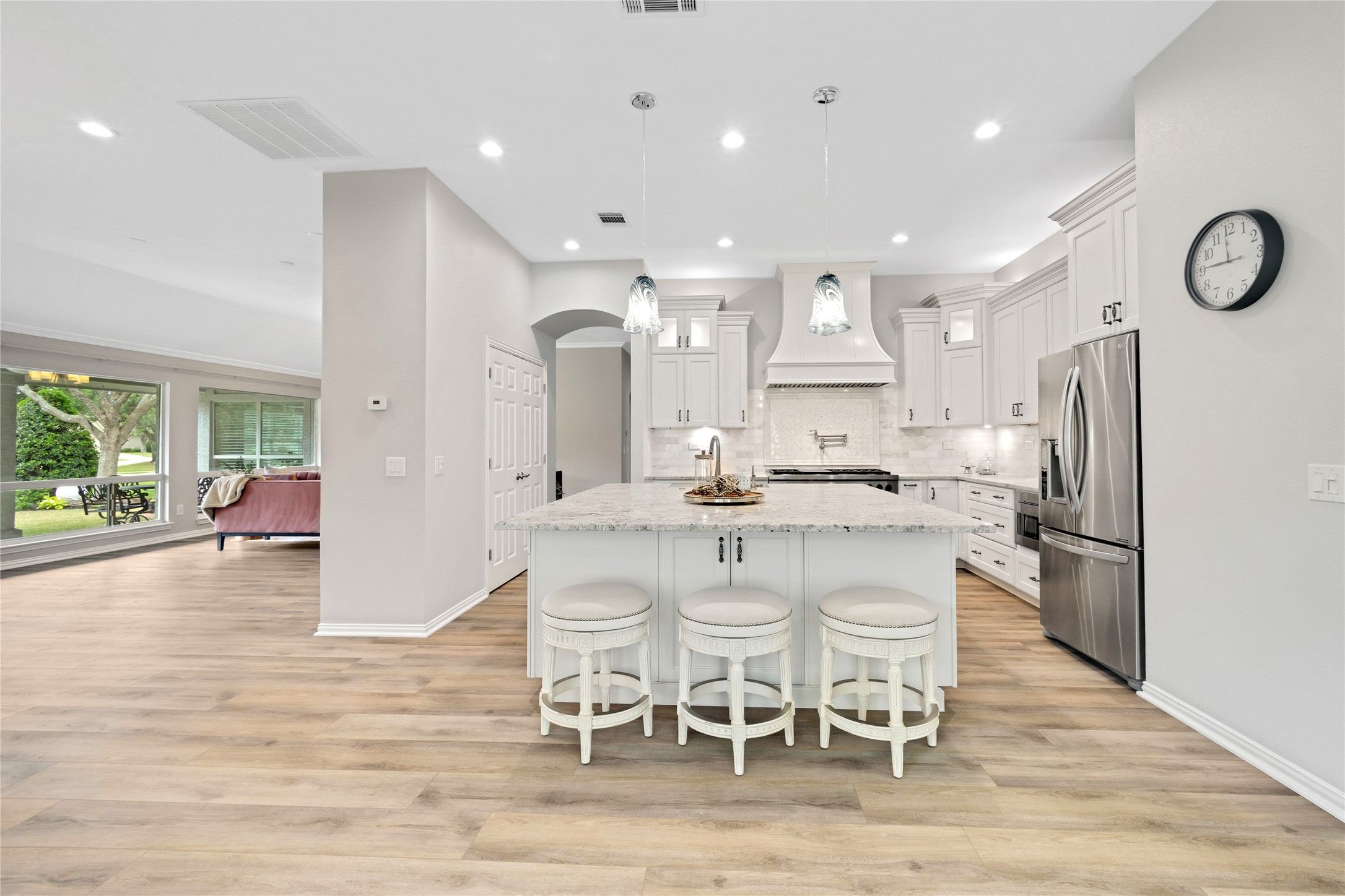 From the moment you step inside, it’s clear this home was designed for both everyday comfort and effortless entertaining, offering refined finishes and thoughtful upgrades throughout. Beautifully updated within the past four years, this exceptional 2-bedroom home, with an office, is located in the highly sought-after active adult community of Robson Ranch. The chef’s kitchen is a true showpiece, featuring a Wolf professional range with double ovens, professional hood vent, pot filler, leathered granite countertops, cabinets extending to the ceiling with illuminated glass uppers, a decorative mother-of-pearl backsplash, and a large island ideal for gathering with family and friends. New flooring flows seamlessly throughout the home, enhancing the bright, open layout highlighted by large windows that showcase peaceful backyard views. The breakfast nook includes a convenient wet bar, adding both functionality and charm for hosting guests. The spacious primary suite has been tastefully updated with new flooring, a beautifully tiled shower with custom glass enclosure, and quartz countertops, creating a relaxing, spa-like retreat. Step outside to enjoy the professionally updated landscape designed by a master gardener, with the added privacy and convenience of backing directly to the community walking path. Additional highlights include an epoxy-coated garage floor with built-in workbench, and the washer, dryer, and kitchen refrigerator conveying with the home. This meticulously maintained property blends quality craftsmanship, elegant design, and the vibrant lifestyle that makes Robson Ranch one of Denton’s premier active adult communities.