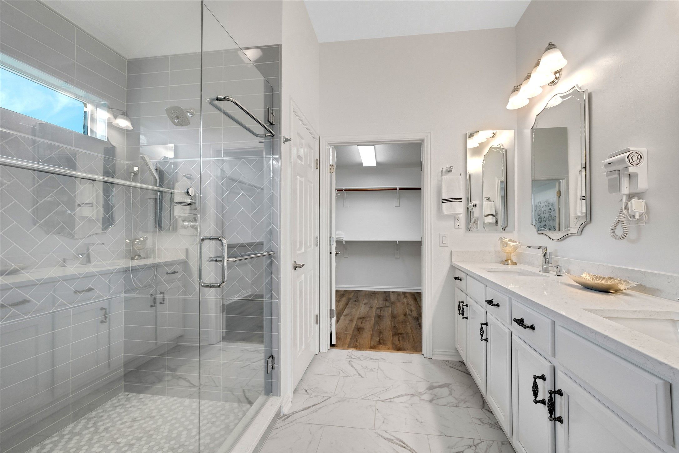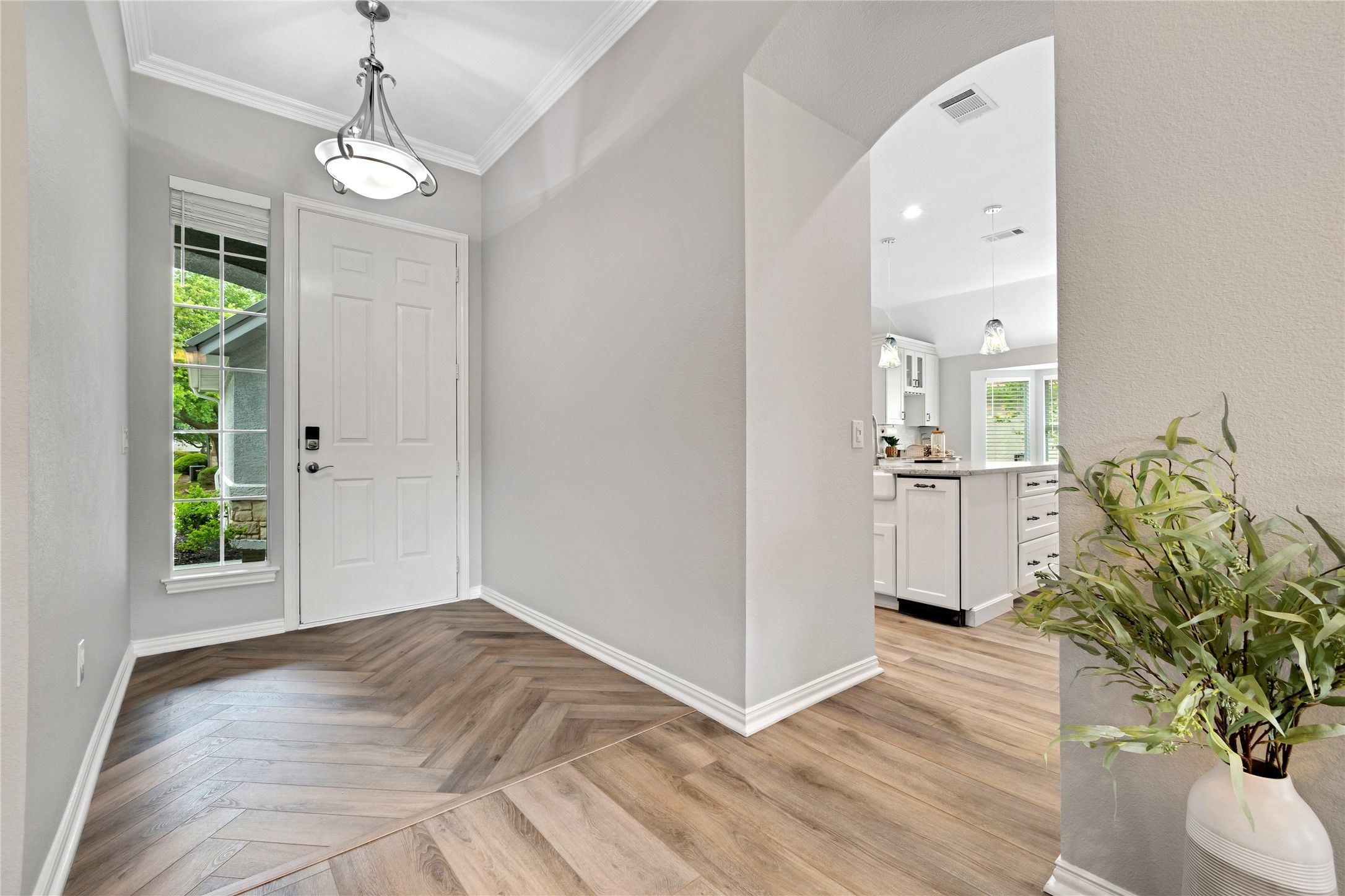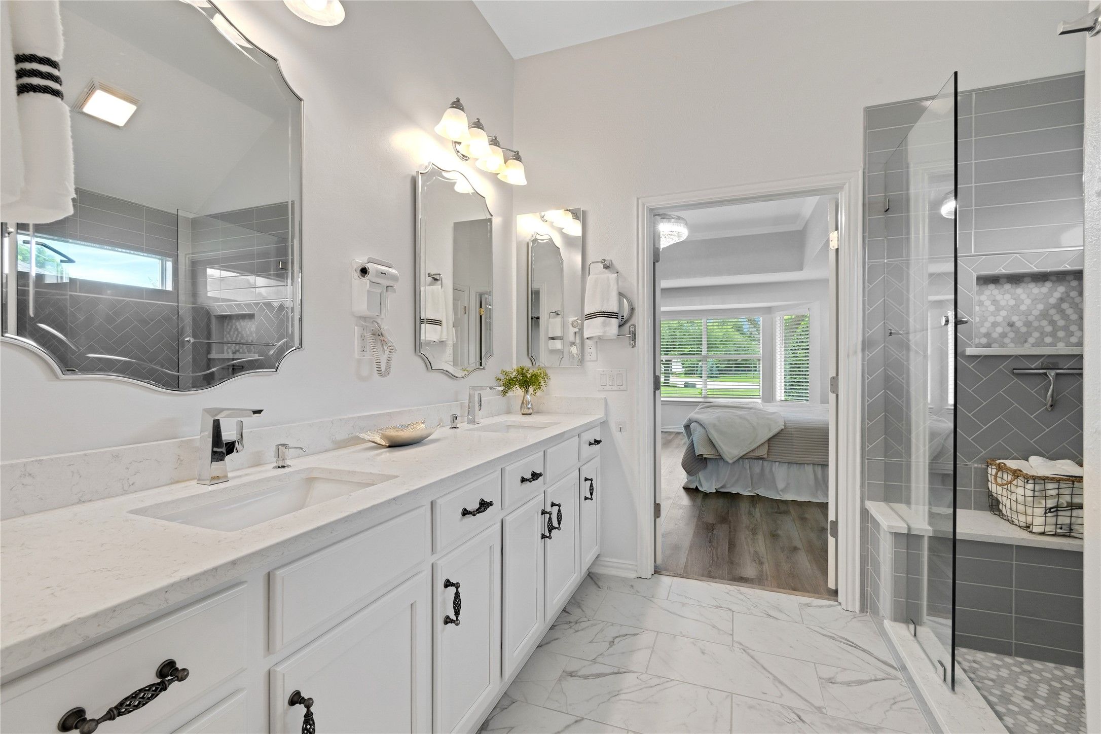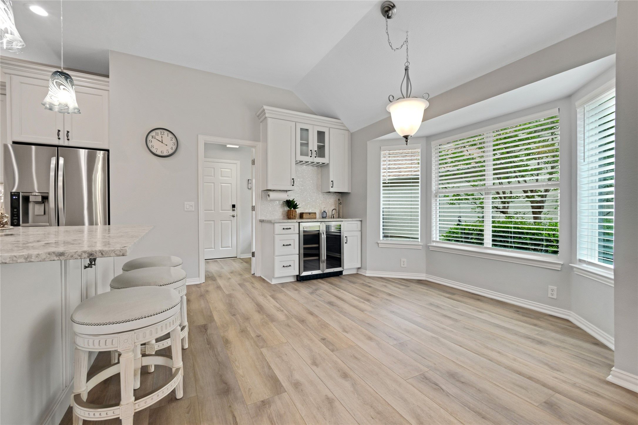 From the moment you step inside, it’s clear this home was designed for both everyday comfort and effortless entertaining, offering refined finishes and thoughtful upgrades throughout. Beautifully updated within the past four years, this exceptional 2-bedroom home, with an office, is located in the highly sought-after active adult community of Robson Ranch. The chef’s kitchen is a true showpiece, featuring a Wolf professional range with double ovens, professional hood vent, pot filler, leathered granite countertops, cabinets extending to the ceiling with illuminated glass uppers, a decorative mother-of-pearl backsplash, and a large island ideal for gathering with family and friends. New flooring flows seamlessly throughout the home, enhancing the bright, open layout highlighted by large windows that showcase peaceful backyard views. The breakfast nook includes a convenient wet bar, adding both functionality and charm for hosting guests. The spacious primary suite has been tastefully updated with new flooring, a beautifully tiled shower with custom glass enclosure, and quartz countertops, creating a relaxing, spa-like retreat. Step outside to enjoy the professionally updated landscape designed by a master gardener, with the added privacy and convenience of backing directly to the community walking path. Additional highlights include an epoxy-coated garage floor with built-in workbench, and the washer, dryer, and kitchen refrigerator conveying with the home. This meticulously maintained property blends quality craftsmanship, elegant design, and the vibrant lifestyle that makes Robson Ranch one of Denton’s premier active adult communities.