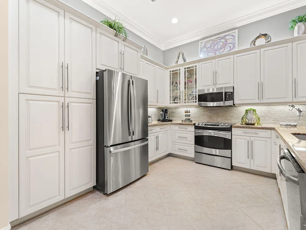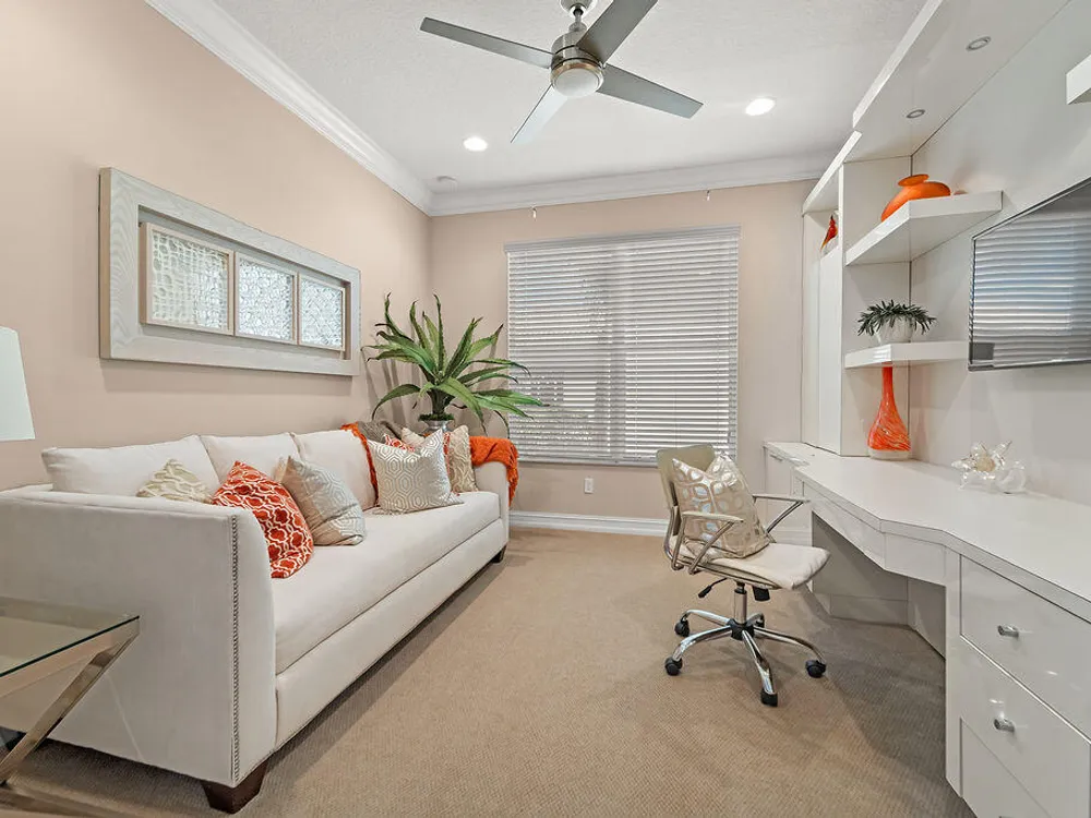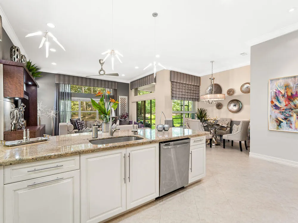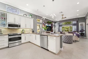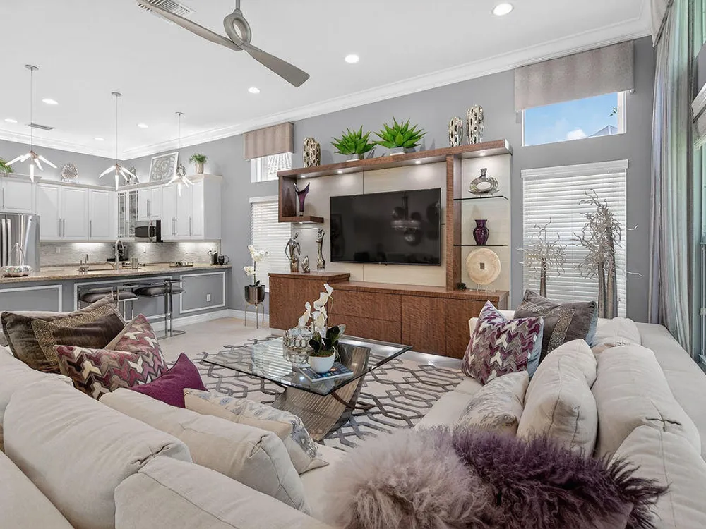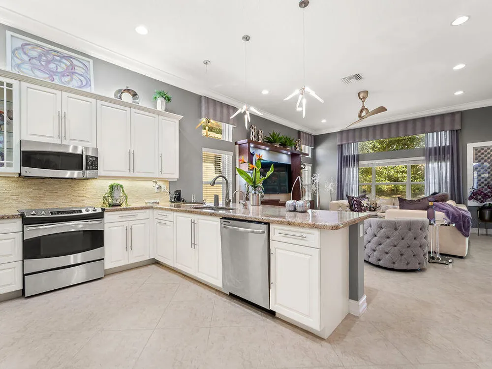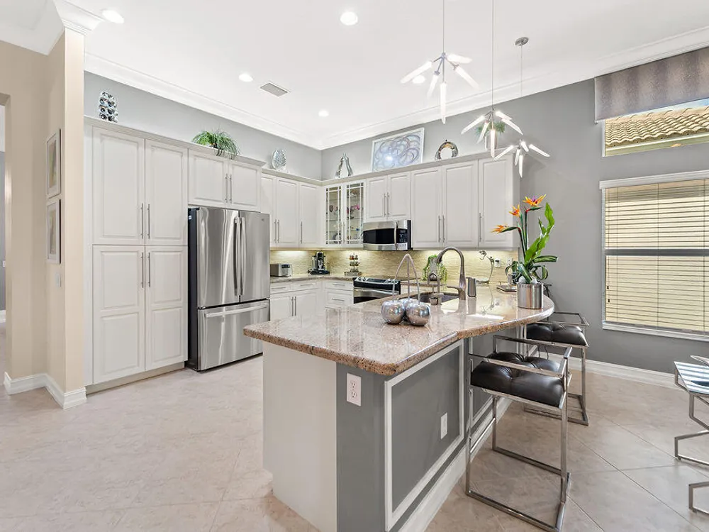 Welcome to this impeccably maintained, move-in ready home that effortlessly blends elegance, comfort, and functionality. Featuring an open-concept layout filled with natural light, this bright and spacious residence offers two generous bedrooms, a versatile den, a formal living room, and a formal dining room--perfect for both everyday living and entertaining. The gourmet kitchen is a standout, with granite countertops, upgraded cabinetry, quality appliances, and a brand new refrigerator. The primary suite provides a serene retreat with custom finishes and a spa-like bathroom. Neutral flooring, stylish lighting, and ceiling fans add warmth and sophistication throughout.