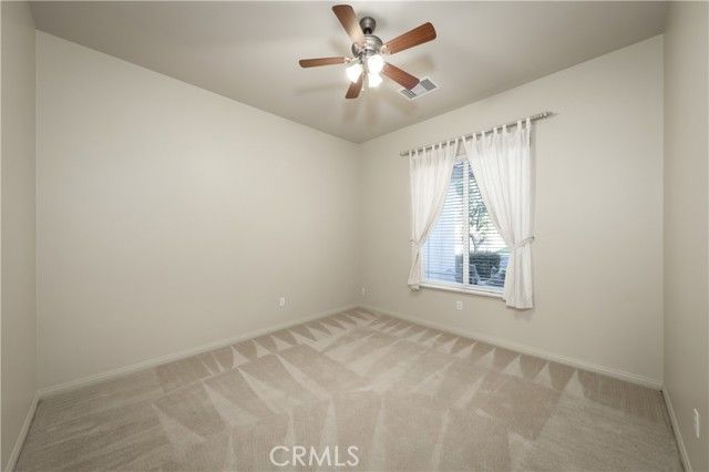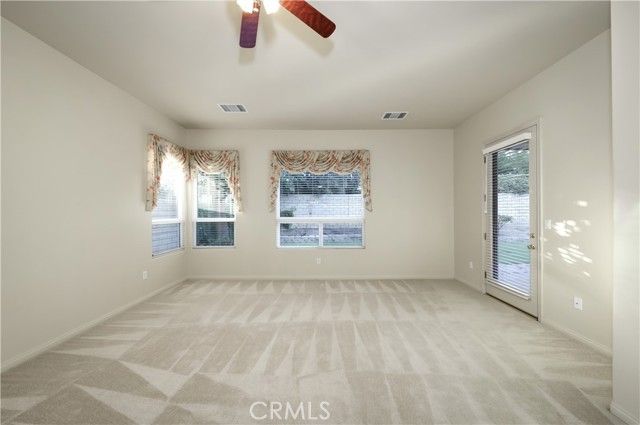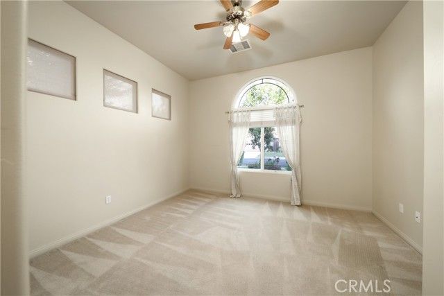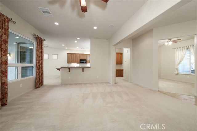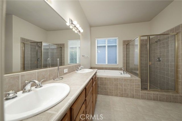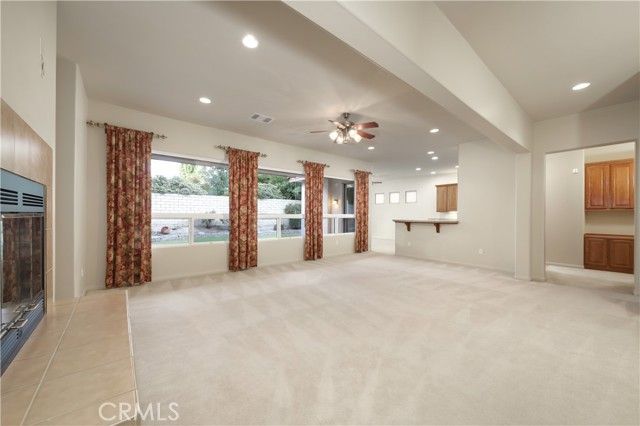 This impeccably maintained home in the desirable Seven Oaks Greens 55+ gated community is a true gem! Featuring a spacious split-wing layout with 2 bedrooms + office, 2 bathrooms, and a large family room with high ceilings, cozy fireplace, and surround sound, this home offers both comfort and functionality. Enjoy serene views of the picturesque backyard through oversized windows. The primary suite includes dual vanities, a soaking tub, and two generous closets. The open-concept kitchen overlooks the living area and is ideal for entertaining. Additional features include a 2.5-car garage with built-in cabinetry, alarm system, and a backyard oasis with a peaceful water feature, pull-down shades on the patio, a storage shed, and block wall fencing for privacy. Residents of The Greens enjoy two clubhouses offering an exercise facility, library, kitchen, social hall, putting green, BBQ area, pool, and spaall designed for an active and vibrant lifestyle.