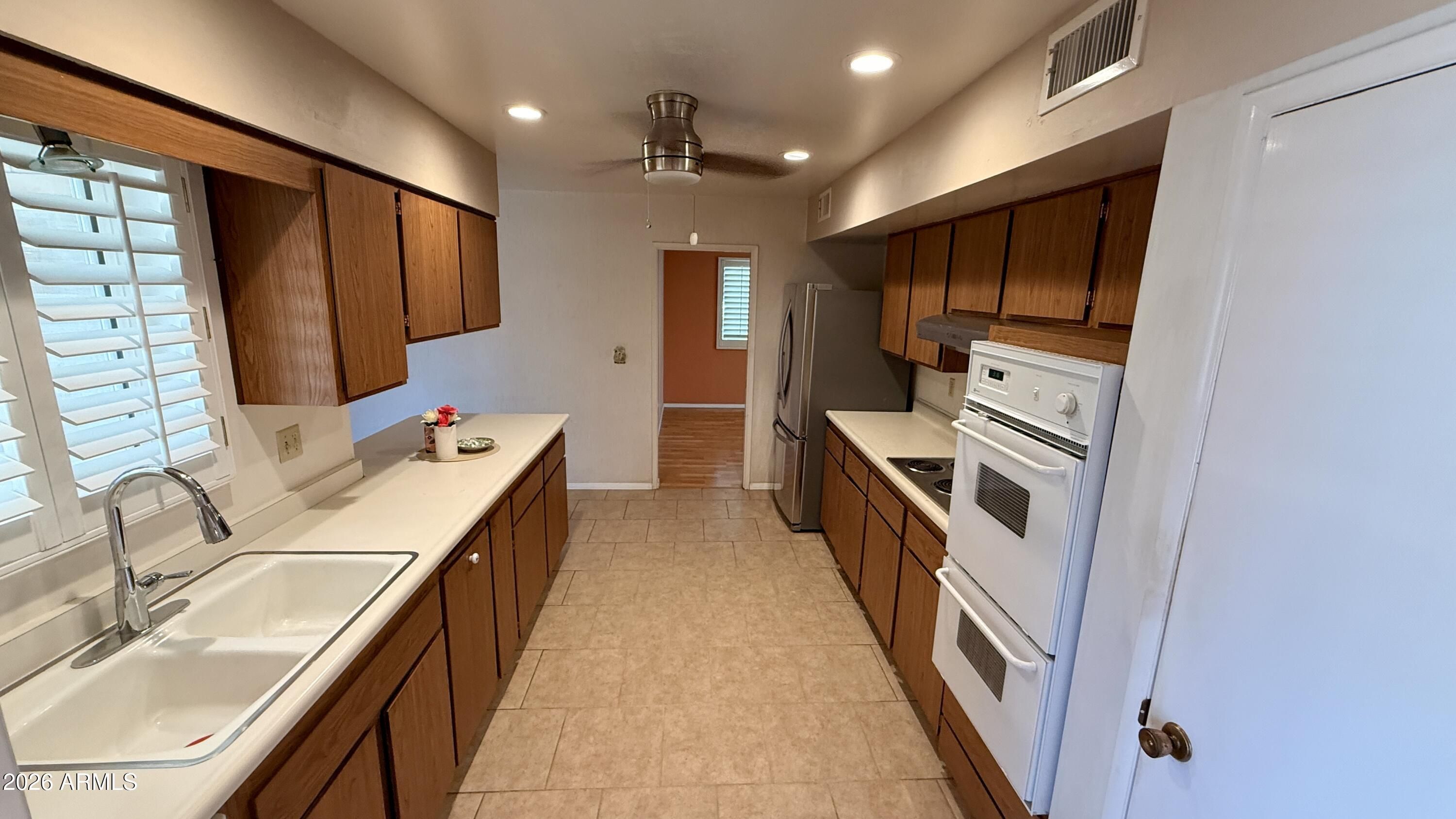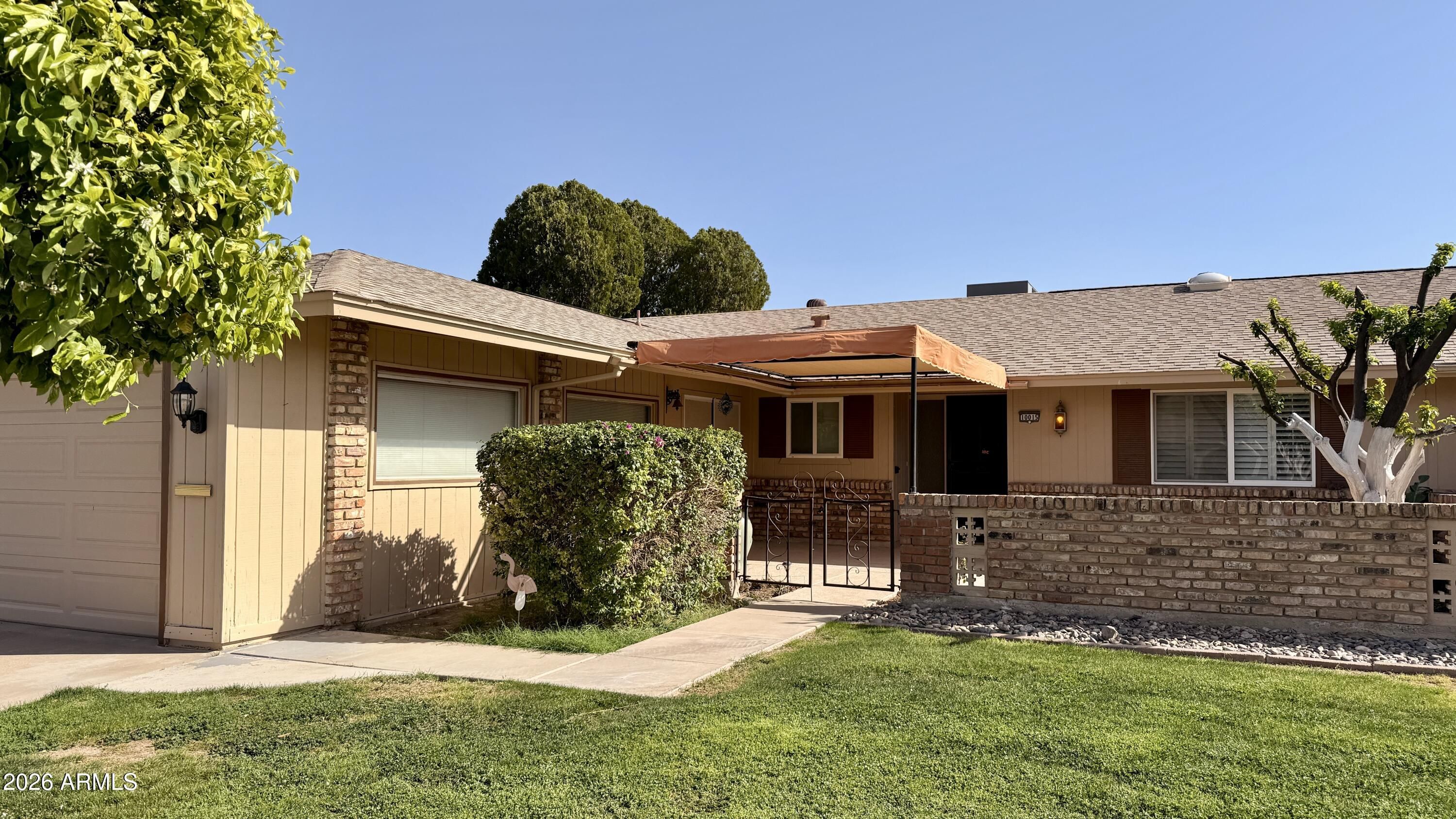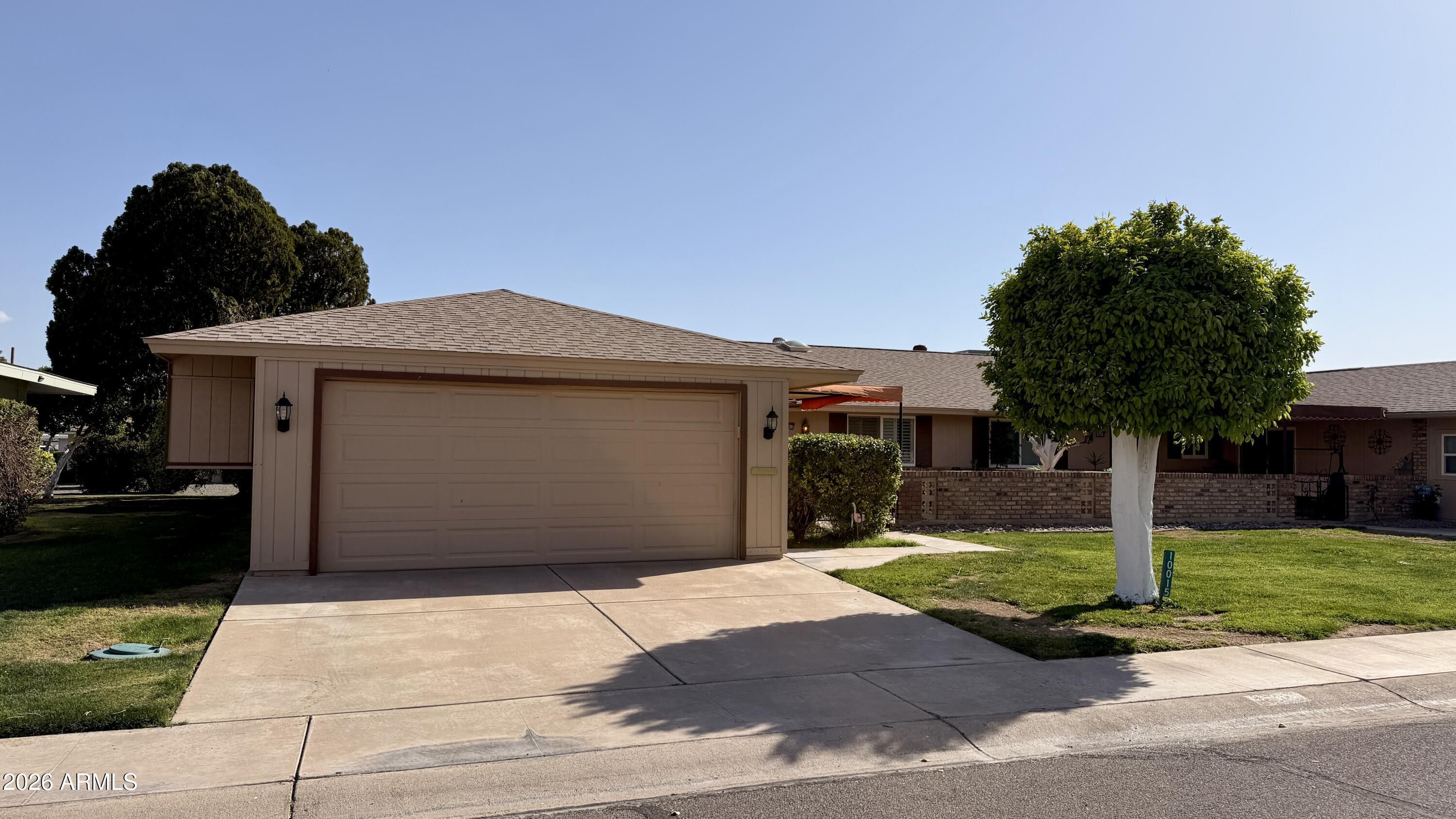Don't miss this A23 Gemini twin home in Sun City -- a lovingly maintained, owner-occupied residence for 26 years. Move-in ready with thoughtful upgrades and reasonable HOA fees, it must be seen to be fully appreciated. Highlights include a private north-facing front courtyard, two-car garage with original golf-cart storage ramp, dual-pane windows, and upgraded dual sliding glass rear doors with security screen for added ventilation and peace of mind. The generously sized kitchen offers laminate countertops, a cooktop, dual wall ovens and a roomy pantry. Spacious bathrooms, in-unit washer and dryer, and updated refrigerator convey with the sale. Come see it today before you miss out!