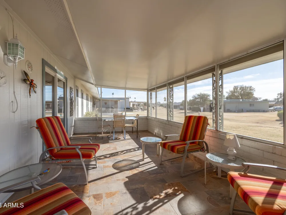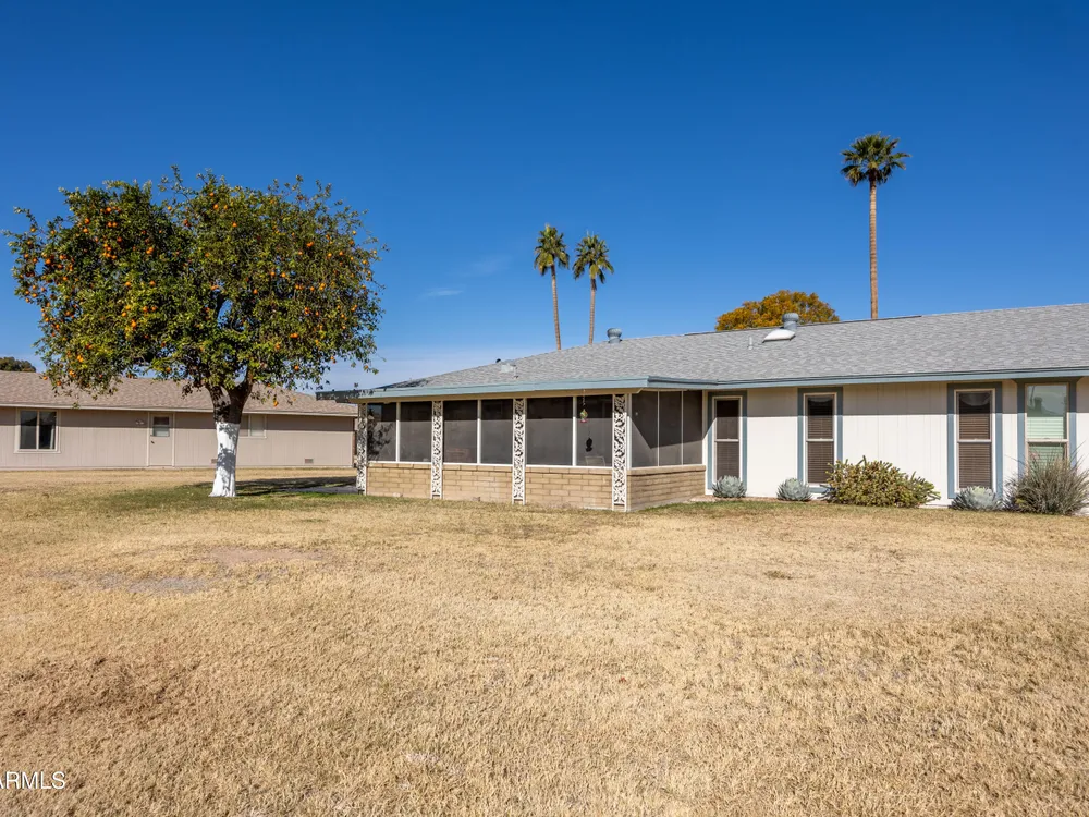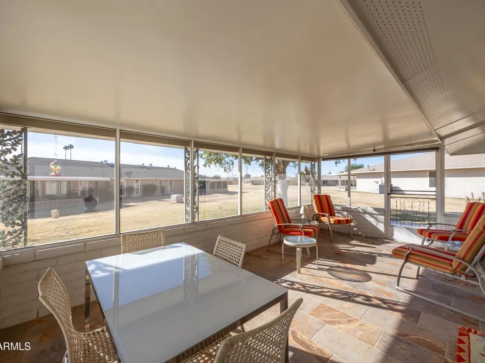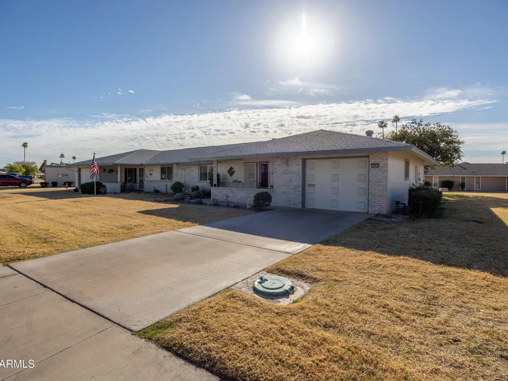 Come visit this stunning Gemini-Twin on a very quite street with great neighbors. This 2Bd/2Ba home has over 1,200 SF of living space on a massive greenbelt. The back patio is covered, tiled & screened (the perfect place to relax) The home has been updated with tile & wood laminate flooring(No carpet here) Roof 2010, HVAC 2015, Dual Pane windows, Electrical Panel 2023. The kitchen has quartz counters, refaced cabinets, & newer appliances. It has an inside laundry and plenty of build-in storage. The 1-car garage also can accommodate your golf cart. The front porch is another perfect spot to relax and enjoy your favorite beverage. This home is a great value and move-in ready. Enjoy the Sun City lifestyle and all it has to offer. This one is a must see!