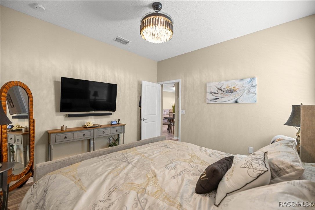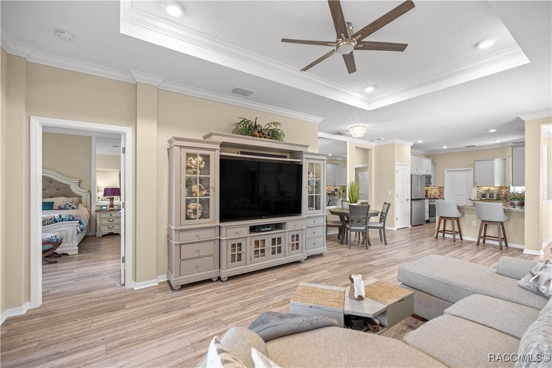 Welcome to this bright, open, and impeccably upgraded 2-bedroom, 2-bathroom home, located in the highly desirable 55+ community of On Top of the World. From the moment you arrive, you’ll be impressed by the stone-accented exterior, stone driveway, and upgraded front entry door that set the tone for the quality found throughout this home. Inside, enjoy a spacious open floor plan with luxury vinyl plank flooring throughout, custom crown molding, tray ceilings, and ceiling fans in every room. The kitchen is a chefs dream with soft-close cabinets and drawers, granite countertops, tile backsplash, under-cabinet lighting, upgraded stainless sink and dishwasher, and detailed crown molding for a finished look. The inviting living and dining areas feature a custom mirrored accent wall, and the flow continues seamlessly to the screened-in lanai—complete with insulated ceiling, TV outlet, custom blind, upgraded CMU wall, and stone extension, making it the perfect place to relax or entertain. Retreat to the master suite featuring custom-built closet organizer, granite bathroom countertops, a walk-in tiled shower with stone flooring, and soft-close cabinetry. The guest bathroom has also been upgraded with granite countertops, modern fixtures, and matching cabinetry. The garage is fully finished with an insulated door, epoxy-coated floor, extra electrical outlets, pull-down attic ladder with storage and lighting, bike pulleys, and an Aquasure water softener. Located in a community that offers resort-style amenities, including pools, golf, fitness centers, clubs, and countless social activities, you’ll have everything you need to live an active and fulfilling lifestyle.