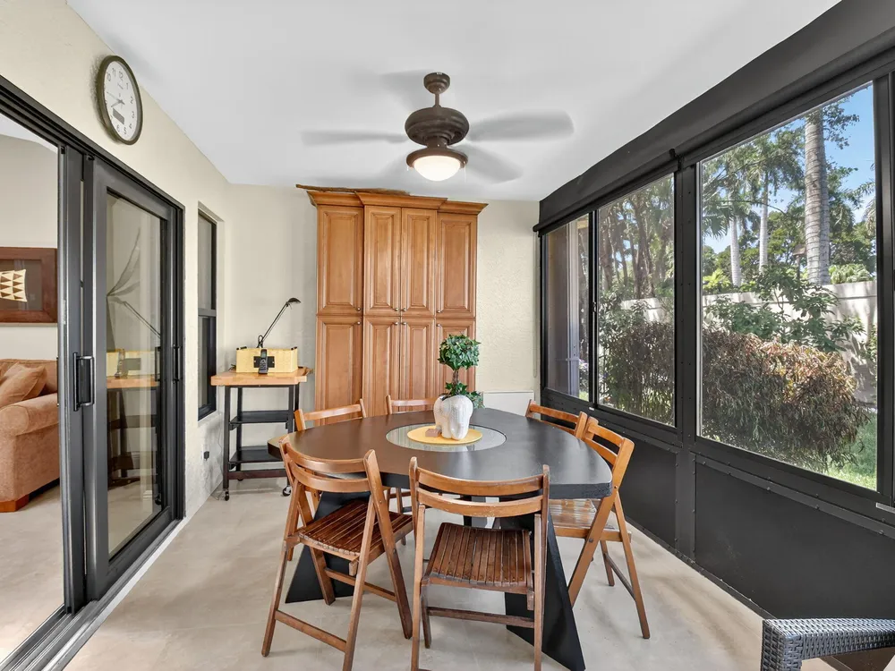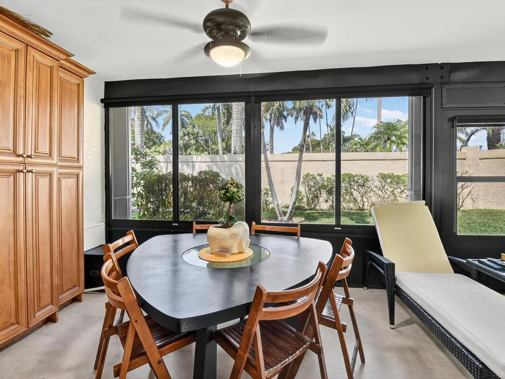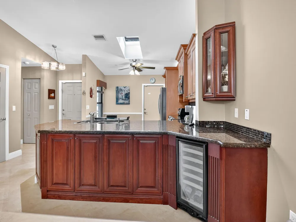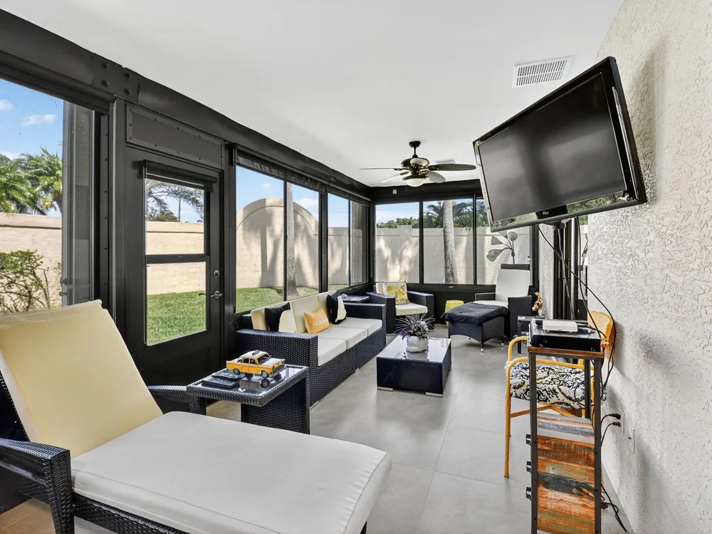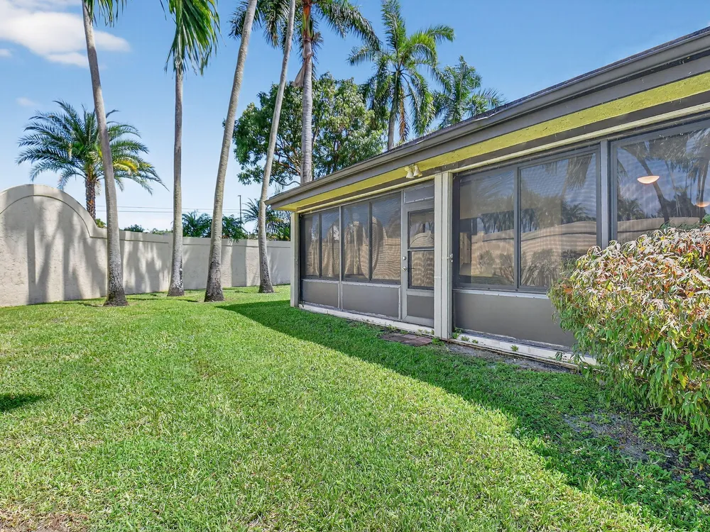 Beautifully remodeled and meticulously maintained 3/2 villa w/ fully enclosed & air-conditioned patio adding to the living square footage (1769 sq feet including enclosed patio area). This home has a gorgeous custom wood kitchen w/ all the bells & whistles including granite countertops, updated appliances, & a wine refrigerator. Porcelain floors throughout living area & laminate/tile flooring in the bedrooms. Add'l updates include impact windows & doors, updated bathrooms, 2022 a/c, 2021 hot water heater, crown molding, smooth ceilings, large pantry, full size washer & dryer, & the list goes on. FULLY FURNISHED (w/ some exclusions). Corner lot w/ lots of privacy & greenspace. Palm Chase Lakes is an active 55+ community w/ resort style amenities. Walking distance to houses of worship.