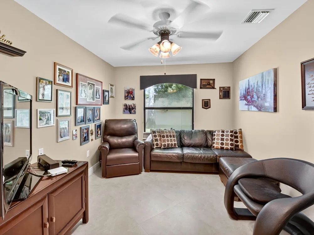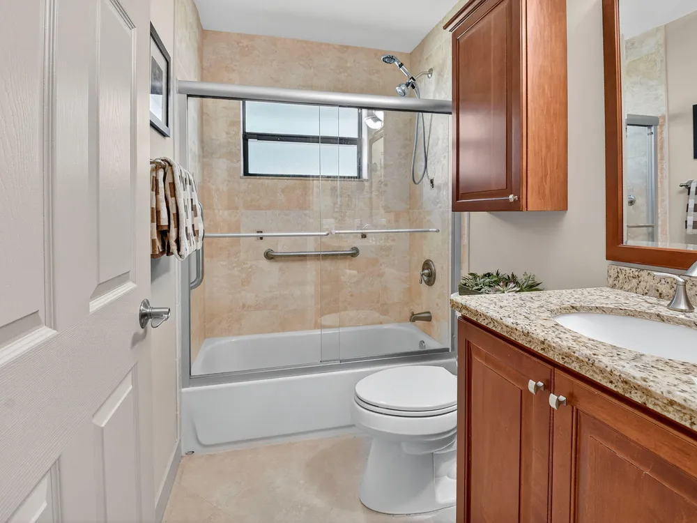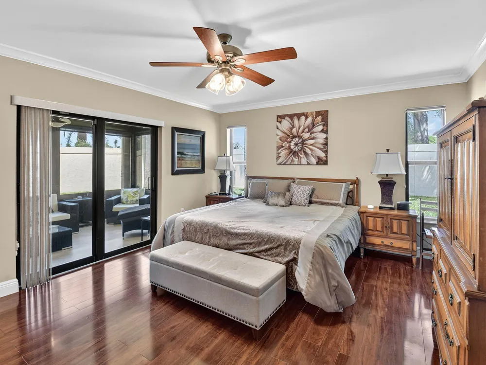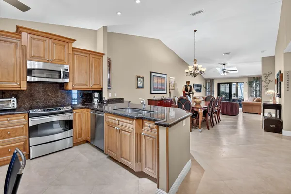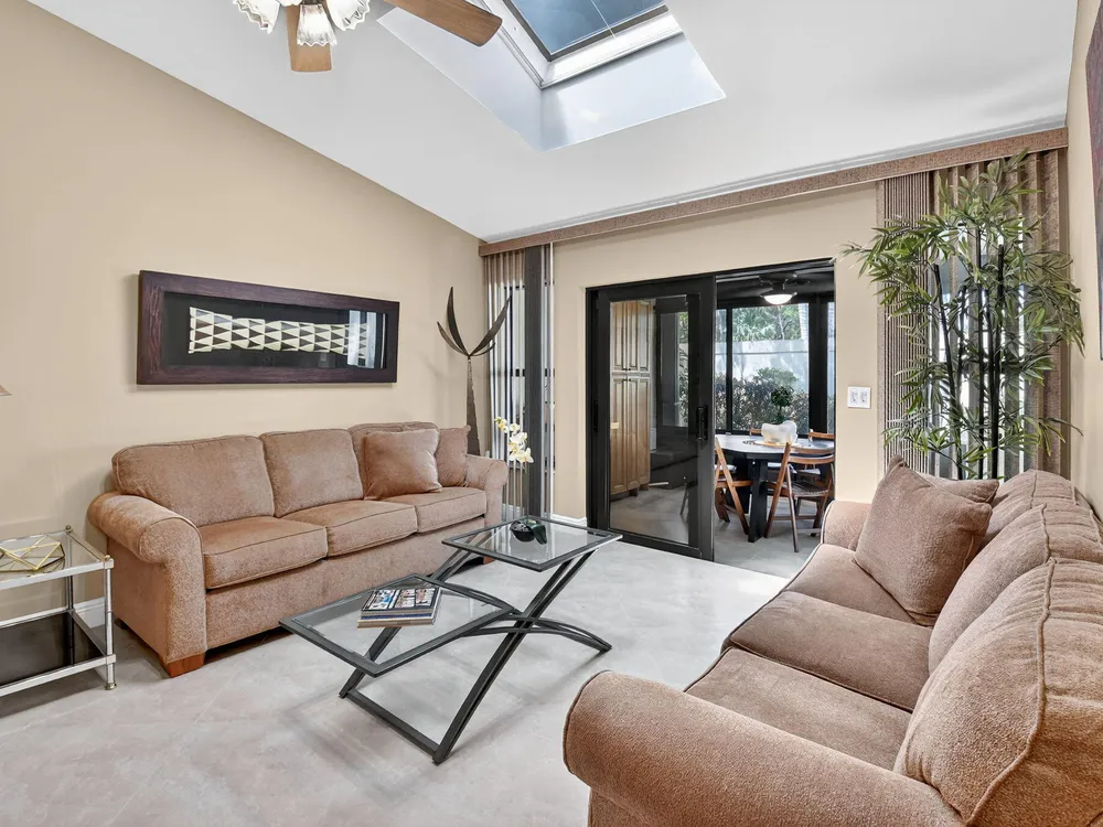 Beautifully remodeled and meticulously maintained 3/2 villa w/ fully enclosed & air-conditioned patio adding to the living square footage (1769 sq feet including enclosed patio area). This home has a gorgeous custom wood kitchen w/ all the bells & whistles including granite countertops, updated appliances, & a wine refrigerator. Porcelain floors throughout living area & laminate/tile flooring in the bedrooms. Add'l updates include impact windows & doors, updated bathrooms, 2022 a/c, 2021 hot water heater, crown molding, smooth ceilings, large pantry, full size washer & dryer, & the list goes on. FULLY FURNISHED (w/ some exclusions). Corner lot w/ lots of privacy & greenspace. Palm Chase Lakes is an active 55+ community w/ resort style amenities. Walking distance to houses of worship.