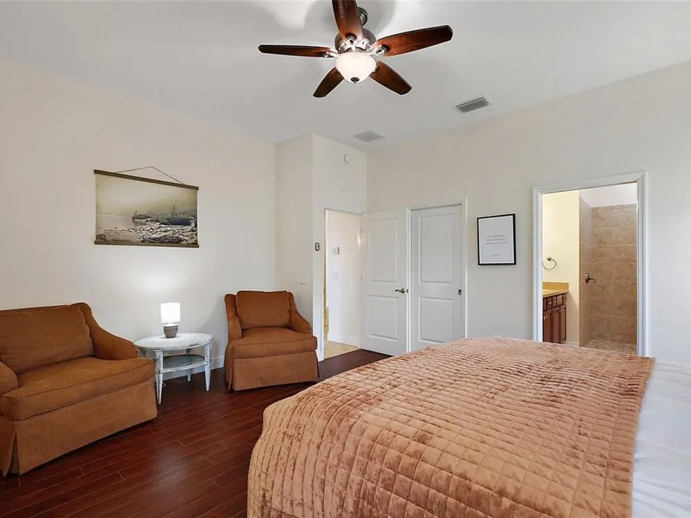 - Eat-in Kitchen, High Ceilings, Living/Dining Room, Open Floorplan, Main Level Primary, Stone Counters, Walk-In Closet(s)