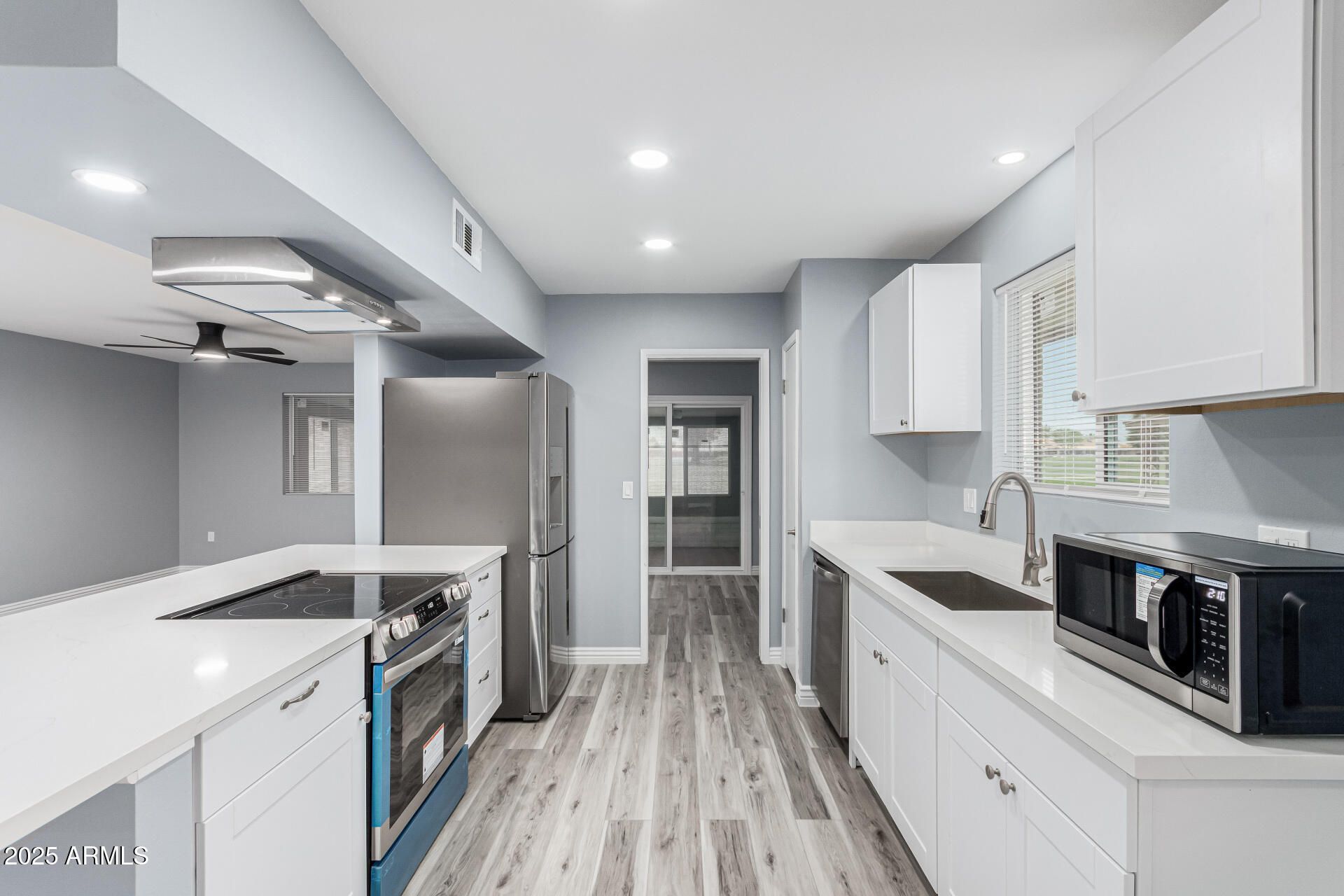 A beautiful remodeled 3 bed, 2 bath townhouse on a golf course in Sun City is now for sale! The roof and sewer line were replaced in 2024 and comes with a warranty, A/C was replaced in 2021. It's sure to be the home for you! Inside you will find spacious dining & living areas w/elegant wood-look flooring, The fabulous kitchen comes equipped w/ample cabinetry, a pantry, quartz counters, SS appliances, and a breakfast bar. Both bathrooms have new double sink vanities. New dual pane windows throughout. New ceiling fans/lights, USB charging ports in all rooms. Don't forget about the cozy AZ room, where you can spend quality time w/friends & loved ones! golf course. This home has it a