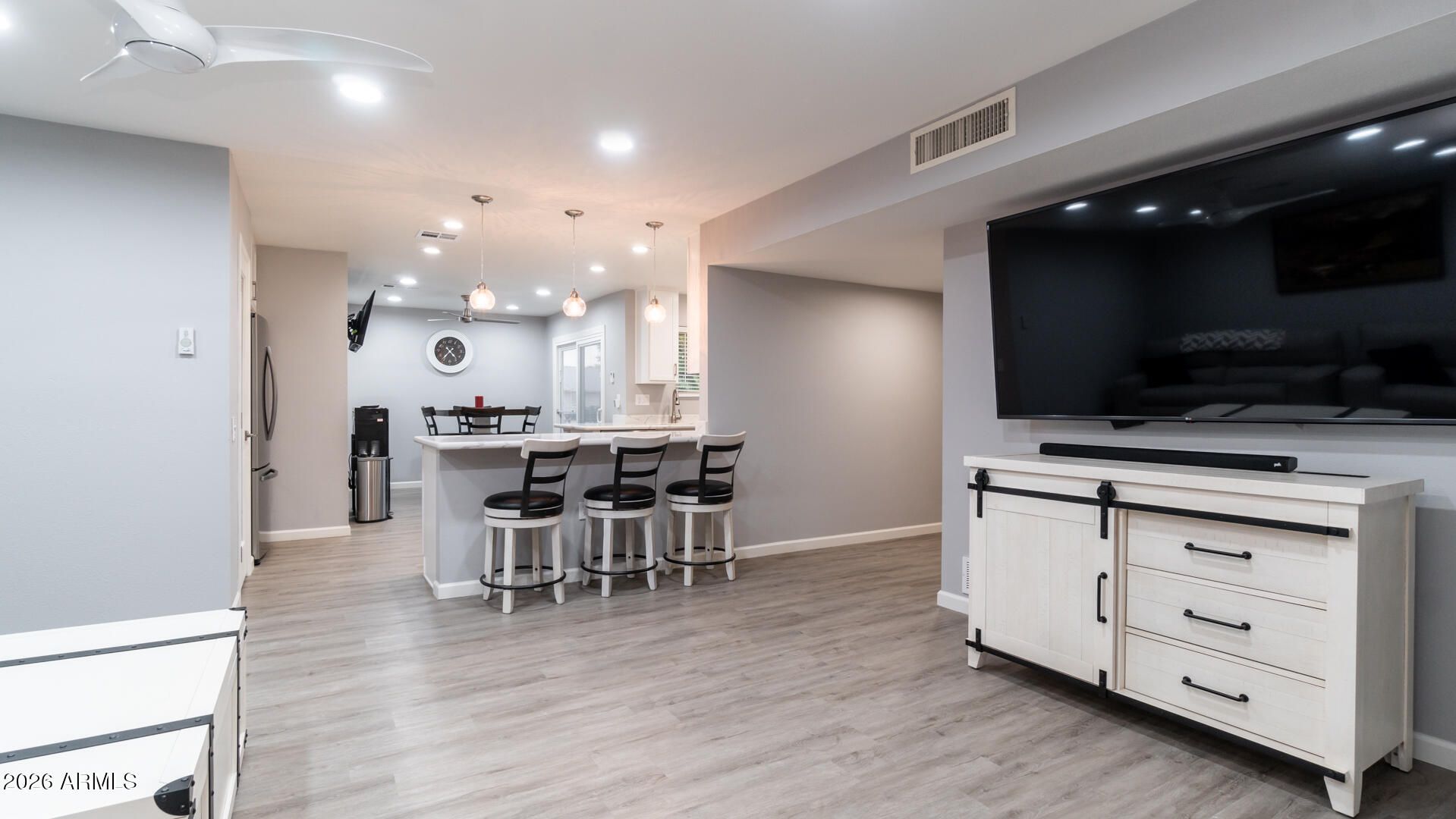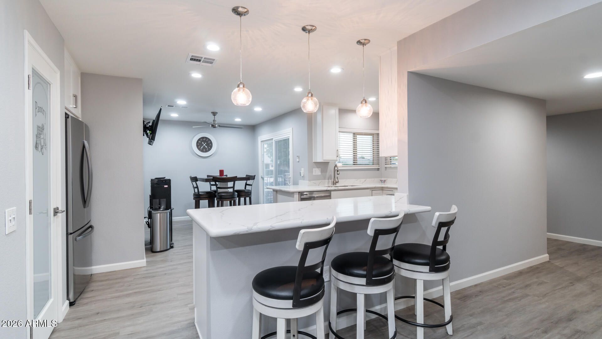 ++SUN CITIES FINEST++ Are you ready to see Sun Cities very BEST? Make sure you put this gorgeous, completely remodeled, twin home, on your list to view today! 2 bedroom 2 bath, over 1658 sq. ft. of living space. This kitchen is truly one of a kind, that showcases elegance and beauty like none other! Featuring 42 in white shaker cabinets, matching stainless steel appliances, granite counter tops with bar top space for 3 sizable swivel chairs to hang out on, while lunch or dinner is being prepared, eat in kitchen area, pendant lighting on dimmer switches, and a frosted glass panty door with nice hardware throughout. Home has double paned windows throughout, plantation blinds in primary, entertainment/bar area in fully enclosed Arizona room to watch all of your sports or game shows on. Relax with comfort in the gorgeous great room and soak up all of your social media or tv desires with your partner, friends or family. White and gray color scheme flows throughout the home giving off a warm feeling of "you are home". The primary and second guest bedrooms are gorgeous and ready for your arrival! The entire interior has canned lighting with dimmers throughout. Sip back and enjoy your coffee or cocktails on the spacious covered patio with lots of privacy out back with one of the largest green belts that Sun City has to offer. Later in the evening phone your friends over, challenge them to a "who can sink the most golf balls" on the super cool lighted putting green out front. Looking for storage for your trike, golf cart, or motorcycle? Check out the amazing 2 car garage that has as ton of great storage for all of your toys along with cabinets for all of your tools and decorating supplies. Whether you are ready to retire in a 55+ community that has all the amazing amenities, excited to downsize to the lock n leave life, changing areas of town, wanting a second or third home, or just looking for your perfect winter escape, you will fall in love with this magnificent home. This is the one! DONT WAIT, this home has it all!
