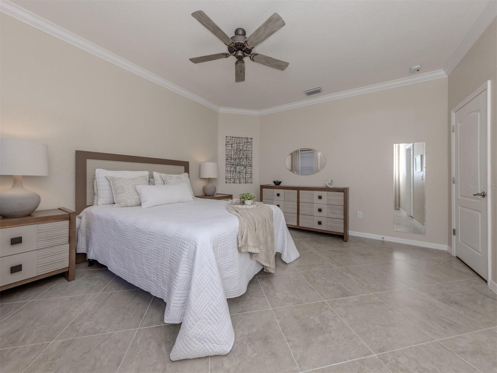 - Ceiling Fan(s), Crown Molding, Eat-in Kitchen, High Ceilings, Open Floorplan, Main Level Primary, Solid Surface Counters, Solid-Wood Cabinets, Split Bedrooms, Tray Ceiling(s), Walk-In Closet(s), Window Treatments