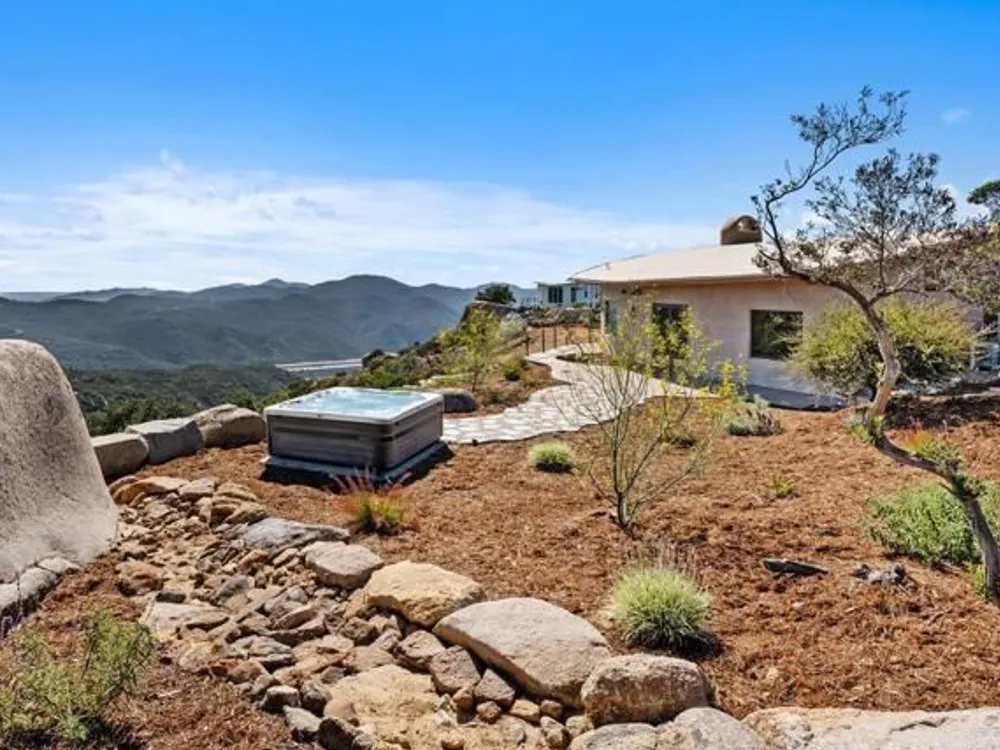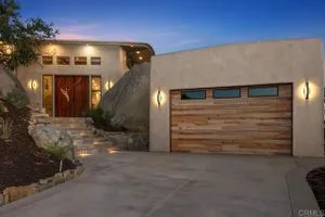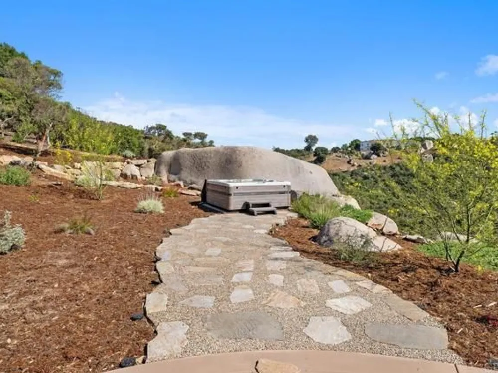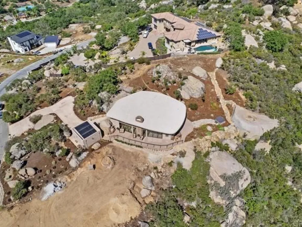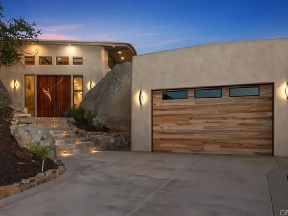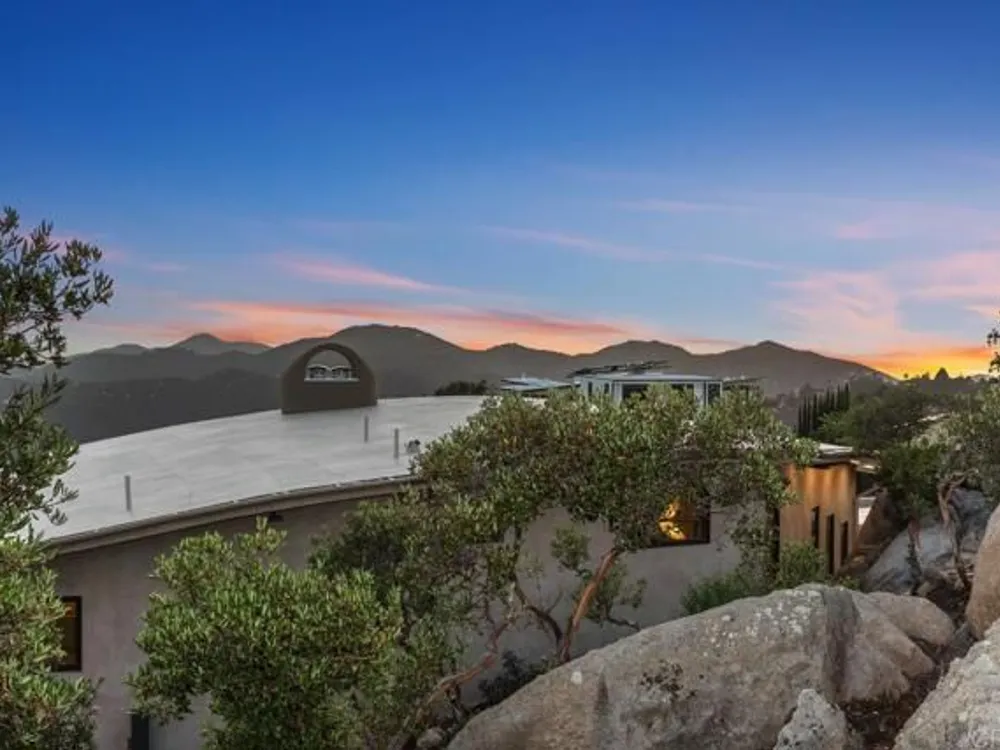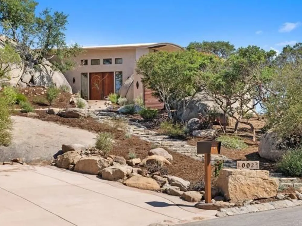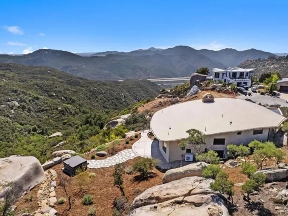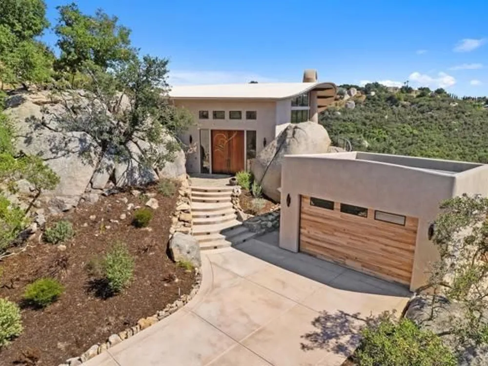 As recently featured in Dwell, an award-winning sustainable masterpiece envisioned by renowned architect Drew Hubbell of Hubbell & Hubbell. Perched at the edge of a canyon with panoramic views of the Pacific Ocean to the west and Palomar Mountain to the east. Hidden from the cul-de-sac below in Escondido’s iconic Boulder Landscape, this extraordinary “Museum of Imagination,” 3 bedroom, 4 bath custom home is harmoniously integrated into its natural surroundings of manzanita groves, native oaks, and massive granite boulders. Natural stone steps to the custom handcrafted entryway door you are immersed in a property that lives in harmony with its surroundings. Inside, a soaring open-concept living space you’re greeted by its carefully curated light child- chandelier, sculptural curved staircase anchored by a natural interior boulder, a majestic wood-burning fireplace, and floor-to-ceiling glass doors and windows that frame breathtaking vistas. Every material was selected for sustainability, wellness, and longevity from polished concrete floors and bamboo cabinetry to natural stone accents and non-toxic custom finishes. The Kitchen features a curved island, energy-efficient appliances, a state-of-the-art induction cooktop, and smart oven. The living and dining areas enjoy dramatic views and abundant daylight, enhanced by operable clerestory windows and passive cross-ventilation. The primary suite captures tranquil canyon views and offers direct access to a private spa deck. Its ensuite bathroom feels like a retreat, with a curved walk-in tile shower, soaking tub, dual vanity, and bamboo cabinetry. The secondary loft-style bedroom offers expansive ocean and sunset views and each of the guest suites feature ensuite bathrooms and serene privacy. This Net-Zero home is powered by solar panels and includes mini-split HVAC systems, foam-core panel roofing, and ICCF walls made from post-consumer materials providing exceptional insulation, fire resistance, and durability. Deep overhangs and integrated interior boulders help regulate temperature and minimize energy use. The UV/Ozone spa system reduces chemical usage, while preserved native landscaping enhances the property's ecological integrity. Winner of the 2023 San Diego Green Building Council’s Maverick Award for Sustainable Leadership, and recognized by the County of San Diego’s Green Building Program. Just minutes from the exclusive Golden Door Resort, boutique wineries, the Escondido Center for the Arts, the world-famous Safari Park, and scenic local hiking trails, this location blends privacy with convenient access to the best of North County. San Diego—often celebrated as America’s Finest City—is a short drive away, with its world-class beaches, vibrant cultural scene, and year-round temperate climate.