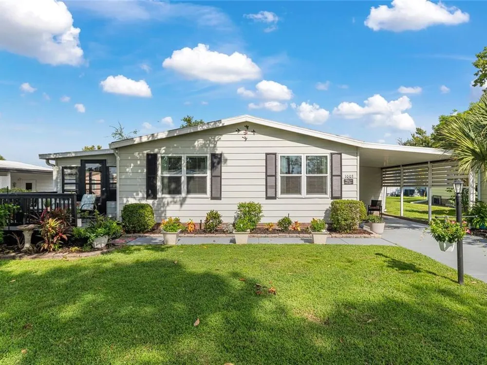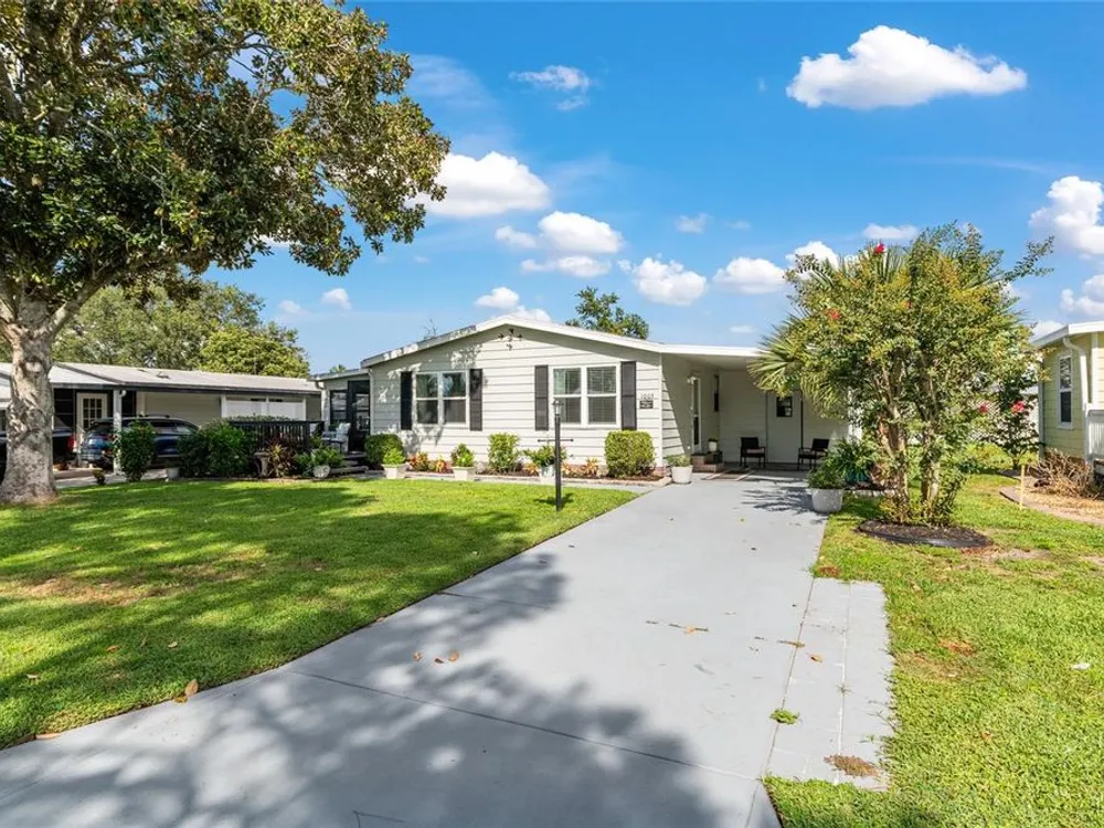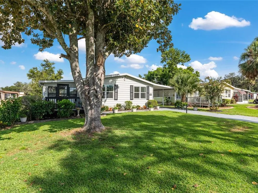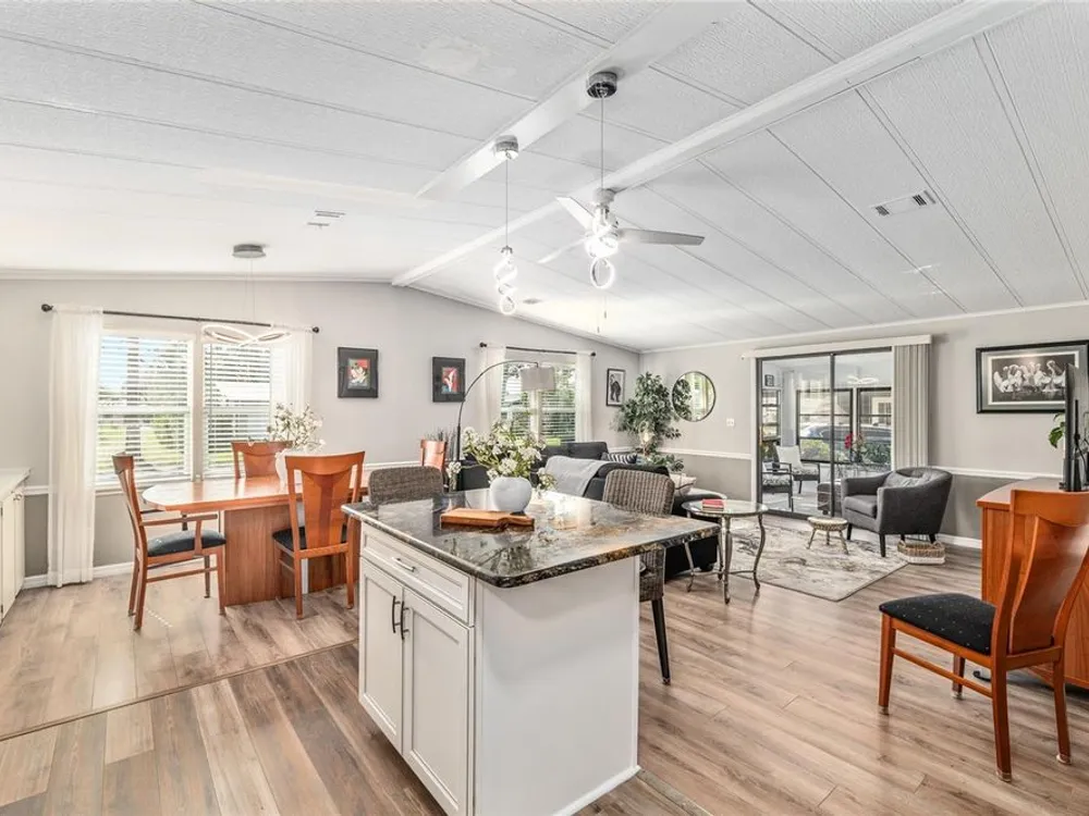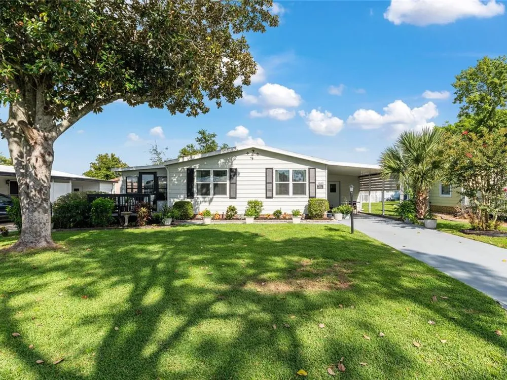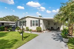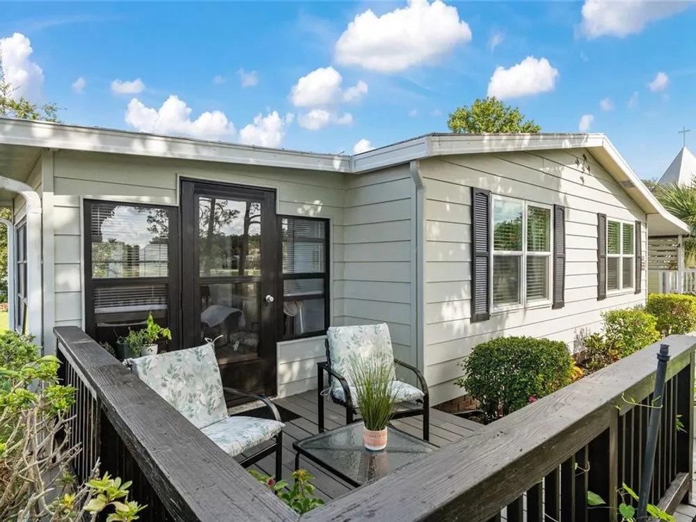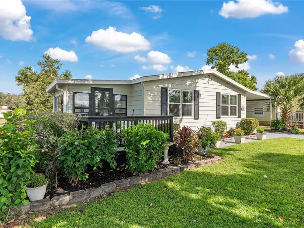 Welcome to this beautifully remodeled 2-bedroom, 2-bath manufactured home located in the desirable Village of Silver Lake, nestled within the historic side of The Villages. Every detail of this home has been thoughtfully updated to fresh, clean, and modern living. Step inside and immediately notice the stylish luxury vinyl plank (LVP) flooring (installed in 2021), paired with a sleek, modern kitchen featuring stainless steel appliances (2022), granite countertops, and contemporary sinks. A freshly painted interior (2023) creates a bright, inviting atmosphere, while new front windows (2025) bring in abundant natural light. The open-concept kitchen includes a large island perfect for casual meals, along with a separate dining area ideal for entertaining. The spacious living room and primary bedroom provide comfort and functionality, while the versatile guest bedroom includes a built-in Murphy bed—perfect for hosting or use as a home office. Enjoy your morning coffee or unwind in the evening on the lanai or front deck, which overlook a peaceful, park-like setting across the street, offering rare privacy and tranquil views.